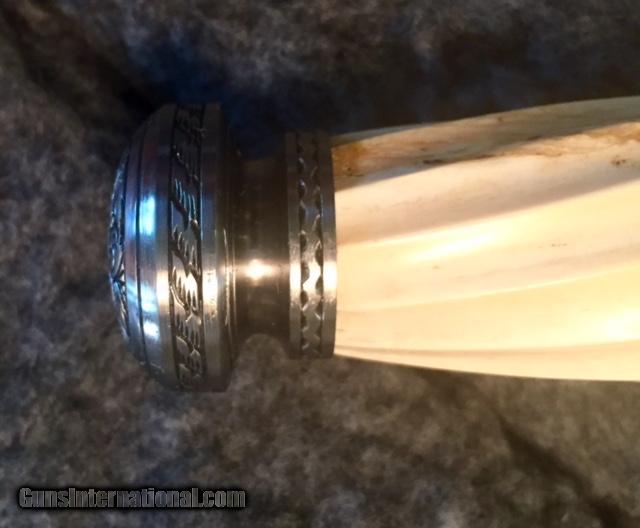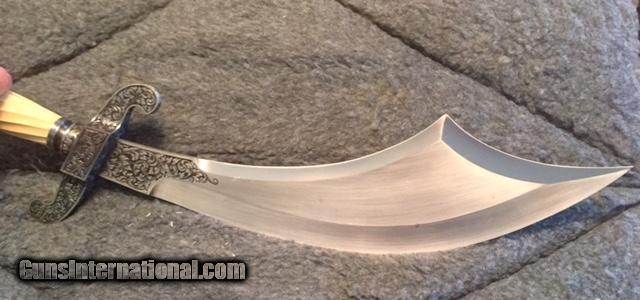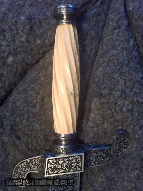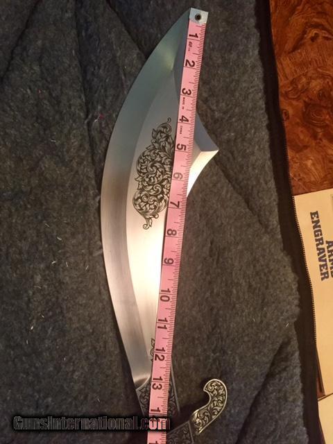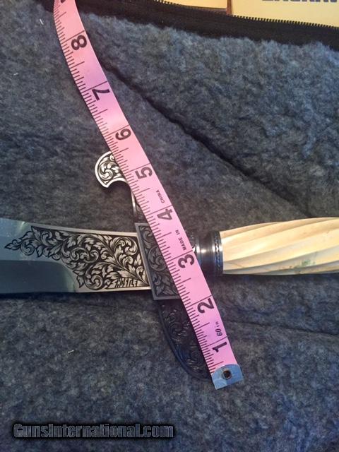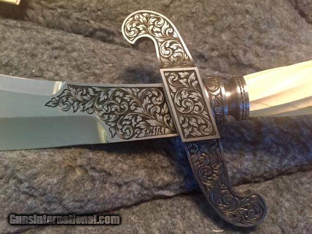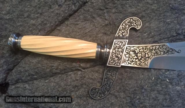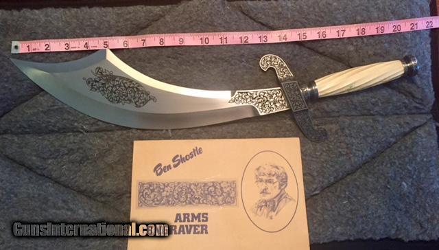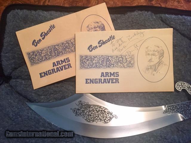 Description: Unusual and unique piece by Ben Shostle..a friend of my husbands for years. overall length 21"..blade lenght 14"..handle is 5 1/2 x 3/4 to 1"..top of knife has a engraved skull crusher.ingraving on both sides of knife... guard is engraved on all sides. handle is fluted .has a grain look running thru it so I cannot say for sure if this is stagg or ivory. Also I have 2 books with info about Ben..One of them says.."to my asshole buddy Bob" So you see..they were friends and I believe this is a special made knife that Ben did just for my husband. SOLD |