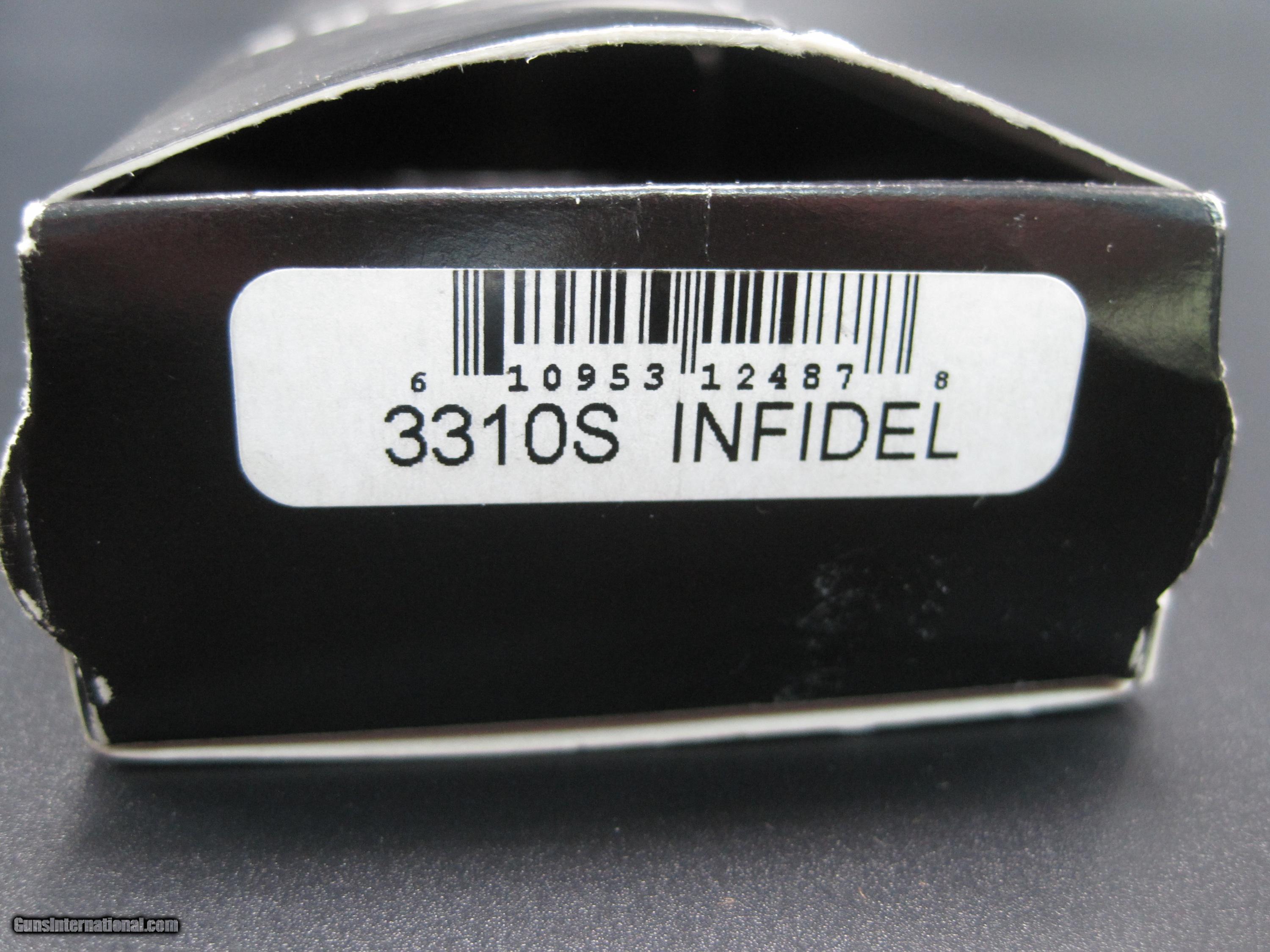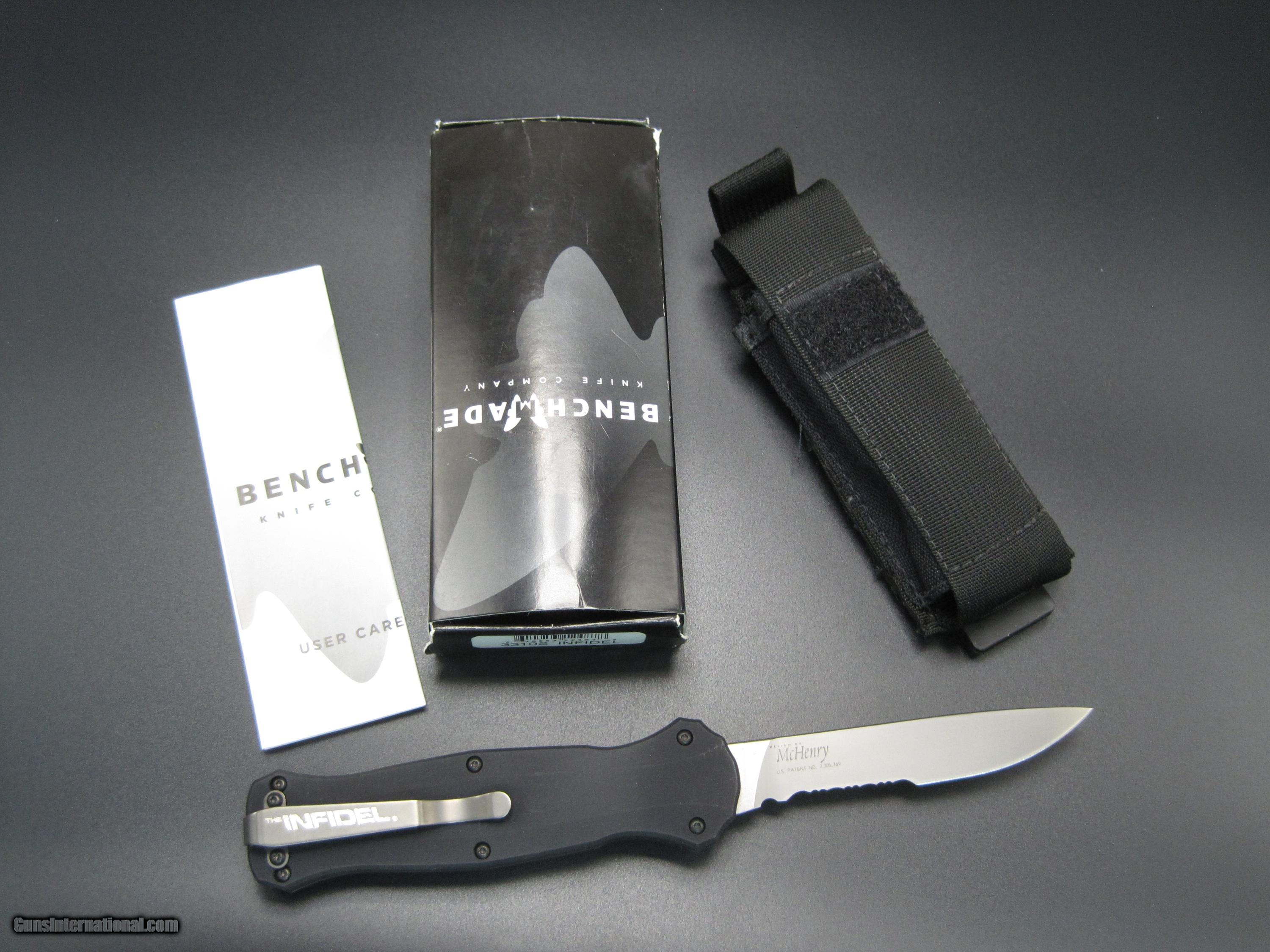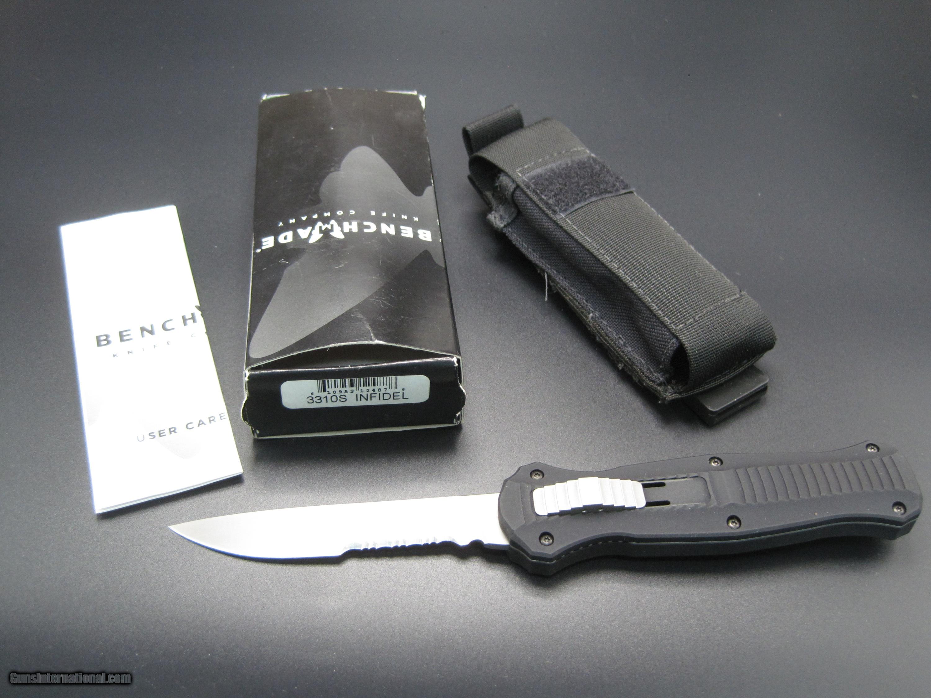 Description: CHRISTMAS SALE 10% off thru December 25 ! ? Benchmade Infidel 3310s Single edged OTF knife with S30V steel RARE ! The Infidel 3310 is a single-edged blade variant of the the very popular double edged Benchmade Infidel 3300. It incorporates all of the features of its predecessor while providing a slightly more utilitarian blade. The 3310 series is ambidextrous, being easily operable by both right and left handed users. The Infidel line is double action, meaning the knife both fires and retracts with the slide release on the front of the handle. The blade is S30V steel and is double ground (not chisel ground). The handle is black anodized T6 aluminum and has a deep pocket carry clip. This knife has a belt holder (black) that is included. It is new in box with paperwork SOLD |