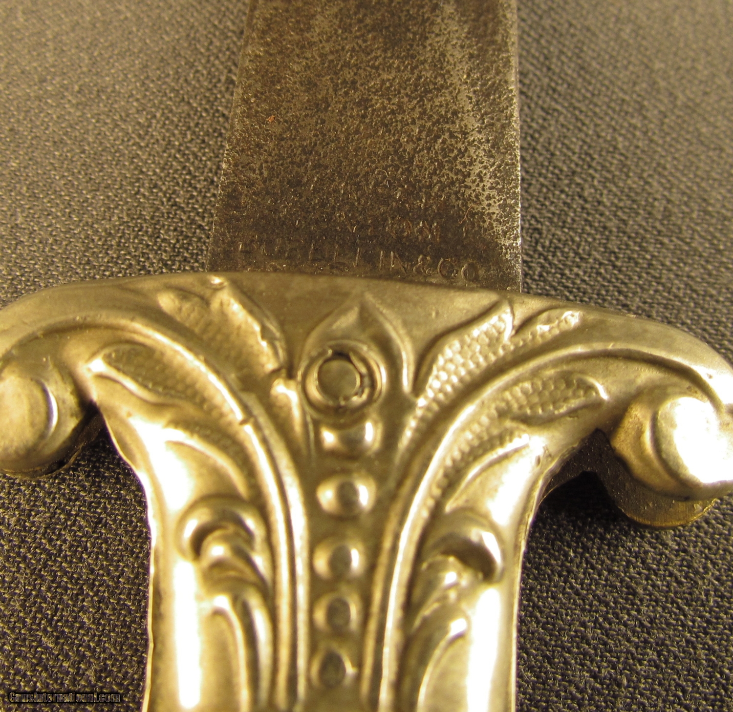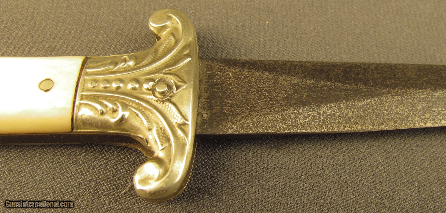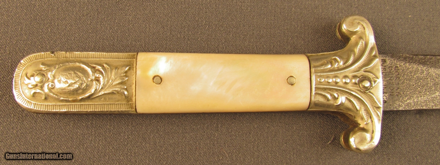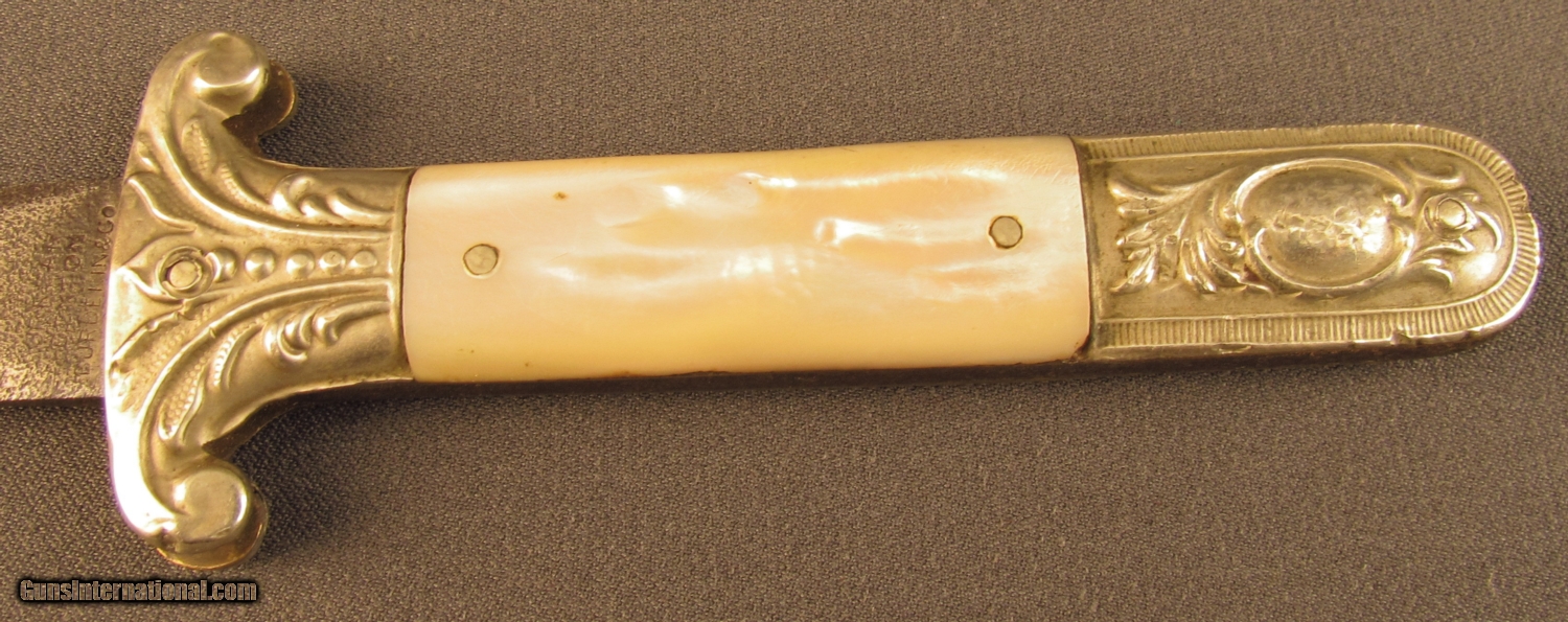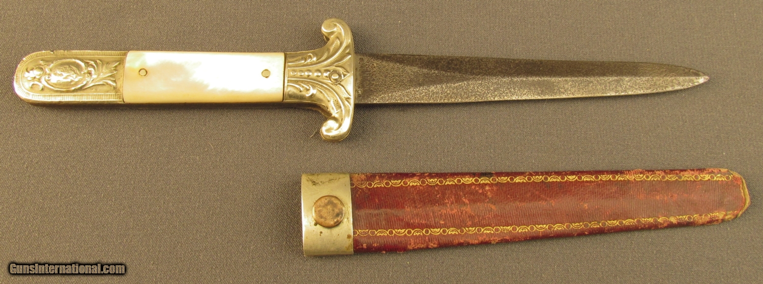 Description: This 8.5 inch double edged dagger features a 4.5 inch blade, German silver hardware and mother-of-pearl scales. Both sides of blade are marked with makers name; the company was in Derbyshire, England from 1852-1860. The blade is quite pitted with makers name visible on both sides, the German silver hardware shows great yellow-silver patina with dents and dings from use. Grips show wear and scratches. This comes in a sheath with German silver throat, missing tip, with red body showing gilt edge pattern. A very nice example of a British 1850's dirk equally at home in Whitechapple or on the Mississippi. SOLD Manufacturer: Corsan Model: Dagger |