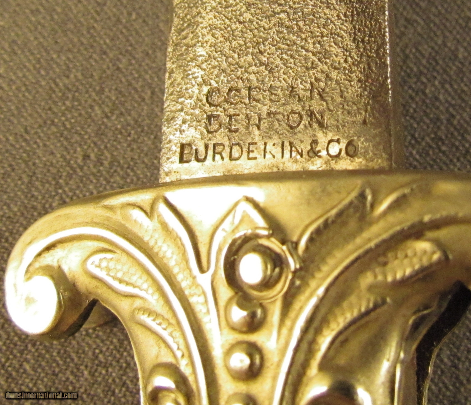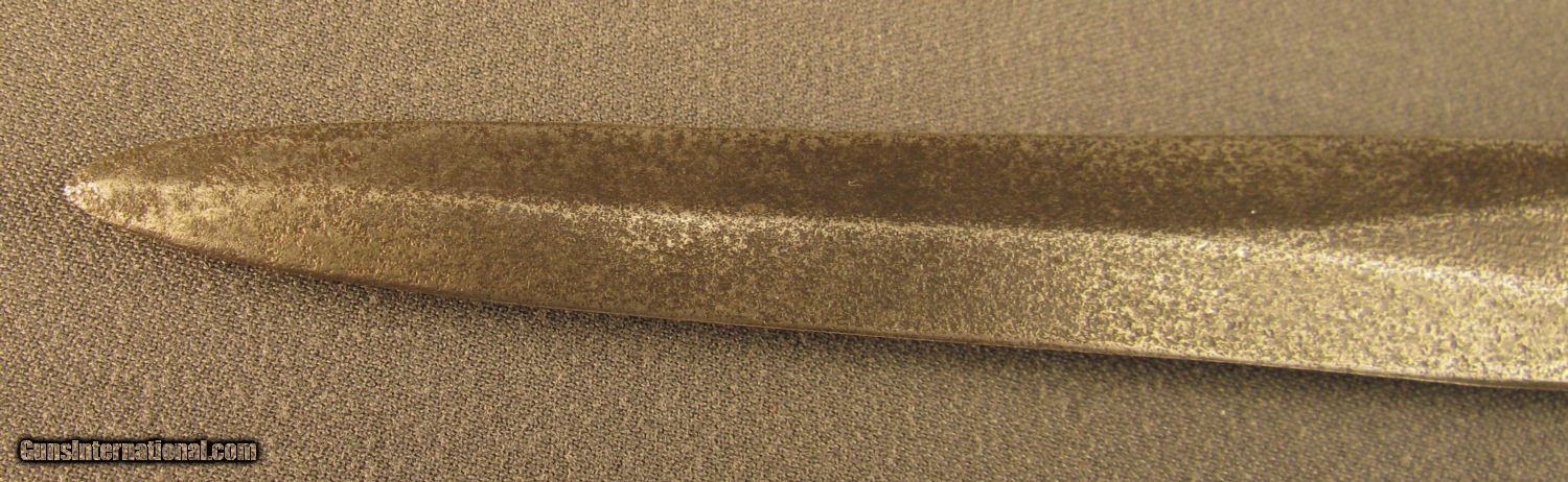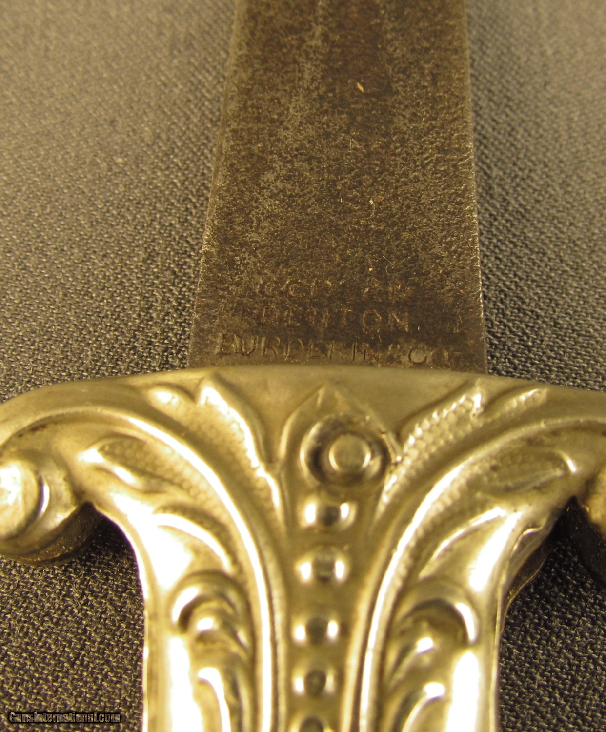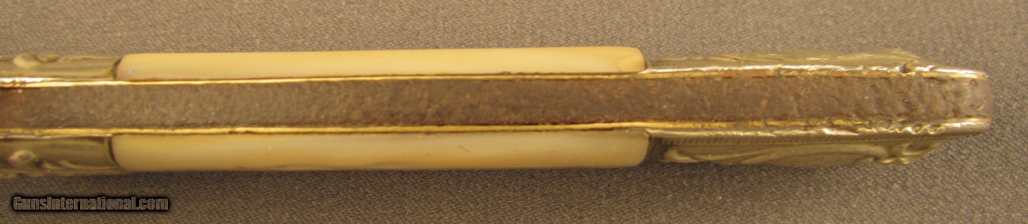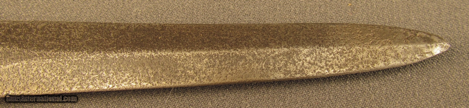 Description: This 8.5 inch double edged dagger features a 4.5 inch blade, German silver hardware and mother-of-pearl scales. Both sides of blade are marked with makers name; the company was in Derbyshire, England from 1852-1860. The blade is quite pitted with makers name visible on both sides, the German silver hardware shows great yellow-silver patina with dents and dings from use. Grips show wear and scratches. This comes in a sheath with German silver throat, missing tip, with red body showing gilt edge pattern. A very nice example of a British 1850's dirk equally at home in Whitechapple or on the Mississippi. SOLD Manufacturer: Corsan Model: Dagger |