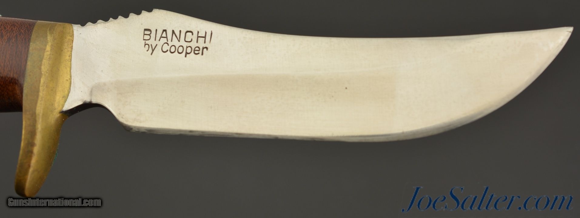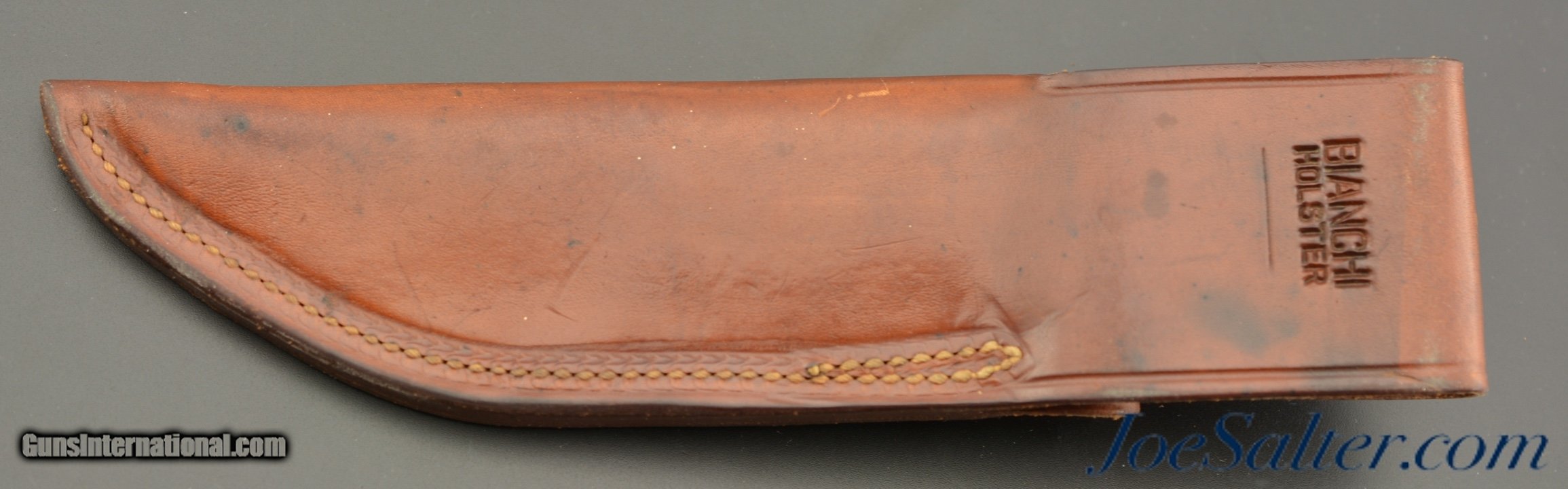 Description: This is a Bianchi Bowie by John N. Cooper features a satin finished 5 1/2" clip point blade with false top edge, .236" blade stock and 1.46" blade depth, hidden tang construction. The handle has brass guard and butt cap, guard has a tiny bit of verdigris with brown canvas micarta grip and spacers in the center. Light scuffs and scratches are visible otherwise the knife is in excellent condition. Includes excellent original "Bianchi Holsters" brown leather sheath with tight stitching and nice patina. SOLD |