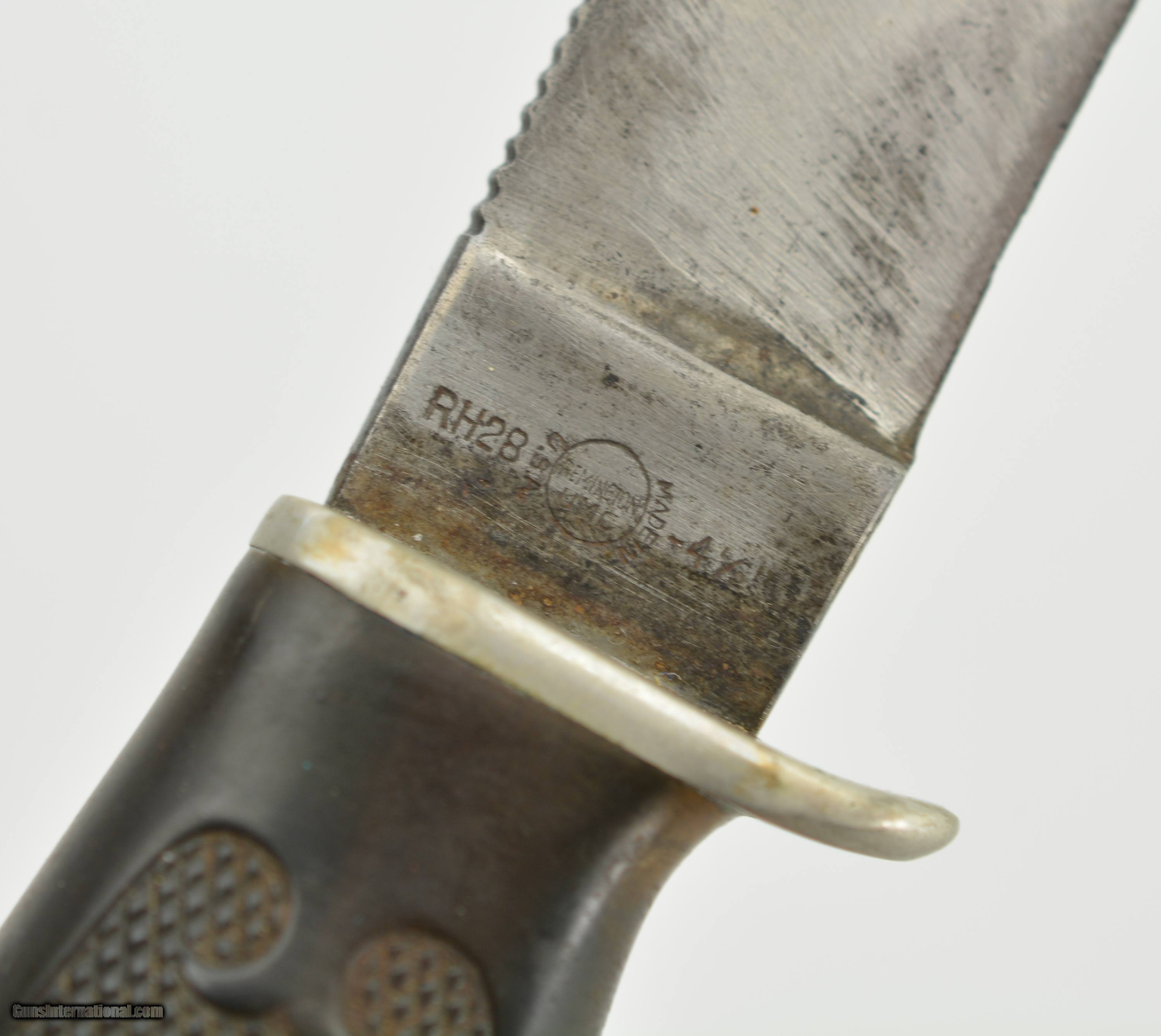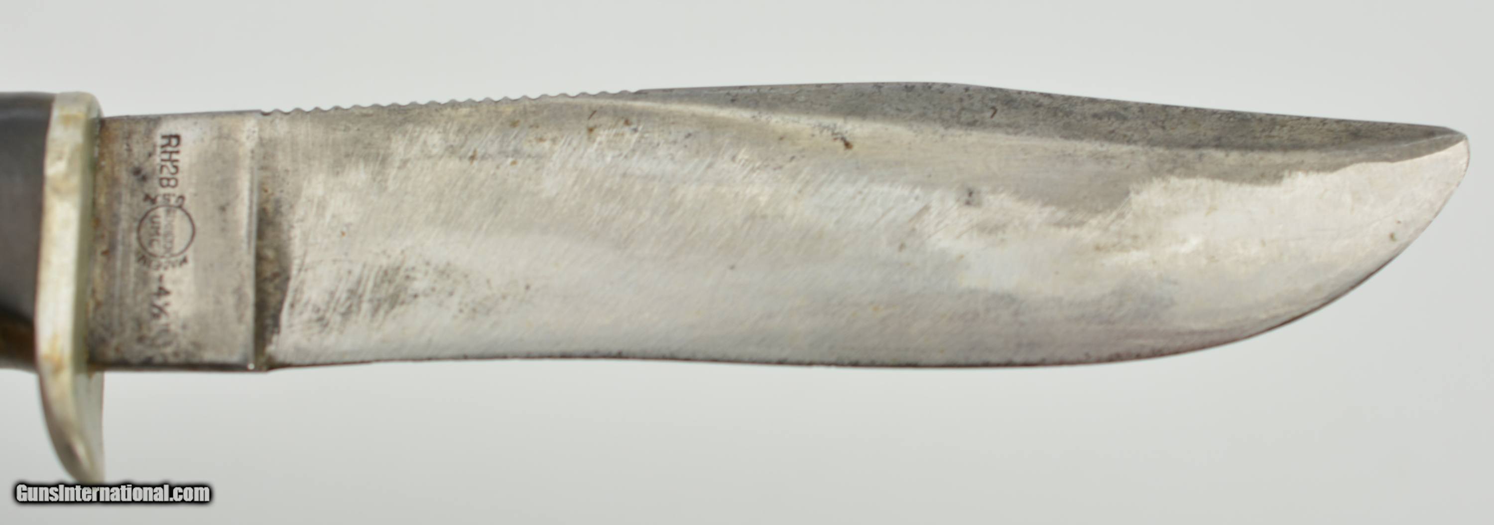 Description: This is an early Remington UMC “RH28 4 1/2" Hunting knife with a hard rubber grip that has the logo in the center. This knife measures 8 1/4" overall with a 4 1/4" blade that has been sharpened, shortened and cleaned. The grip is in excellent condition and smoothed with wear. The original Remington UMC leather sheath is very good with sound stitching and Rem UMC snap closure. A very nice used but cared for knife. SOLD Manufacturer: Remington Model: Knife |