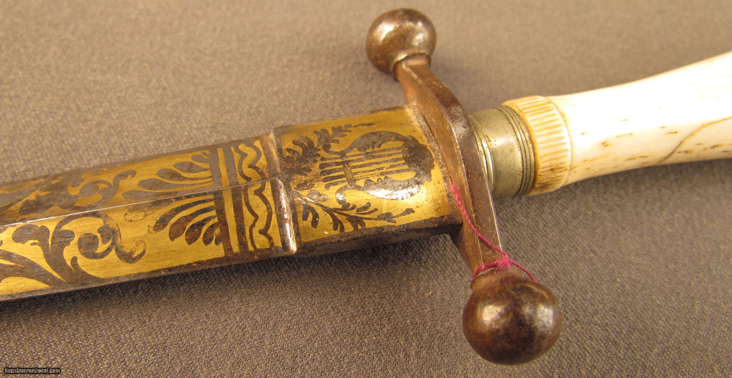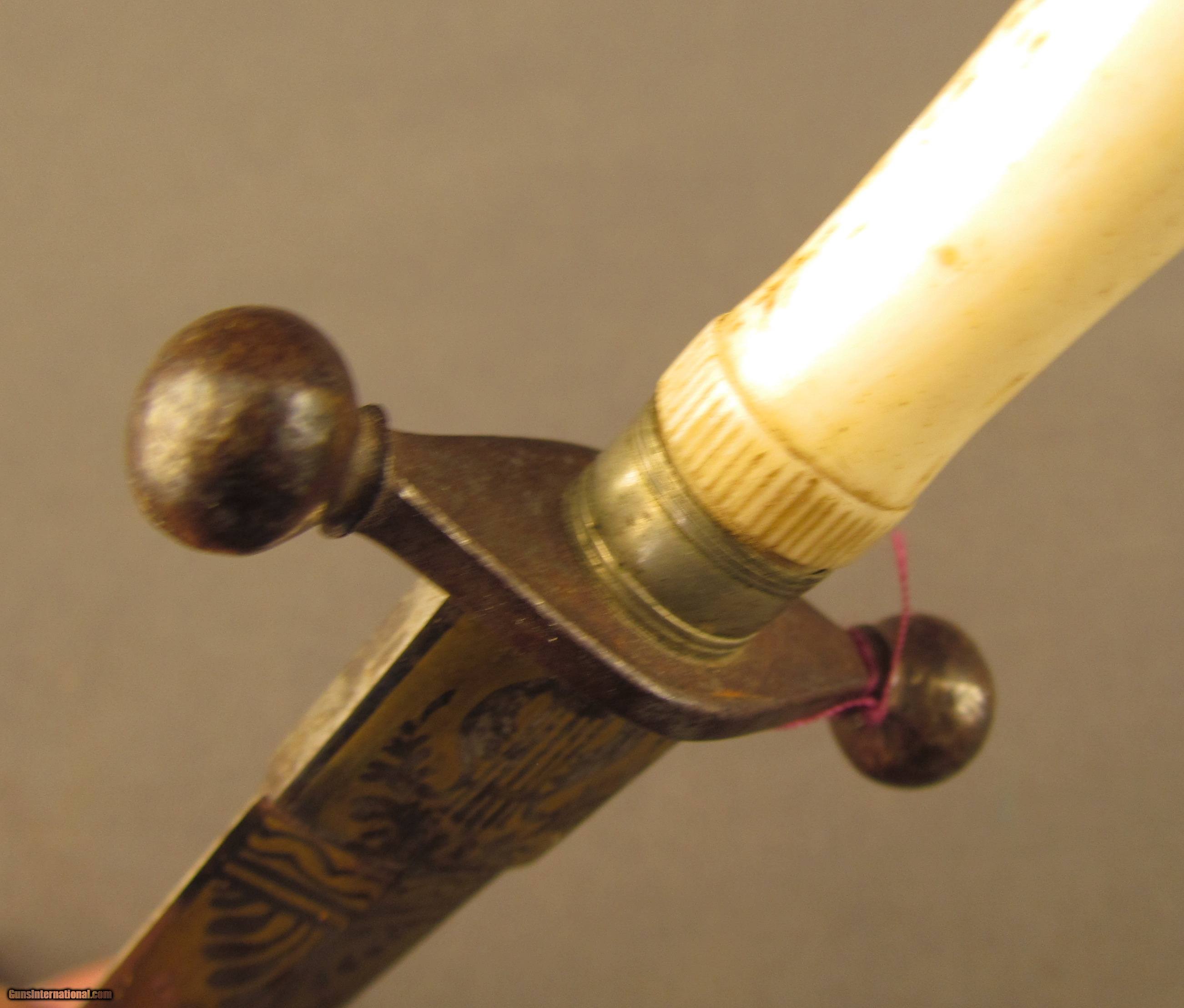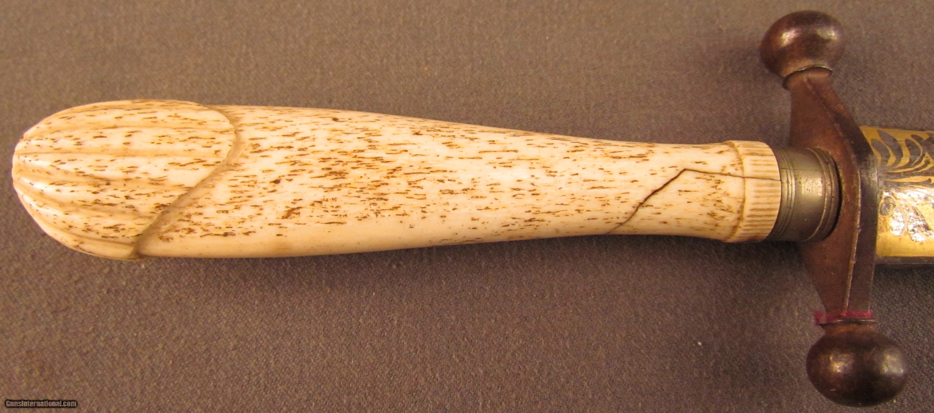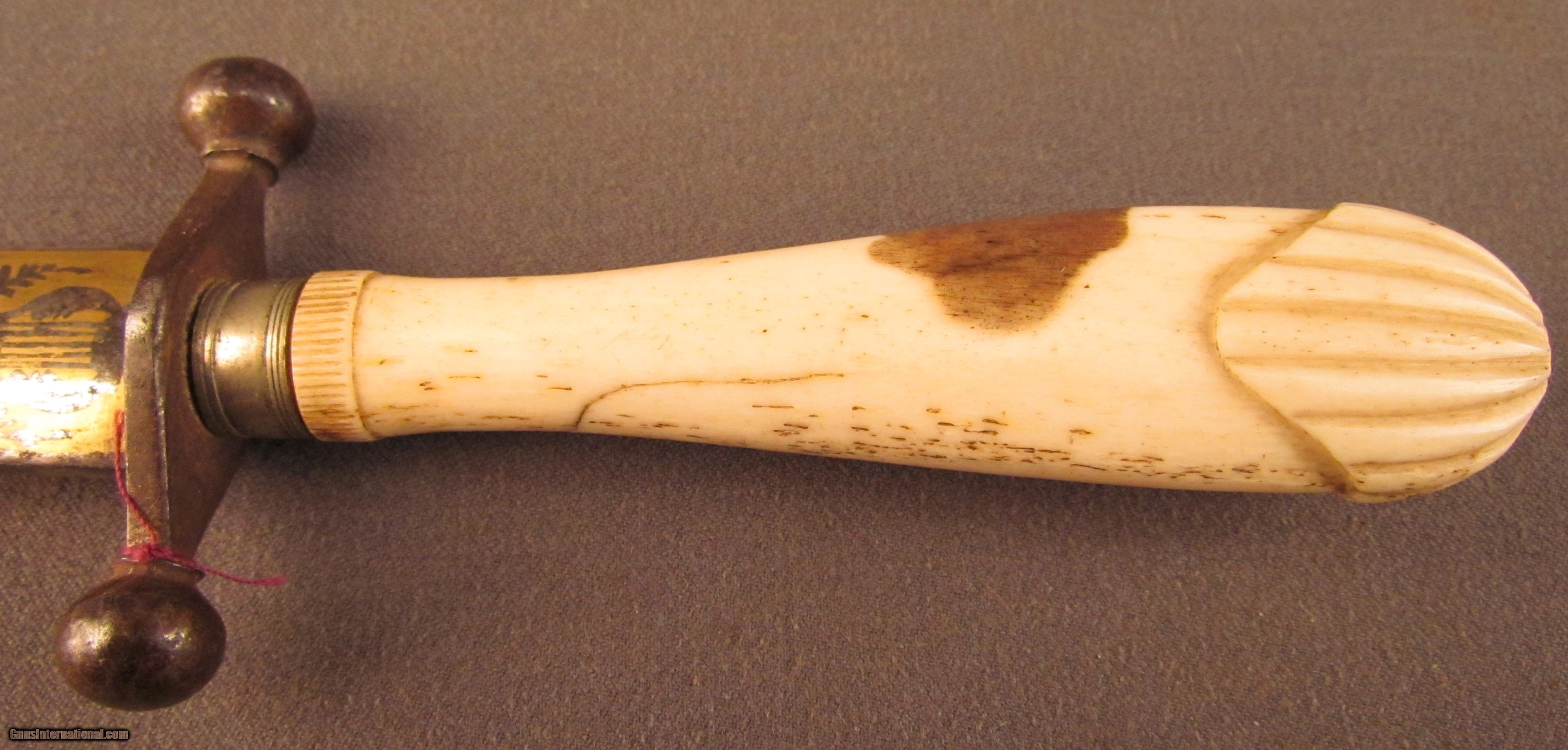 Description: This is a handsome little knife that measures 8 1/2" overall with a 4 5/8" straight, double-edged blade with high central ridges and full-length etched panels. The etched panels have about 90-92% of the original gold wash remaining with floral scrollwork motifs on either side of the blade, and a lyre on one side of the ricasso, a bunch of flowers on the other. The simple crossguard has short, straight quillons with dark brown freckling that carries over onto the ball-shaped quillons, and the tapered bone grip is intact, with a carved scallop motif at butt. There is a stable, irregular crack running down from the grip ferrule, and a spot of ink or some other dark liquid that has darkened a spot near the carving. The leather scabbard has a heavily flaked exterior with some wear at the open tip, and the German silver throat is present, but loose. This is an attractive and well made little dagger, probably French in origin, and would make a great addition to any collection. SOLD Manufacturer: French Model: Dirk |