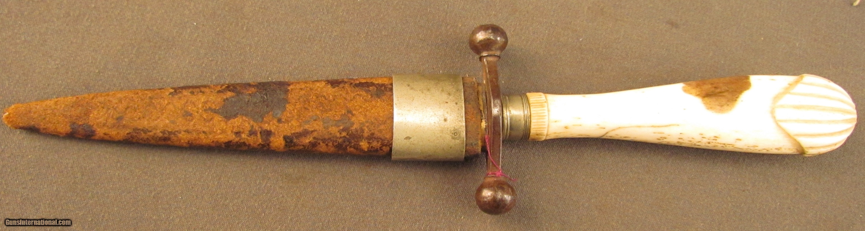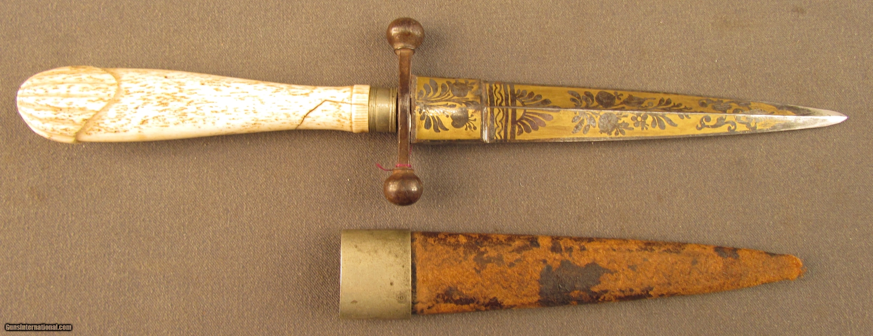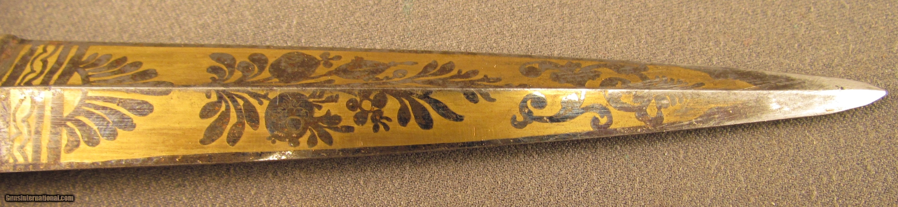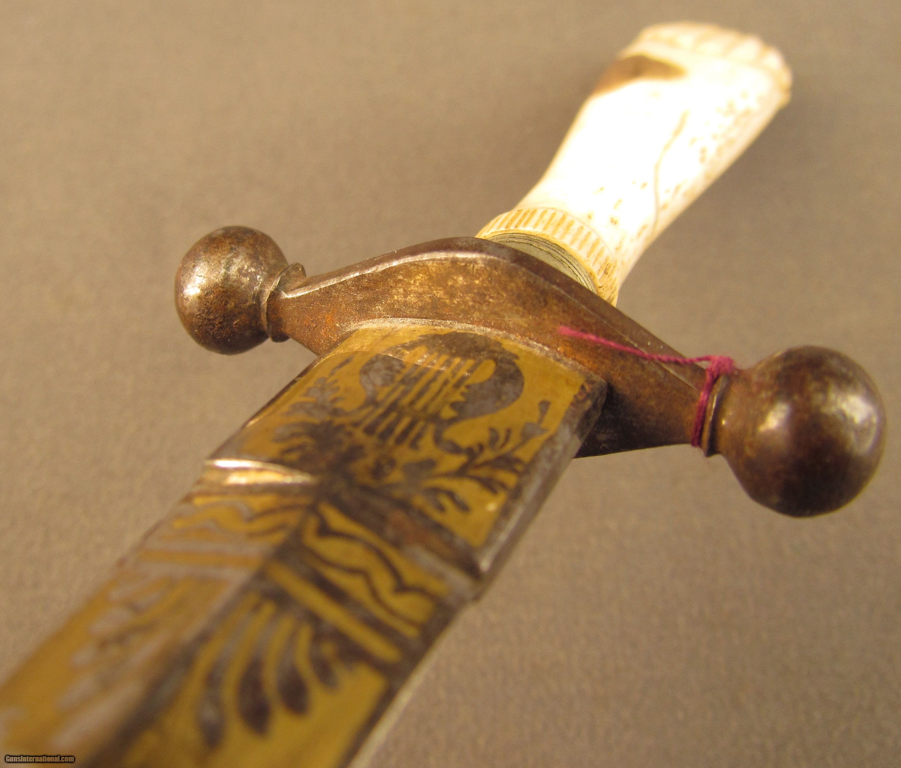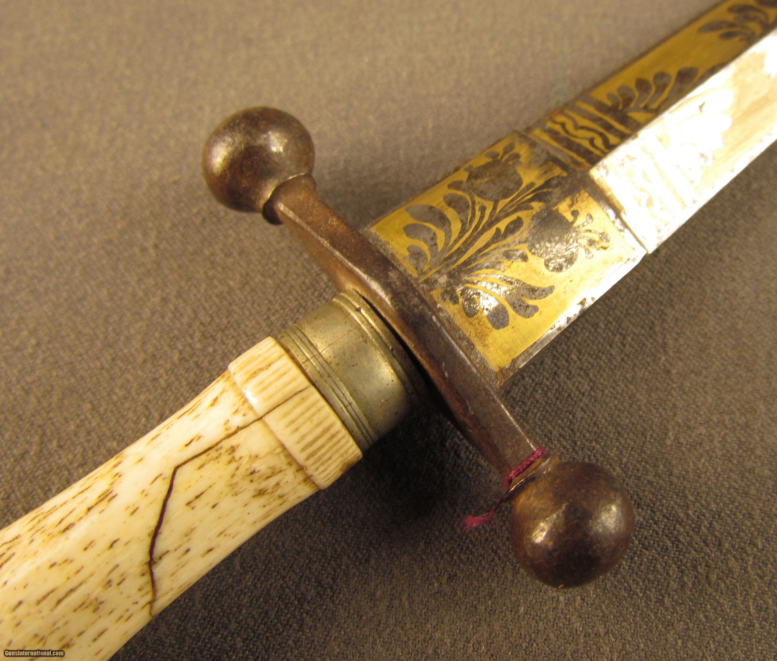 Description: This is a handsome little knife that measures 8 1/2" overall with a 4 5/8" straight, double-edged blade with high central ridges and full-length etched panels. The etched panels have about 90-92% of the original gold wash remaining with floral scrollwork motifs on either side of the blade, and a lyre on one side of the ricasso, a bunch of flowers on the other. The simple crossguard has short, straight quillons with dark brown freckling that carries over onto the ball-shaped quillons, and the tapered bone grip is intact, with a carved scallop motif at butt. There is a stable, irregular crack running down from the grip ferrule, and a spot of ink or some other dark liquid that has darkened a spot near the carving. The leather scabbard has a heavily flaked exterior with some wear at the open tip, and the German silver throat is present, but loose. This is an attractive and well made little dagger, probably French in origin, and would make a great addition to any collection. SOLD Manufacturer: French Model: Dirk |