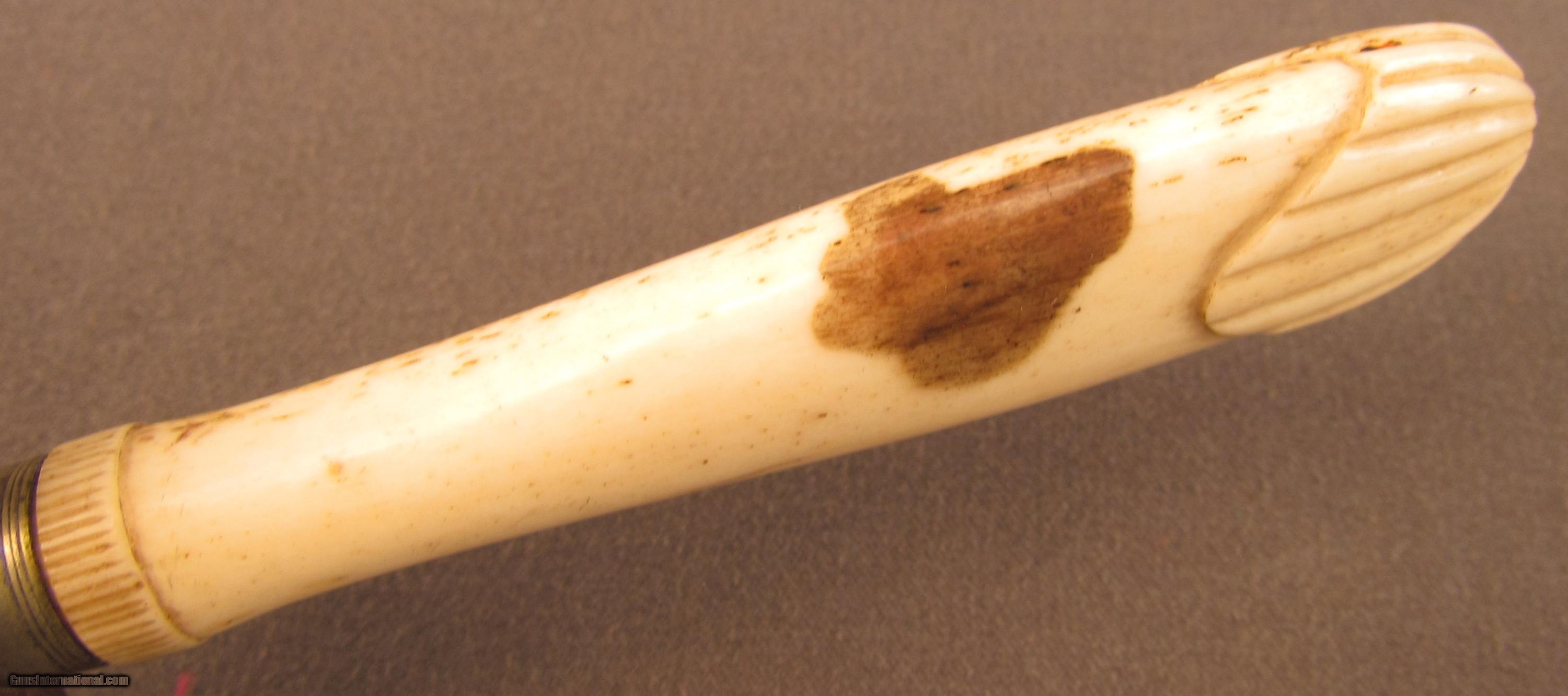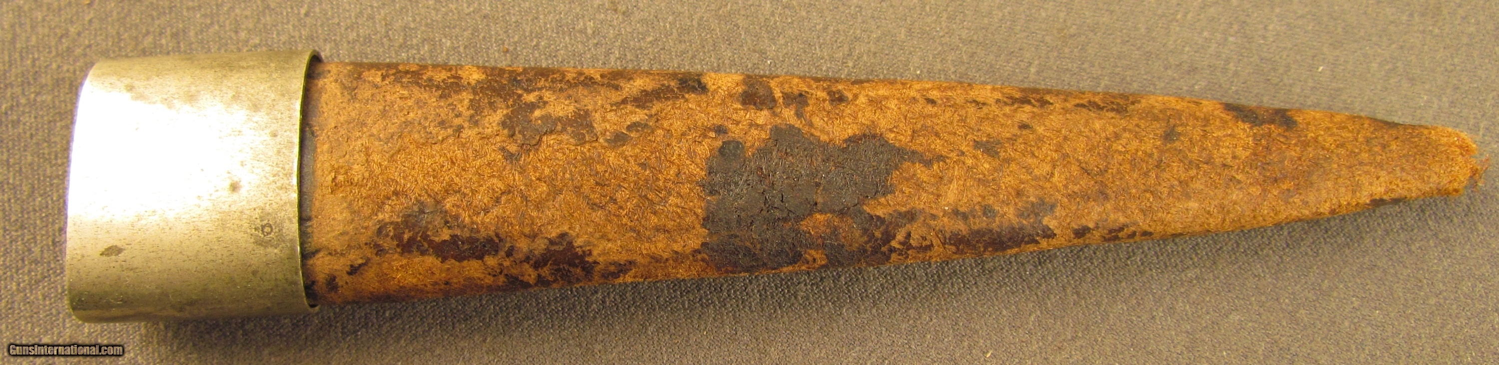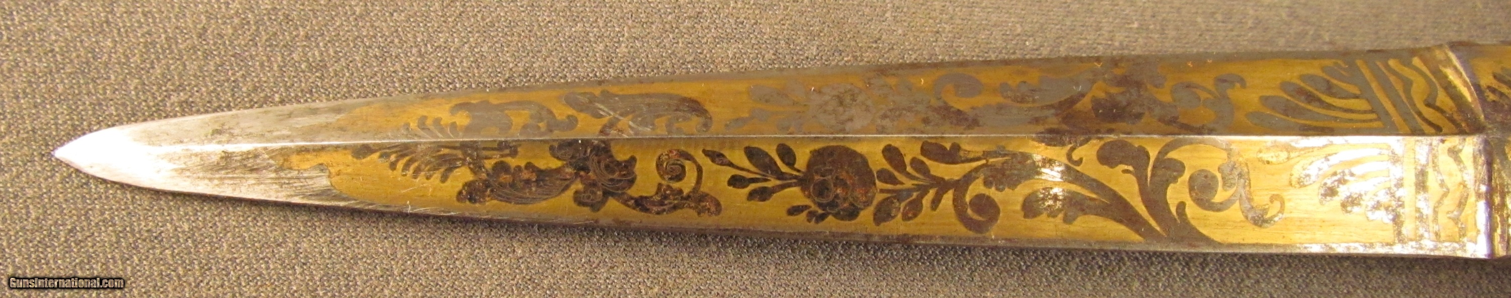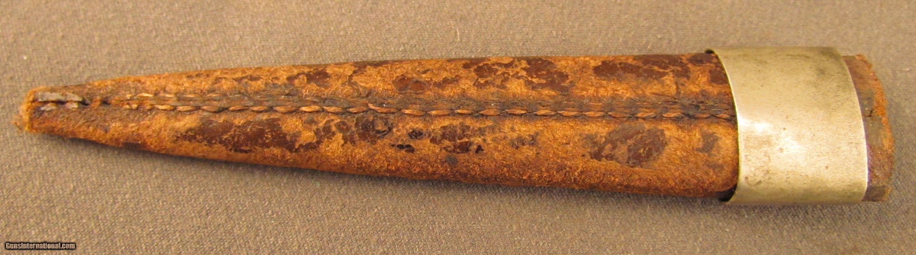 Description: This is a handsome little knife that measures 8 1/2" overall with a 4 5/8" straight, double-edged blade with high central ridges and full-length etched panels. The etched panels have about 90-92% of the original gold wash remaining with floral scrollwork motifs on either side of the blade, and a lyre on one side of the ricasso, a bunch of flowers on the other. The simple crossguard has short, straight quillons with dark brown freckling that carries over onto the ball-shaped quillons, and the tapered bone grip is intact, with a carved scallop motif at butt. There is a stable, irregular crack running down from the grip ferrule, and a spot of ink or some other dark liquid that has darkened a spot near the carving. The leather scabbard has a heavily flaked exterior with some wear at the open tip, and the German silver throat is present, but loose. This is an attractive and well made little dagger, probably French in origin, and would make a great addition to any collection. SOLD Manufacturer: French Model: Dirk |