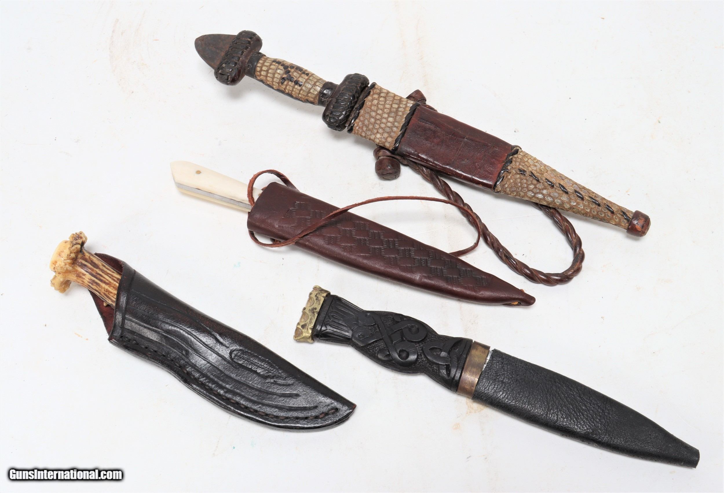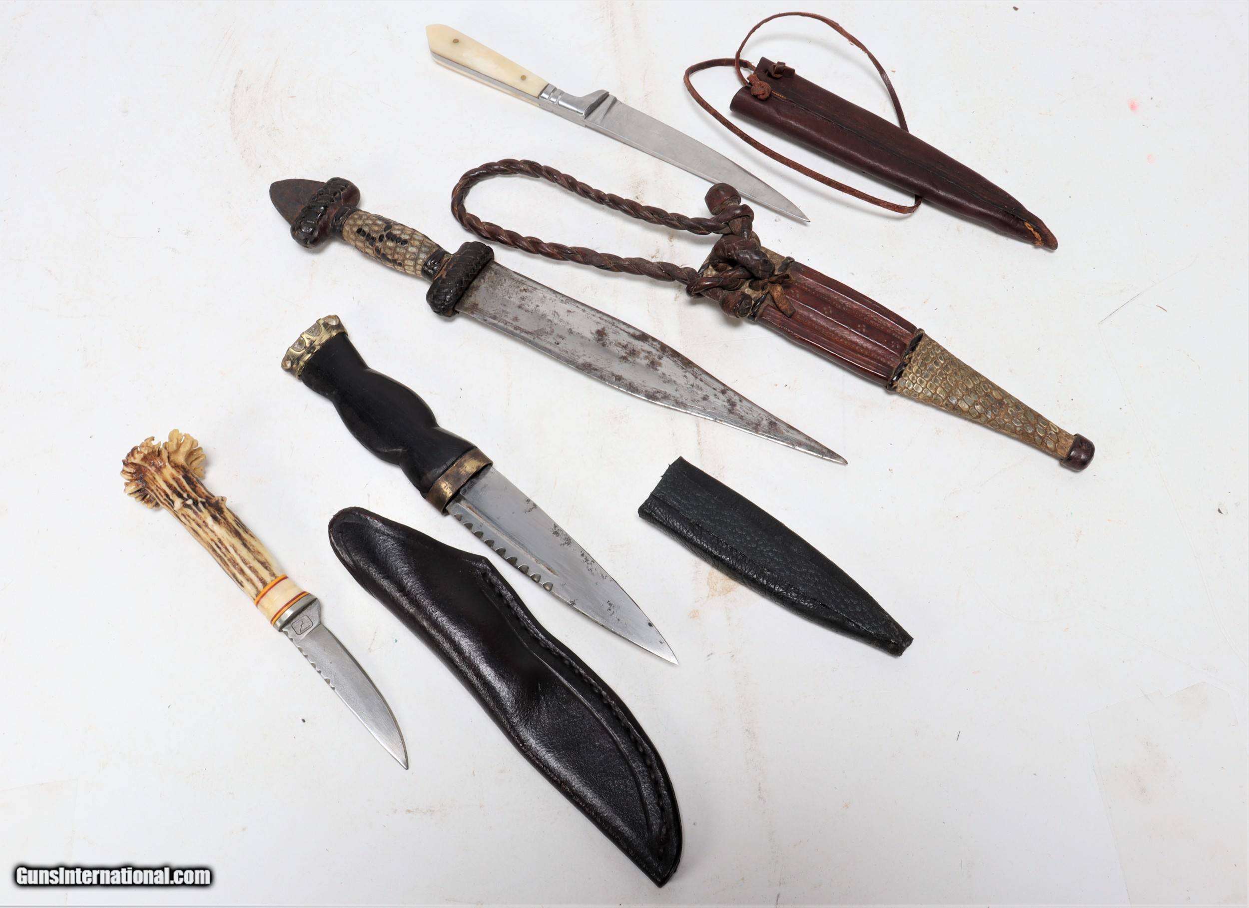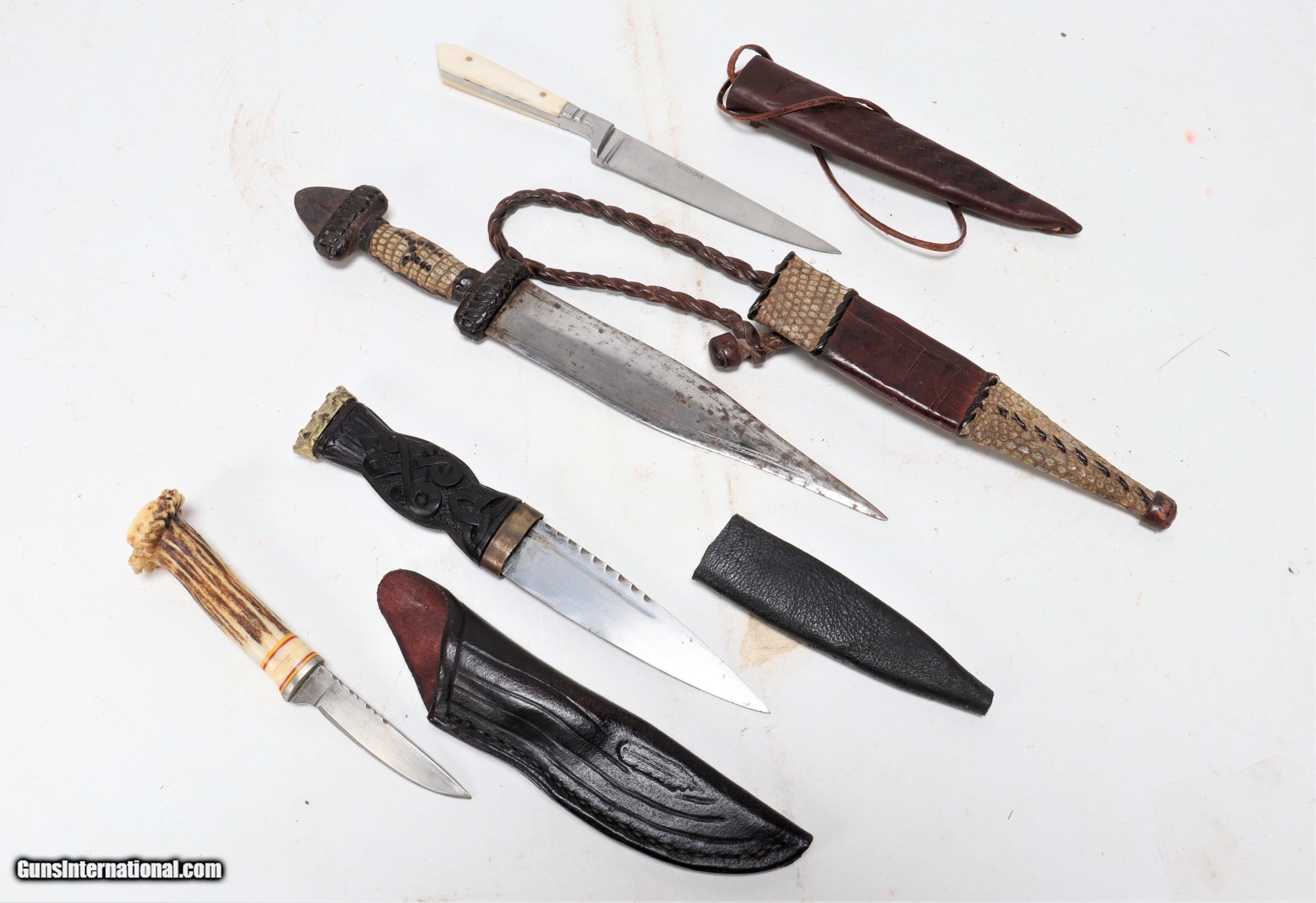 Description: Four small knives. All fixed blade, all with different handles and blade styles. First knife having a Mexican snakeskin and leather handle with matching sheath. Second knife having a faux bone handle with braided leather sheath, marked "Pakistan." Third knife is a dirk style blade with carved Celtic knots in handle, brass guard and butt, serrated edge to lower portion of blade, and simple leather sheath. Fourth knife is smallest, with a faux antler handle, with red and orange striping. Blade is straight, with slight serration on lower portion. Maker's marked "Z". Size: Longest blade 5 1/4", shortest 2 3/4" Family Owned & Operated Cisco’s Gallery deals in the rare, exceptional, and one-of-a-kind pieces that define the history of America and the Old West. Our pieces range from American Indian to Cowboy Western and include original items of everyday life, commerce, art, and warfare that tamed America’s frontier. Our 14,000 square foot gallery opened in 1996 in beautiful Coeur d’Alene, Idaho. Personal Service Cisco’s operates on old fashioned values – honesty and integrity, and all of our items are backed by our money back guarantee. We appreciate the opportunity to earn your business. Whether you desire assistance with a jewelry purchase, choosing a gift, identification, or even selling – we hope to be your trusted source. SOLD |