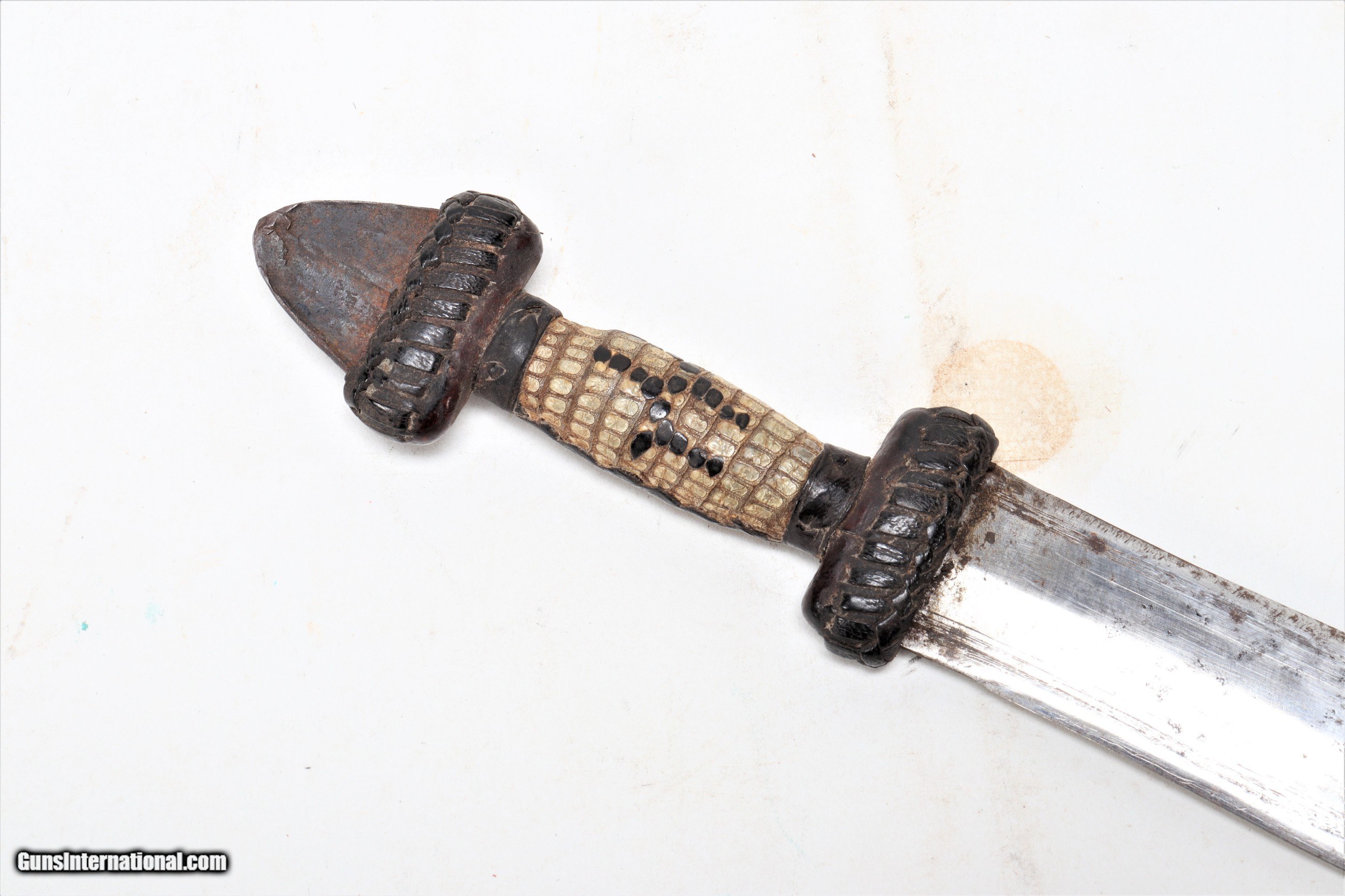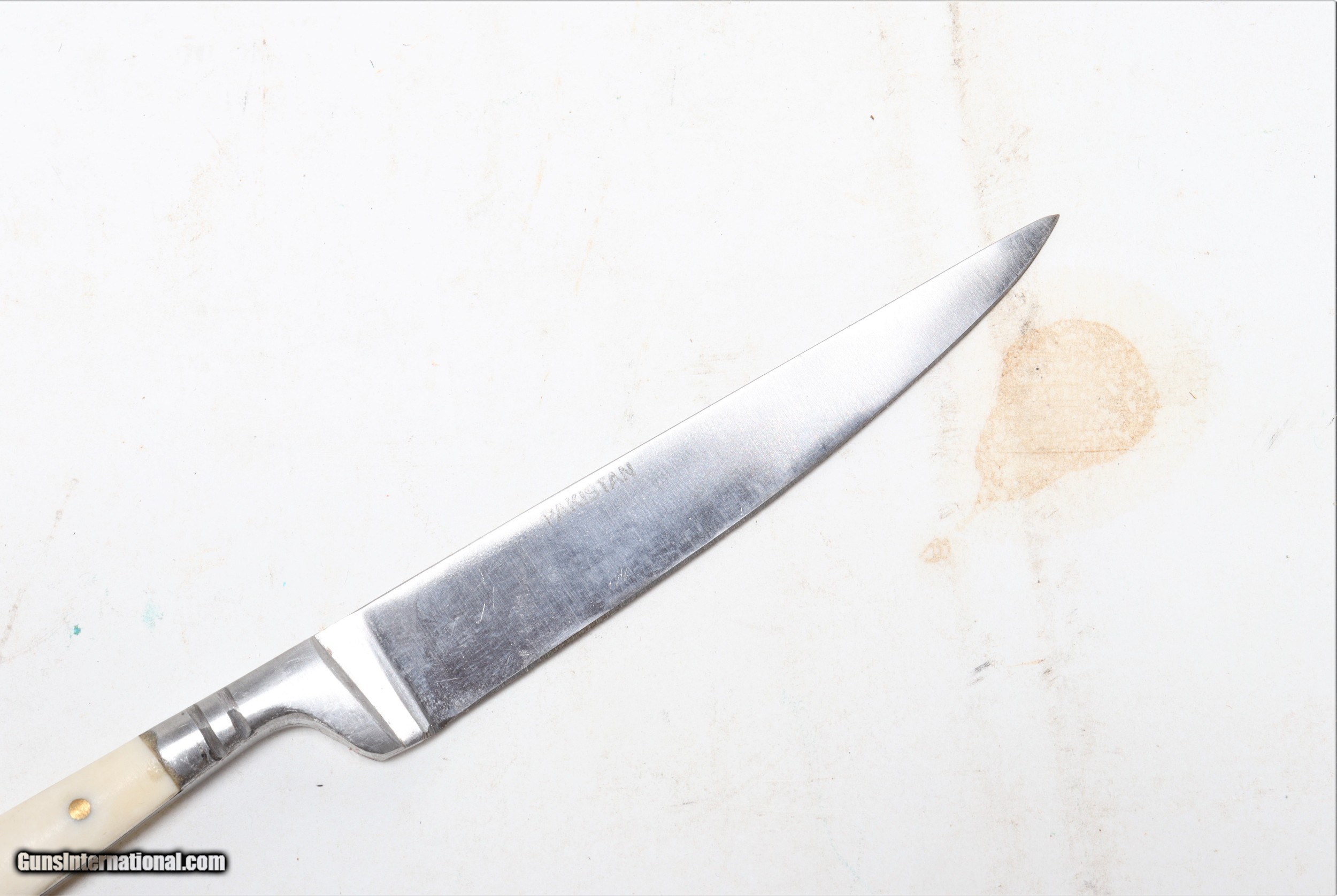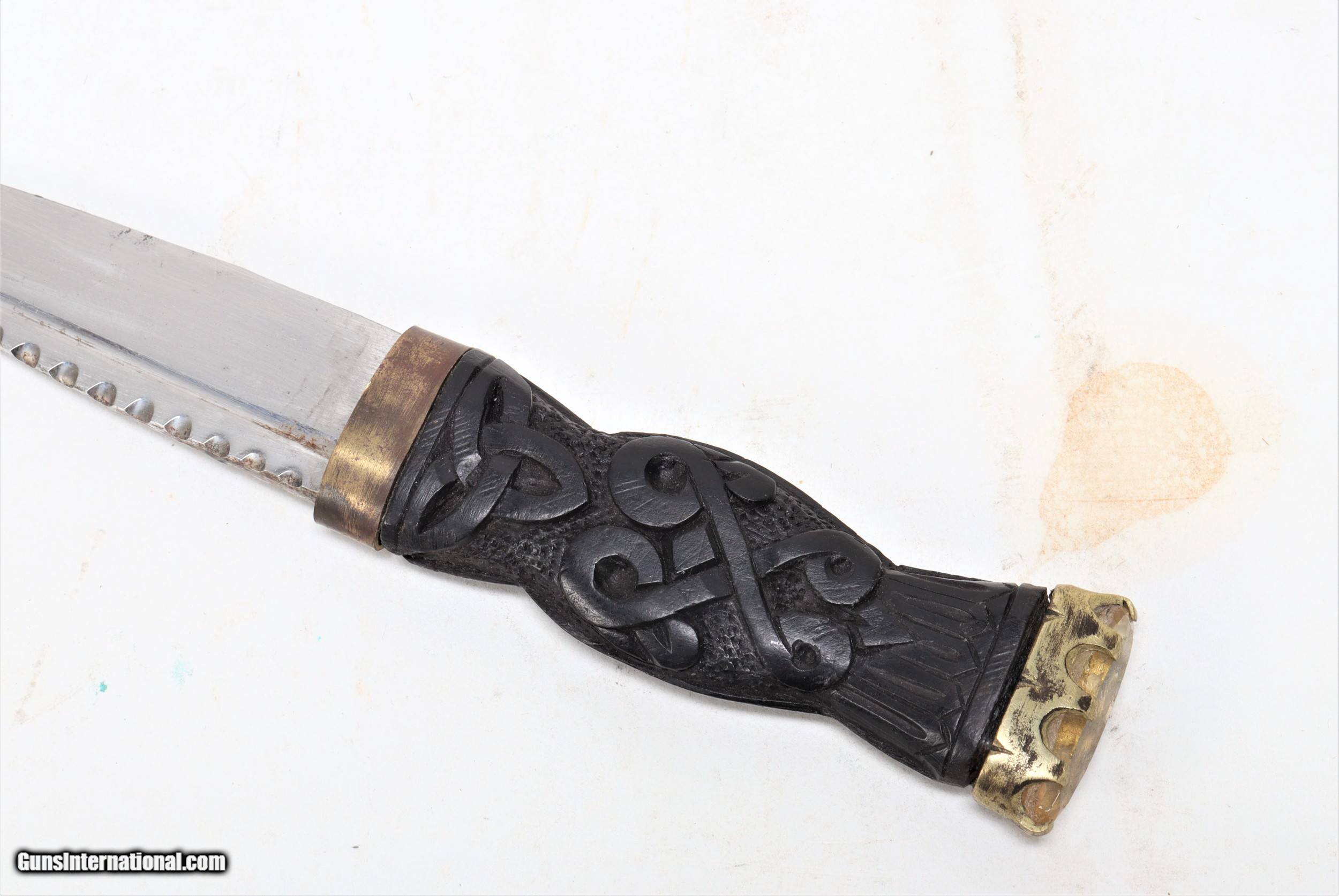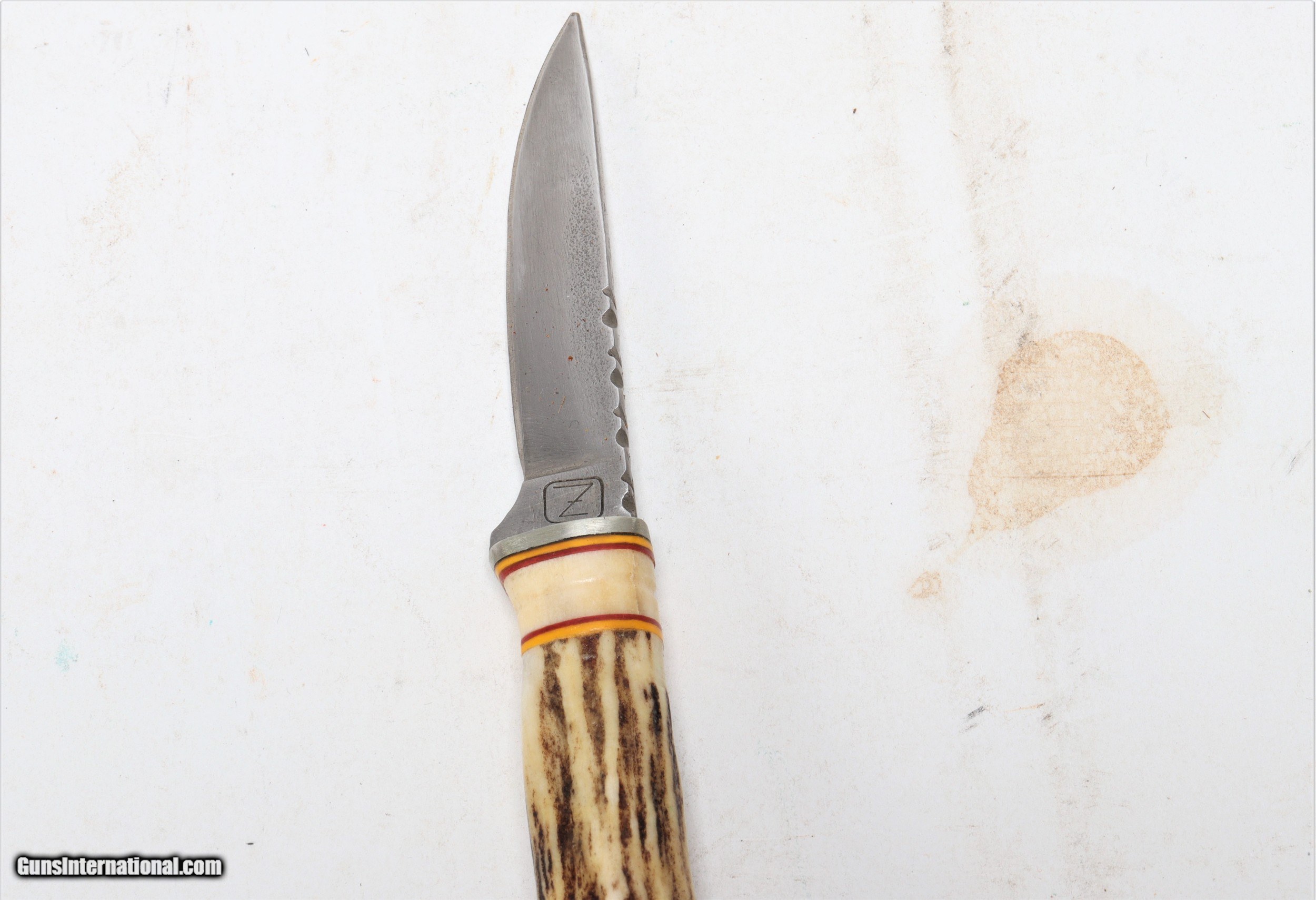 Description: Four small knives. All fixed blade, all with different handles and blade styles. First knife having a Mexican snakeskin and leather handle with matching sheath. Second knife having a faux bone handle with braided leather sheath, marked "Pakistan." Third knife is a dirk style blade with carved Celtic knots in handle, brass guard and butt, serrated edge to lower portion of blade, and simple leather sheath. Fourth knife is smallest, with a faux antler handle, with red and orange striping. Blade is straight, with slight serration on lower portion. Maker's marked "Z". Size: Longest blade 5 1/4", shortest 2 3/4" Family Owned & Operated Cisco’s Gallery deals in the rare, exceptional, and one-of-a-kind pieces that define the history of America and the Old West. Our pieces range from American Indian to Cowboy Western and include original items of everyday life, commerce, art, and warfare that tamed America’s frontier. Our 14,000 square foot gallery opened in 1996 in beautiful Coeur d’Alene, Idaho. Personal Service Cisco’s operates on old fashioned values – honesty and integrity, and all of our items are backed by our money back guarantee. We appreciate the opportunity to earn your business. Whether you desire assistance with a jewelry purchase, choosing a gift, identification, or even selling – we hope to be your trusted source. SOLD |