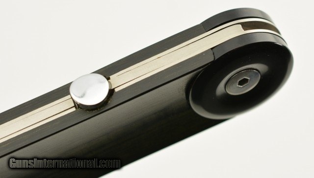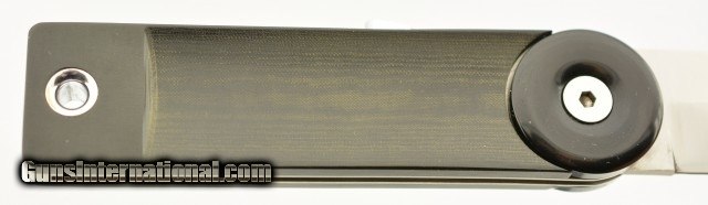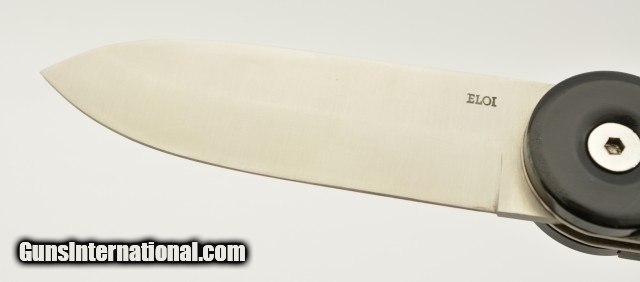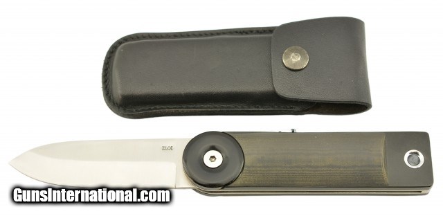 Description: This is a fine example of a Eloi Pernet Lockback Knife, these are rare and do not come up often for sale. The excellent 3 1/2" factory edged, spear point blade is labeled ELOI and has a crisp snap. The handle has stylish black rotating bolsters, beautiful Micarta scales, stainless liners and backspacer. Has a highly polished button on spine to unlock the blade. Over all condition is excellent with only a few light scratches on the handling and appears to never have been used. The knife is accompanied by a nicely made fine leather factory case. SOLD |