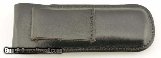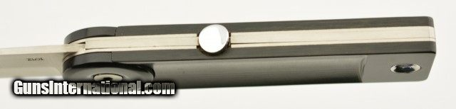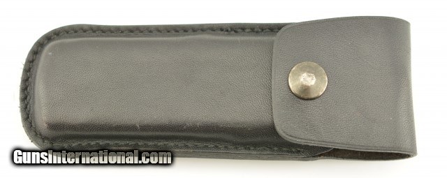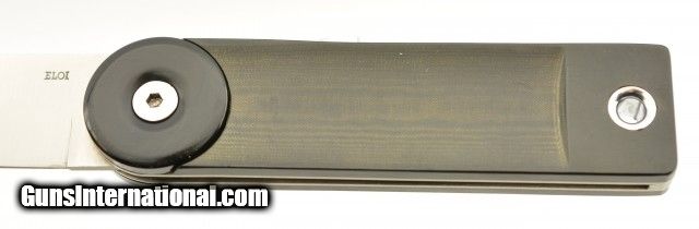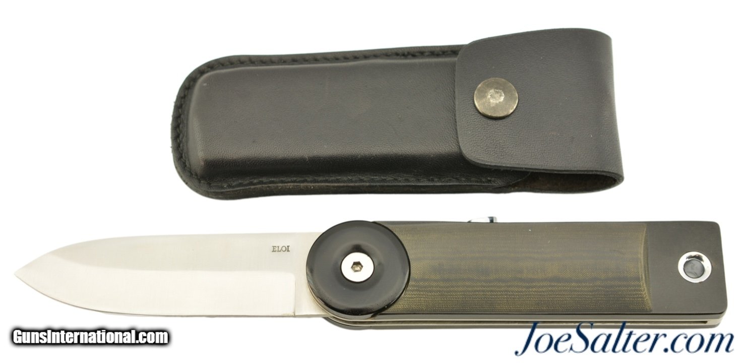 Description: This is a fine example of a Eloi Pernet Lockback Knife, these are rare and do not come up often for sale. The excellent 3 1/2" factory edged, spear point blade is labeled ELOI and has a crisp snap. The handle has stylish black rotating bolsters, beautiful Micarta scales, stainless liners and backspacer. Has a highly polished button on spine to unlock the blade. Over all condition is excellent with only a few light scratches on the handling and appears to never have been used. The knife is accompanied by a nicely made fine leather factory case. SOLD |