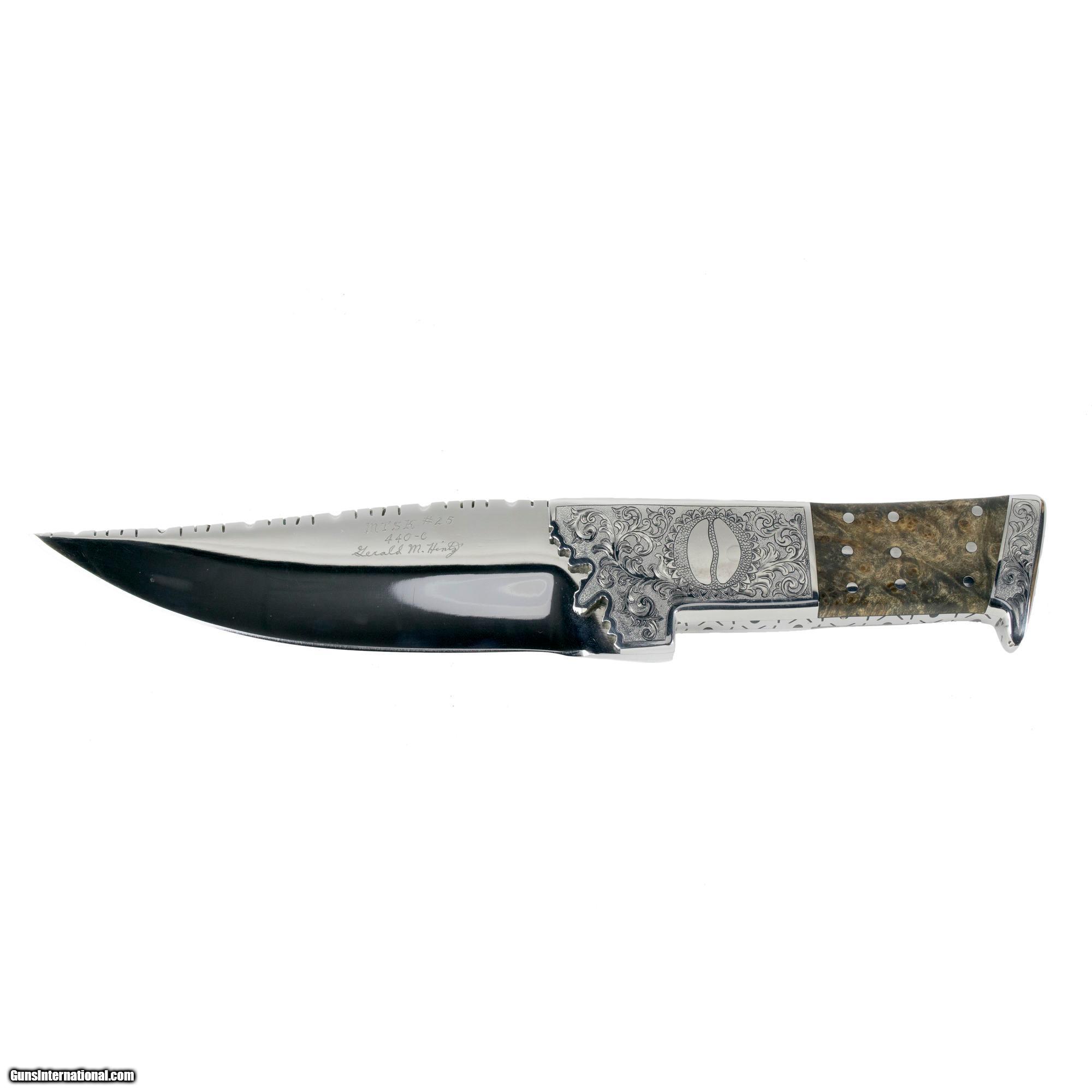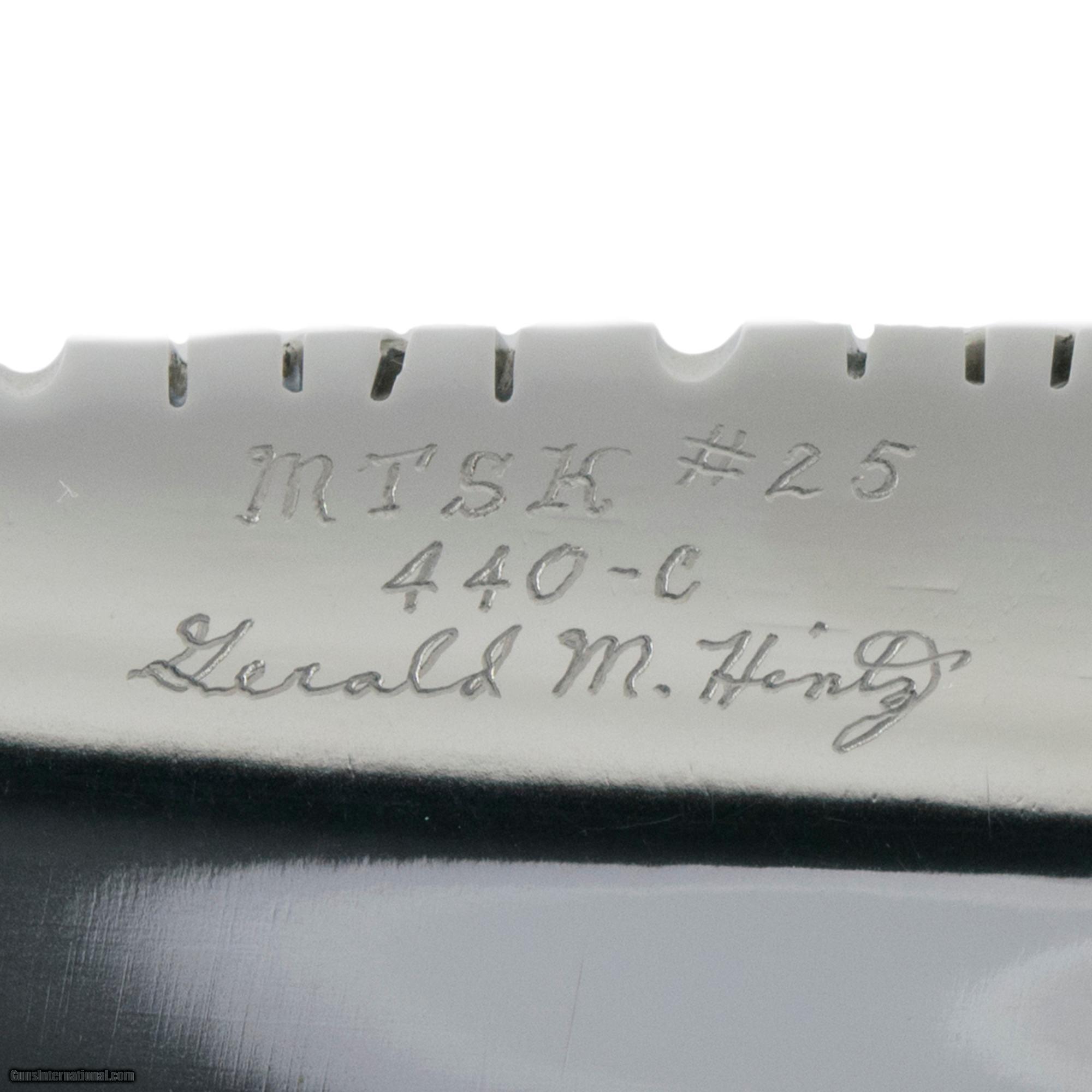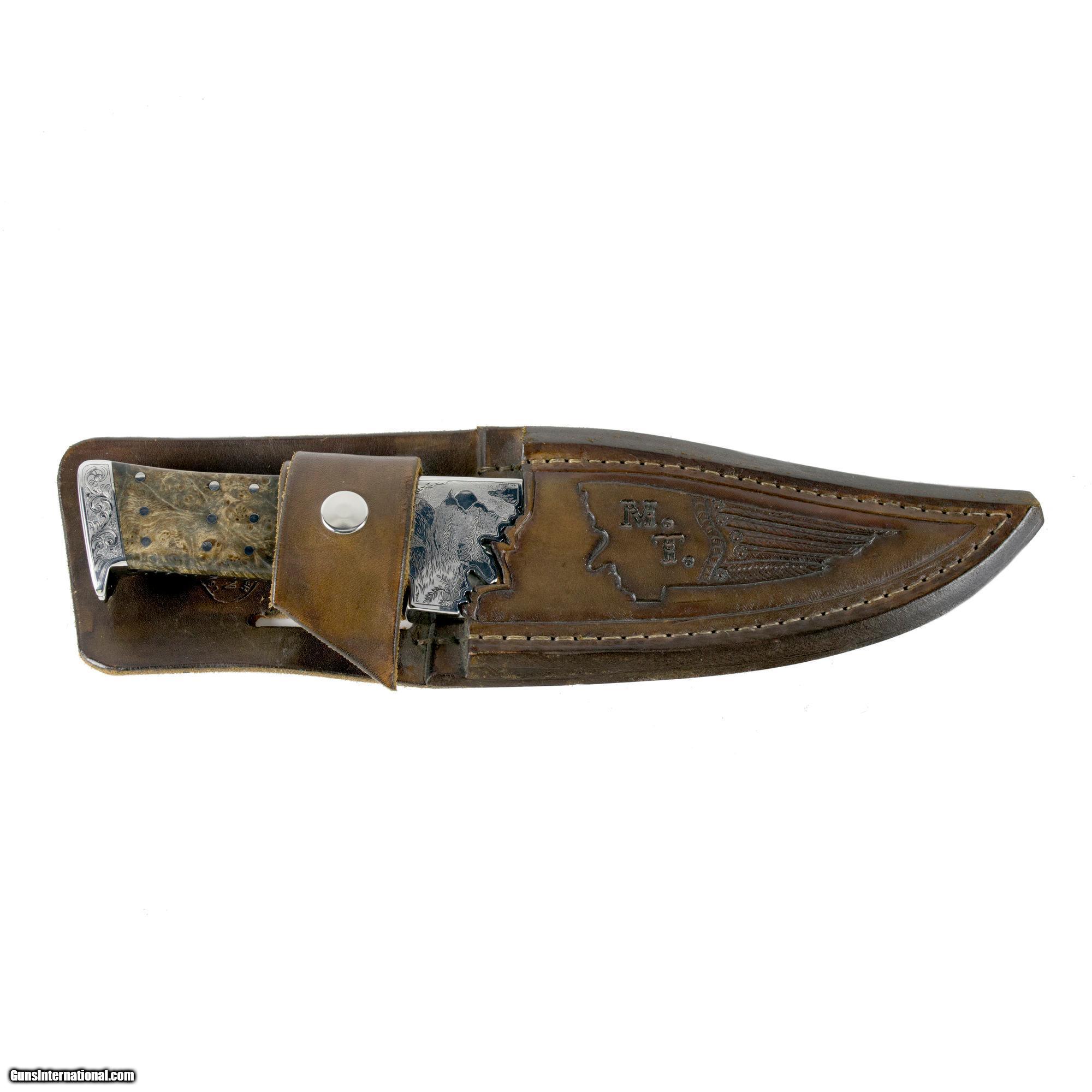 Description: Gerald M. Hintz custom knife MTSK #25 440C. Incredible details! Includes custom-made leather sheath with Montana border cut into the edge to match knife. PERIOD: Contemporary ORIGIN: Gerald M. Hintz SIZE: Blade measures 6 1/2" long, total length 11 1/2 SOLD |