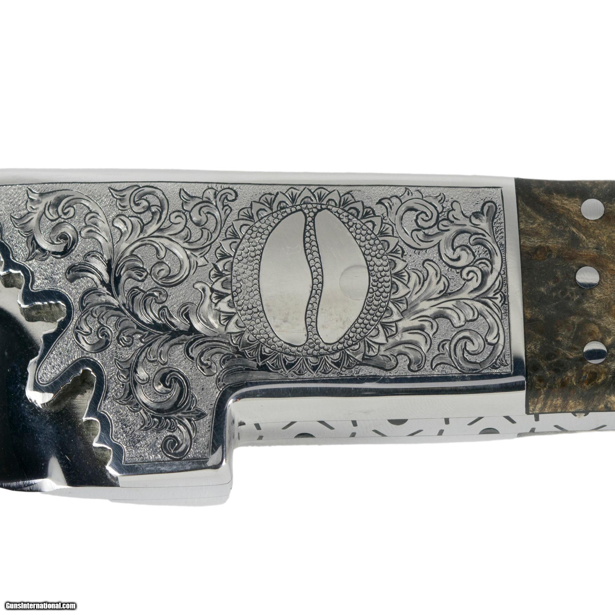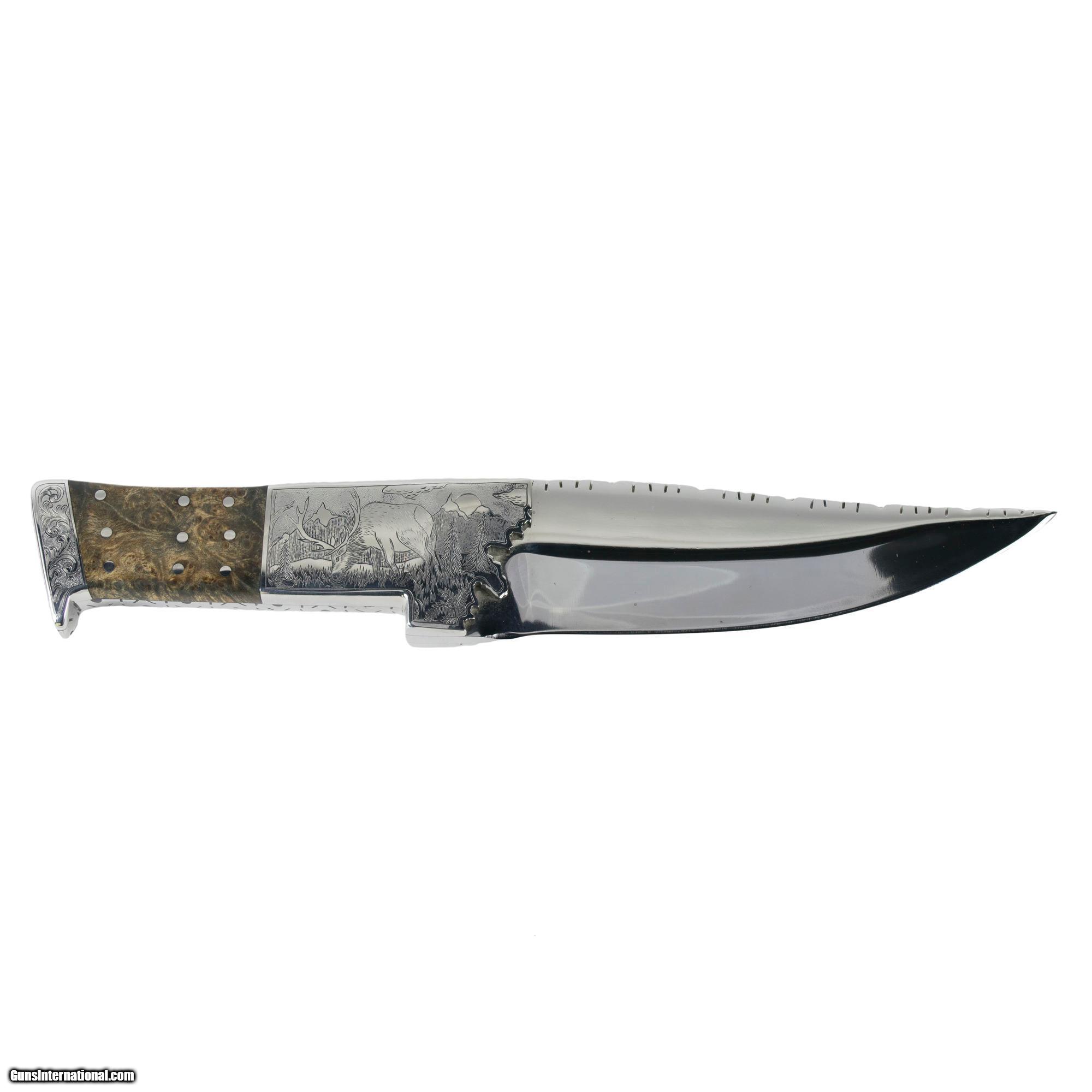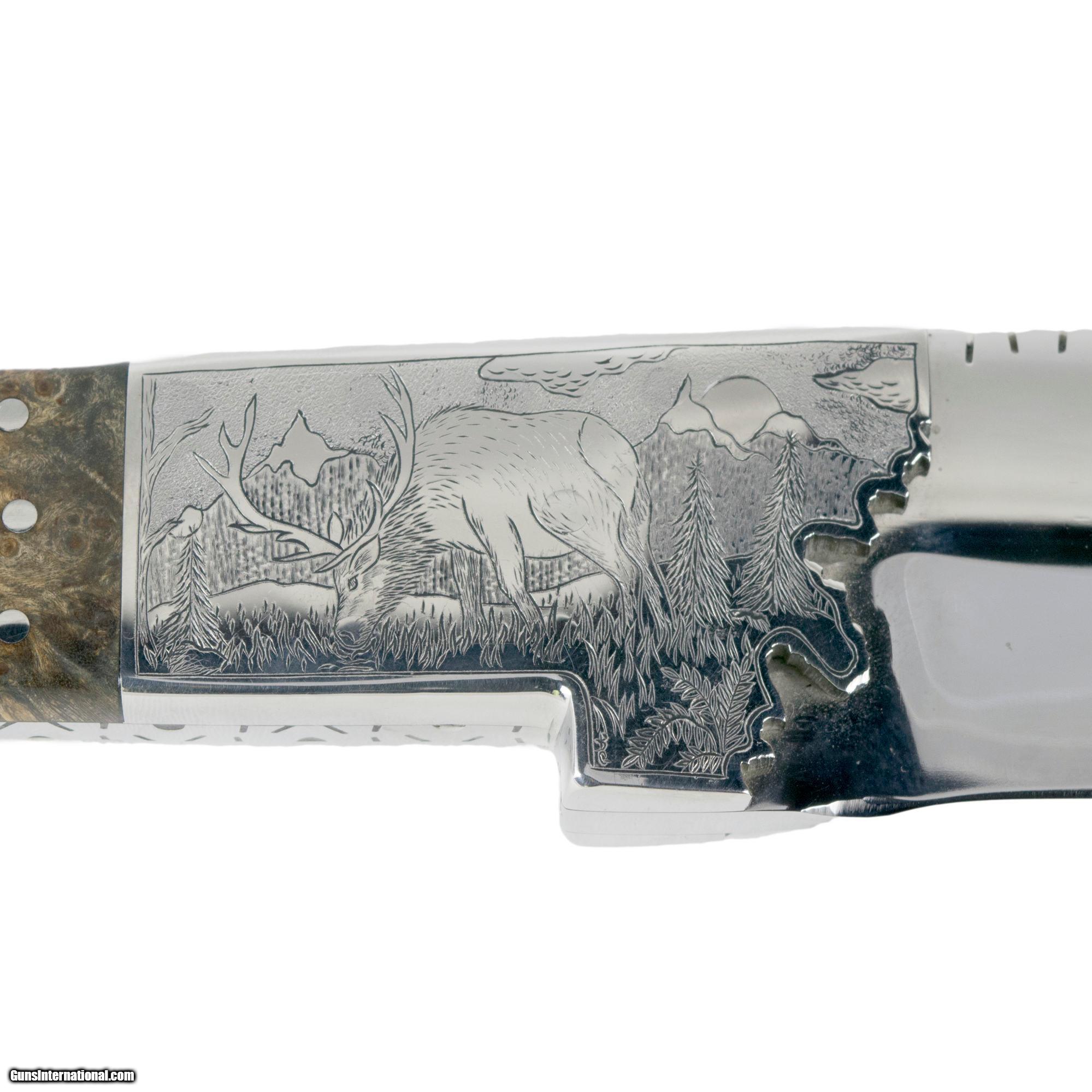 Description: Gerald M. Hintz custom knife MTSK #25 440C. Incredible details! Includes custom-made leather sheath with Montana border cut into the edge to match knife. PERIOD: Contemporary ORIGIN: Gerald M. Hintz SIZE: Blade measures 6 1/2" long, total length 11 1/2 SOLD |