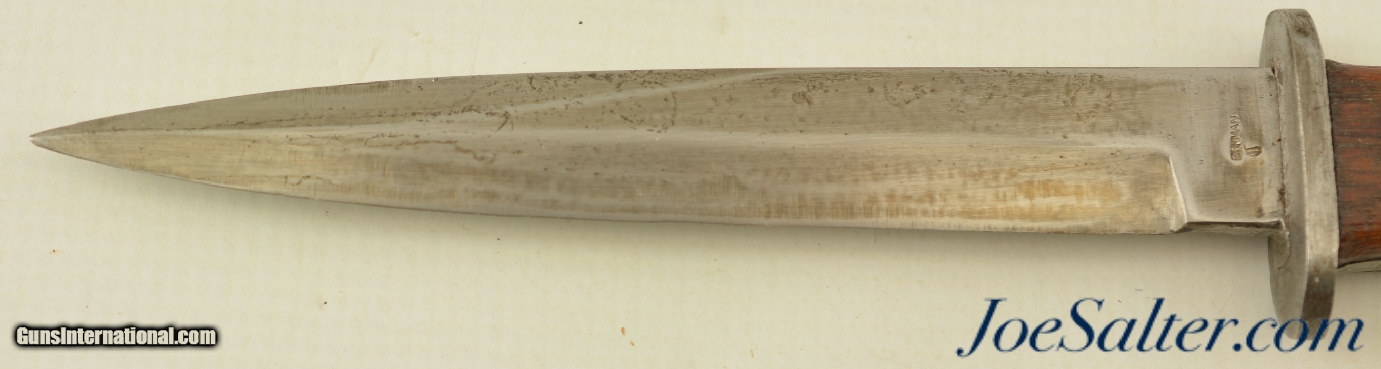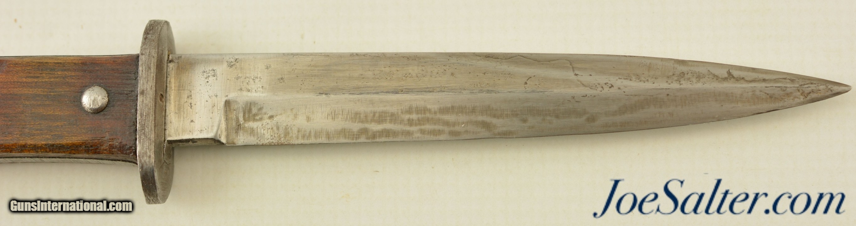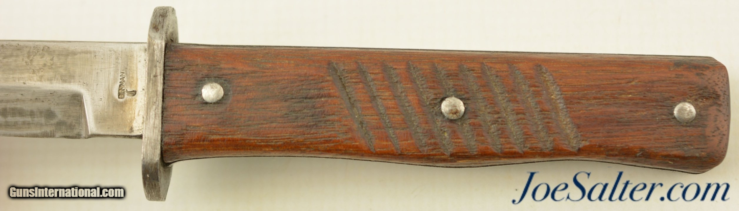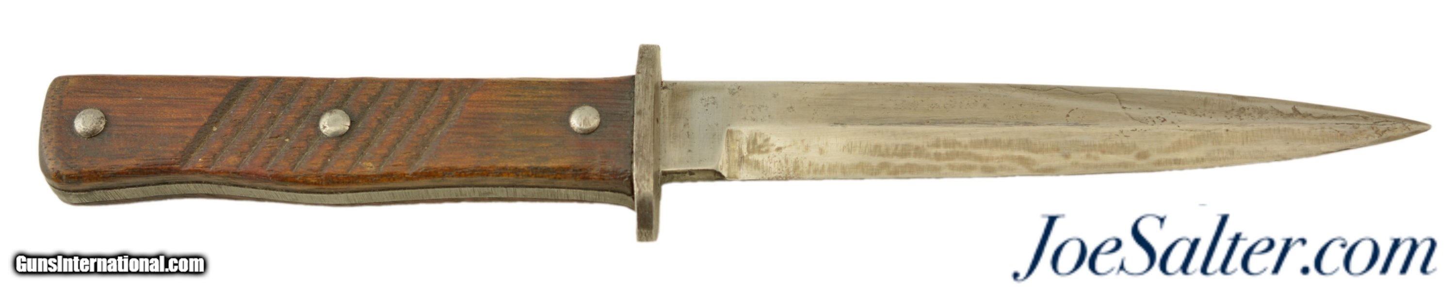Description: This is a German fighting knife with a 6 inch blade. Marked Germany, this reworked knife looks to be theater altered from a larger knife. The blade has old grind marks and pitting that have been smoothed over and finished. The false edge has been sharpened extending about 2 inches. The wood grip scales are in excellent condition. A very well made old fighting knife.; SOLD |