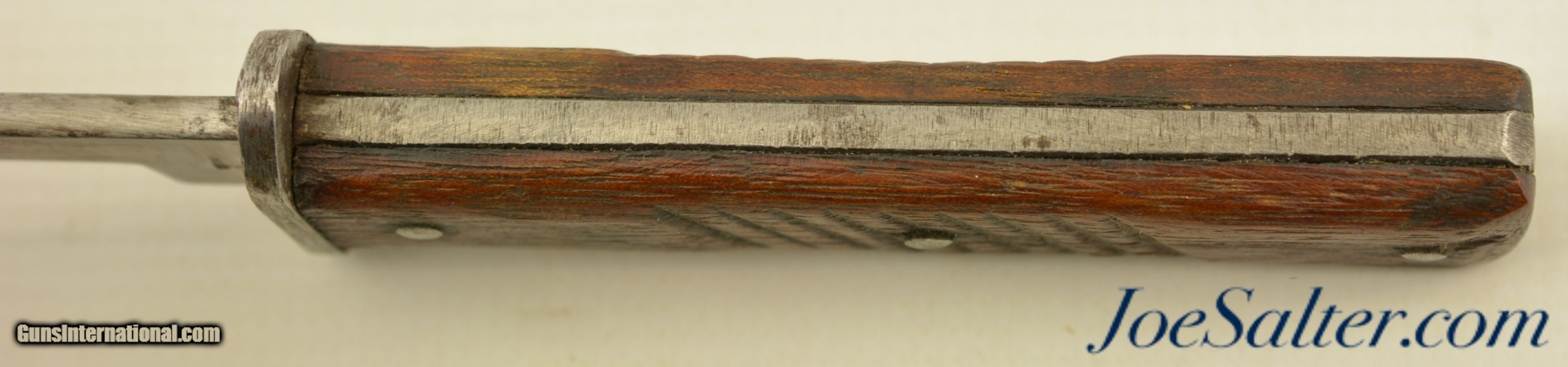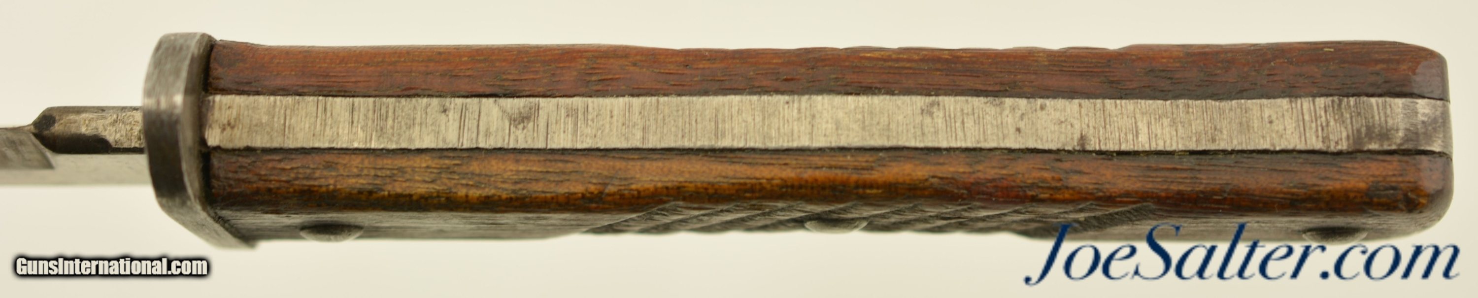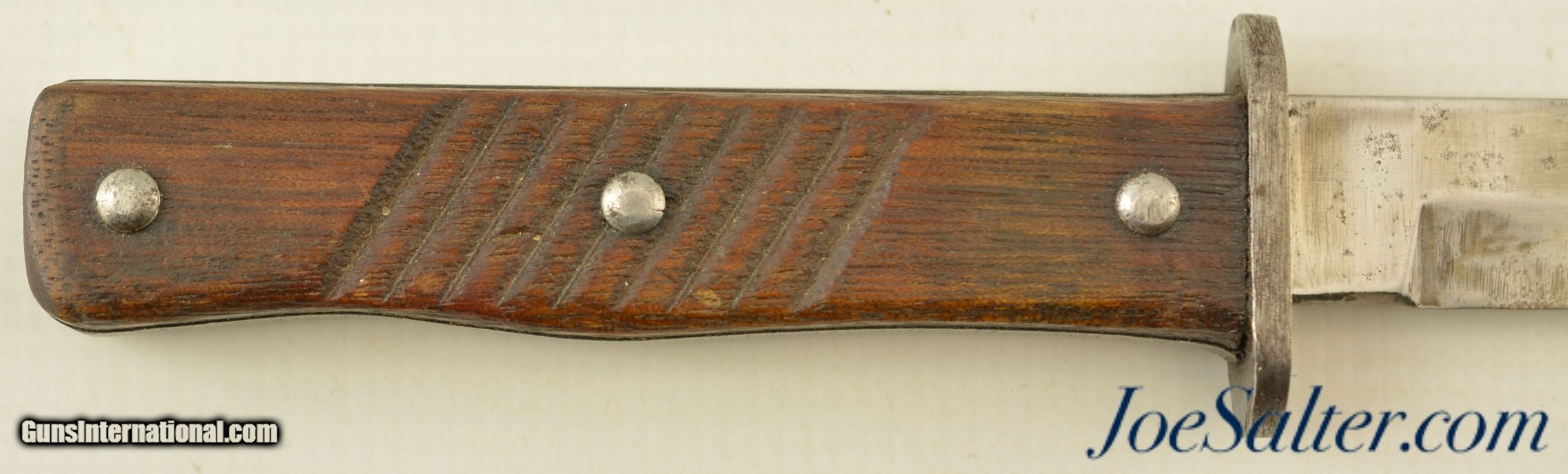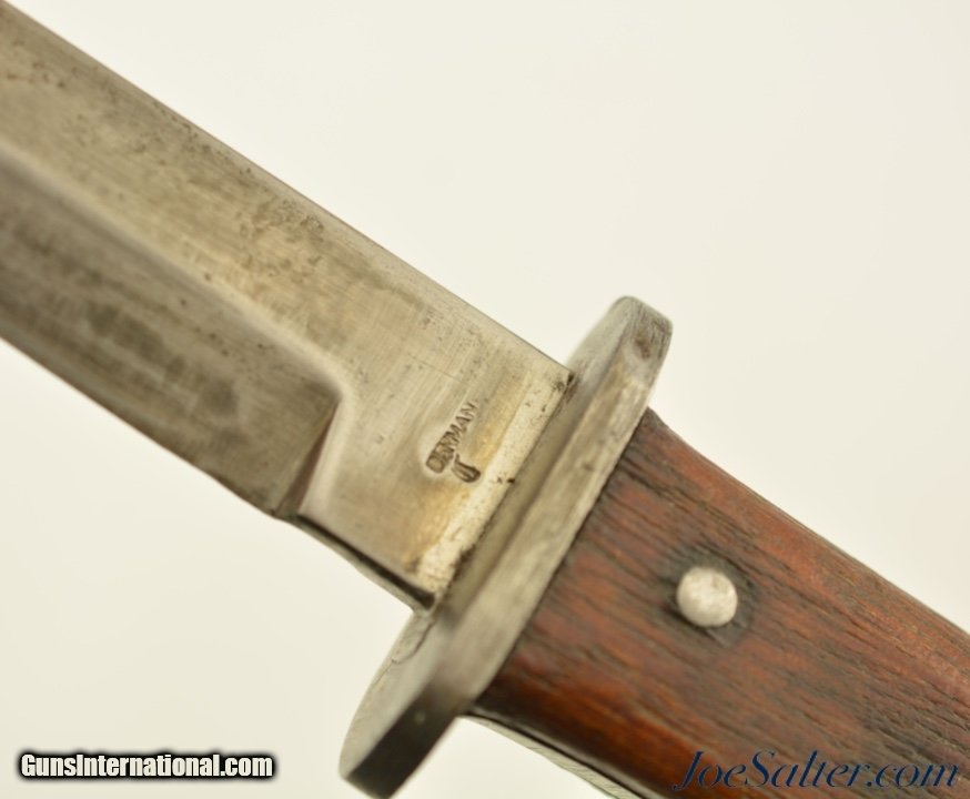Description: This is a German fighting knife with a 6 inch blade. Marked Germany, this reworked knife looks to be theater altered from a larger knife. The blade has old grind marks and pitting that have been smoothed over and finished. The false edge has been sharpened extending about 2 inches. The wood grip scales are in excellent condition. A very well made old fighting knife.; SOLD |