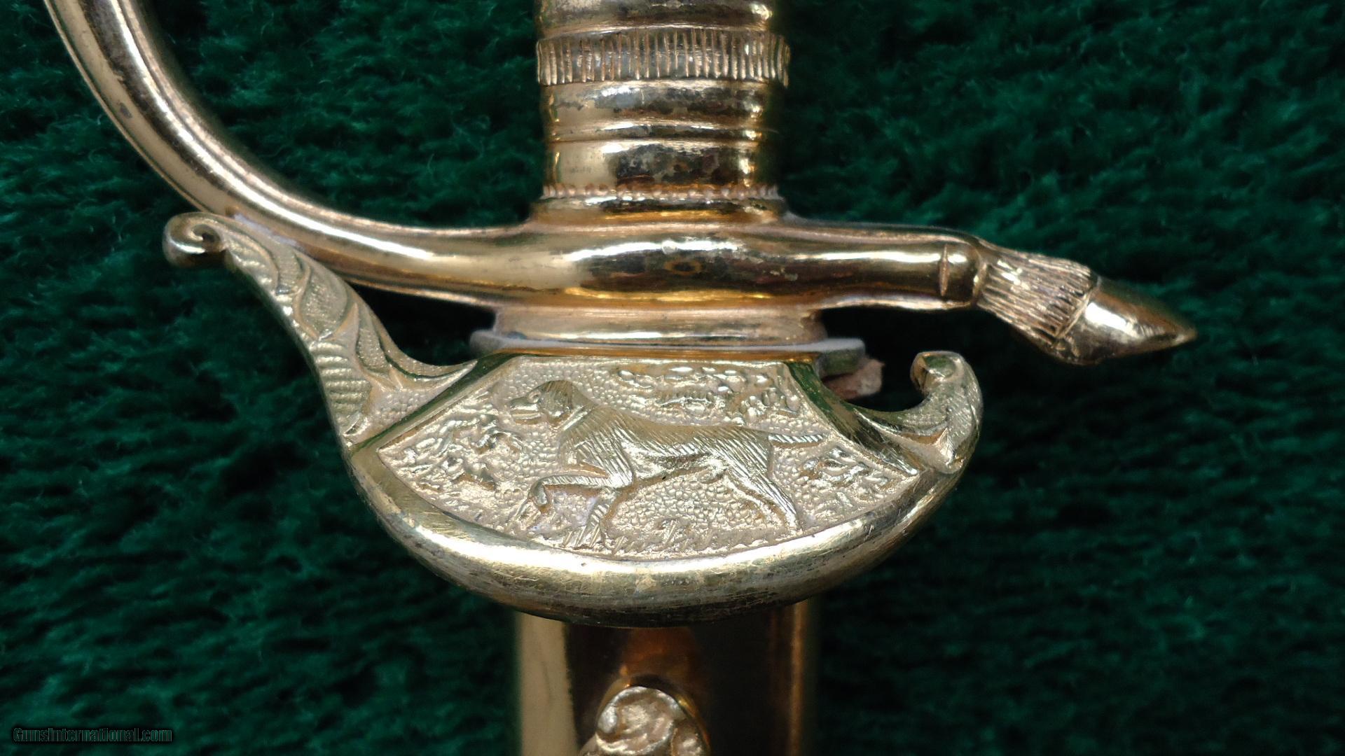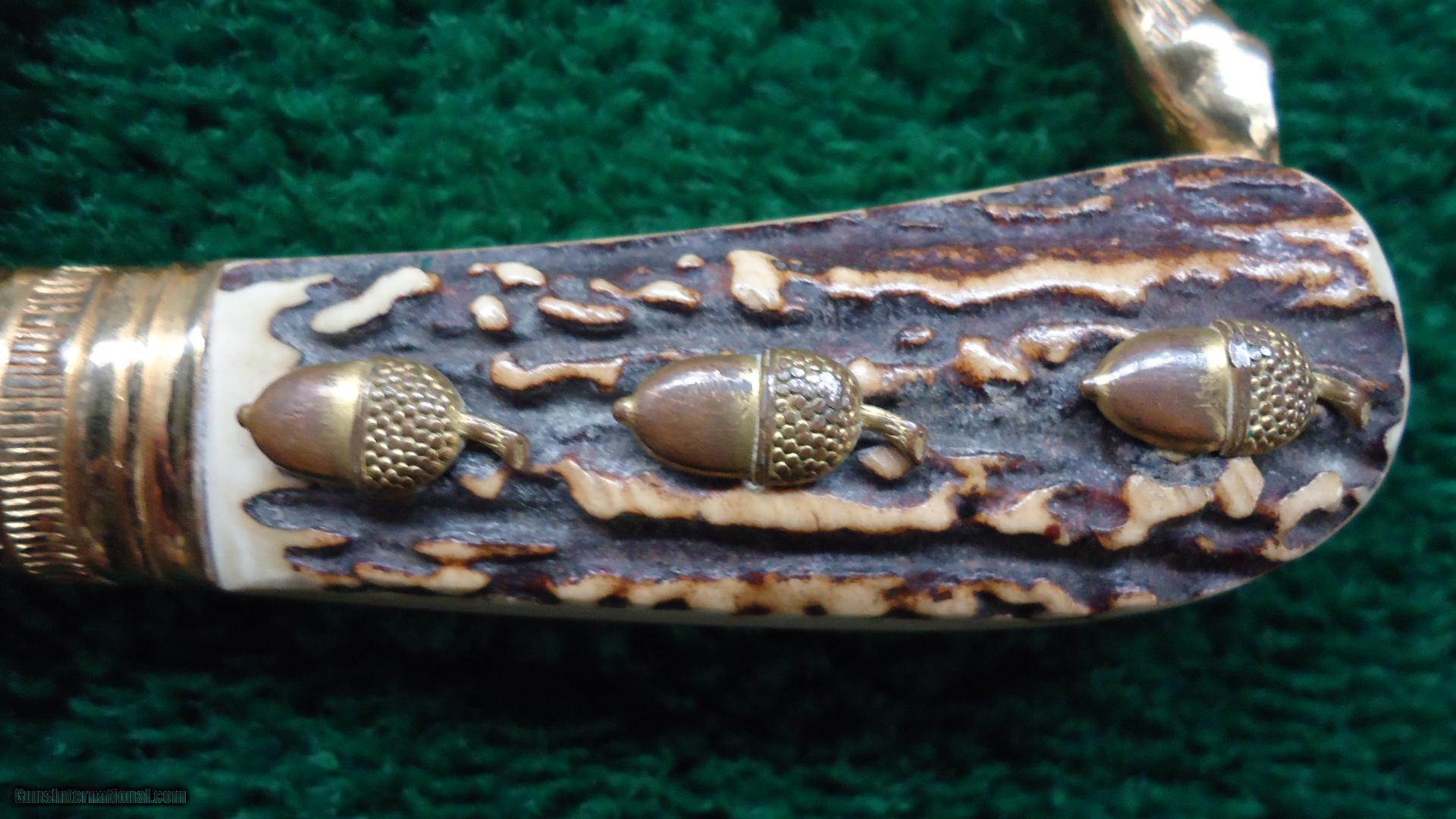 Description: 9-3/4 unmarked blade; both sides with hunting scenes. Gold plated clamshell guard with stag grips and acorn rivets. Black leather scabbard with gold plated mounts, no frog. Condition is excellent to mint with very light storage wear. Appears to be unused. Leroy Merz Antique Firearms specializes in antique and vintage Winchesters and other fine American firearms. Since 1965 Mr. Merz has taken part in the world of firearms and has been a contributor to many well known reference books. Just recently we mailed the 127th edition of our privately-published catalog. We have hundreds of additional guns in every price range at our home online. Search for Merz Antiques in google. SOLD |