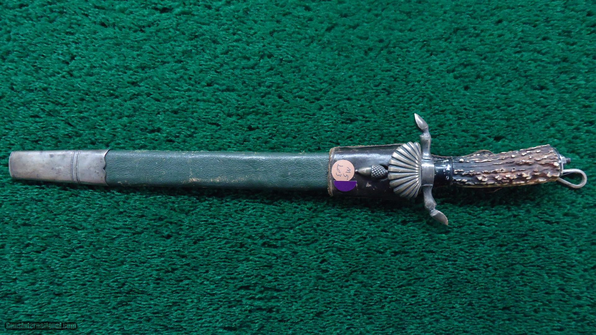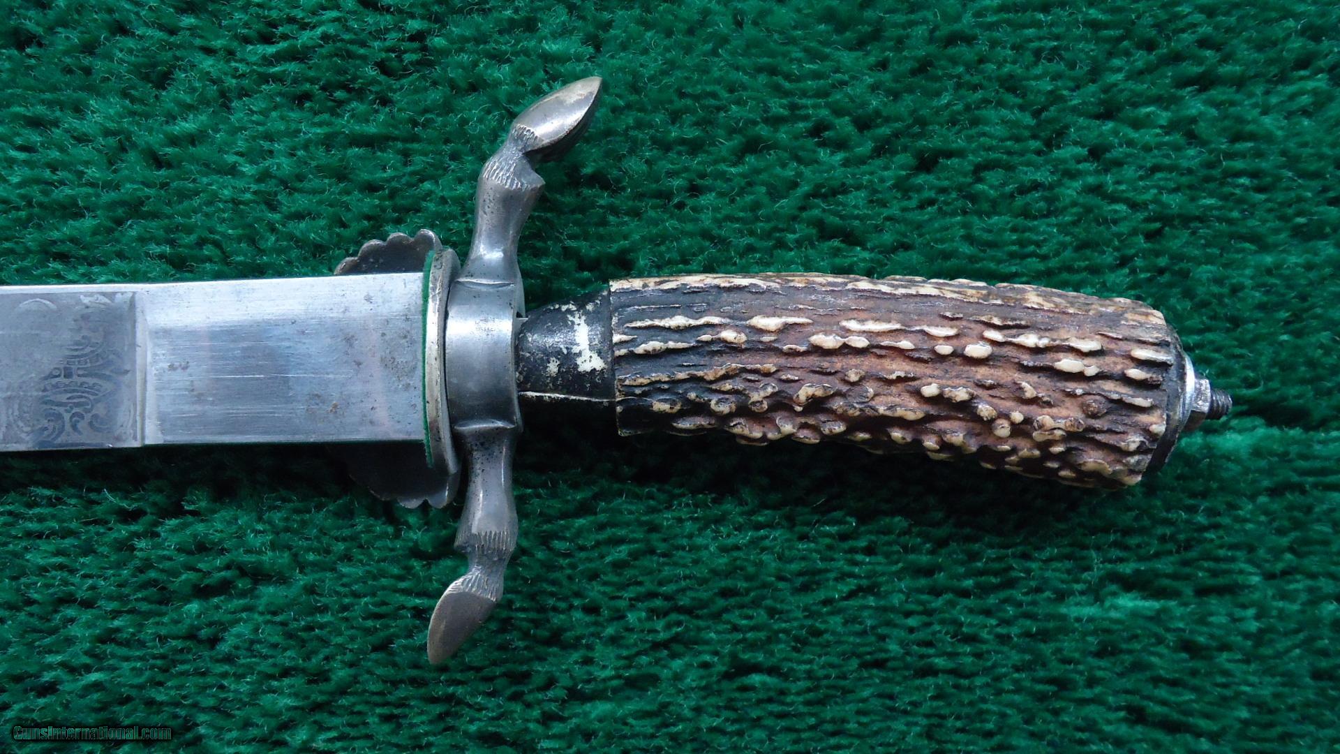 Description: With hunting scenes etched, 13-5/8 blade. Nickel plated clamshell and deer hoof guard, one piece stag grip. Dark green leather covered scabbard with nickel plated mounts, unmarked leather frog. Good condition showing wear and minor nicks to the blade. Leroy Merz Antique Firearms specializes in antique and vintage Winchesters and other fine American firearms. Since 1965 Mr. Merz has taken part in the world of firearms and has been a contributor to many well known reference books. Just recently we mailed the 127th edition of our privately-published catalog. We have hundreds of additional guns in every price range at our home online. Search for Merz Antiques in google. SOLD |