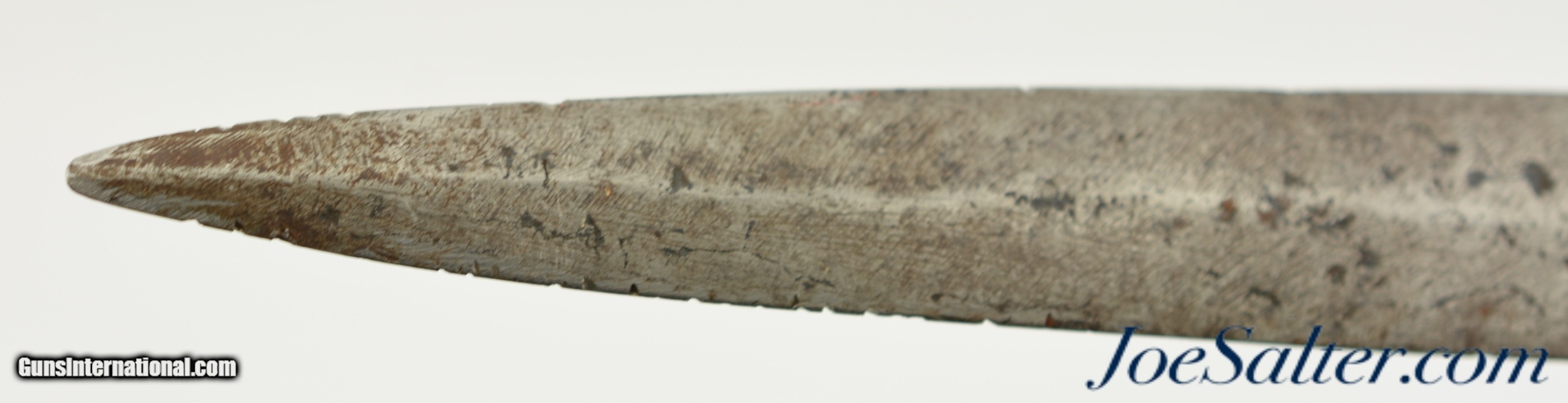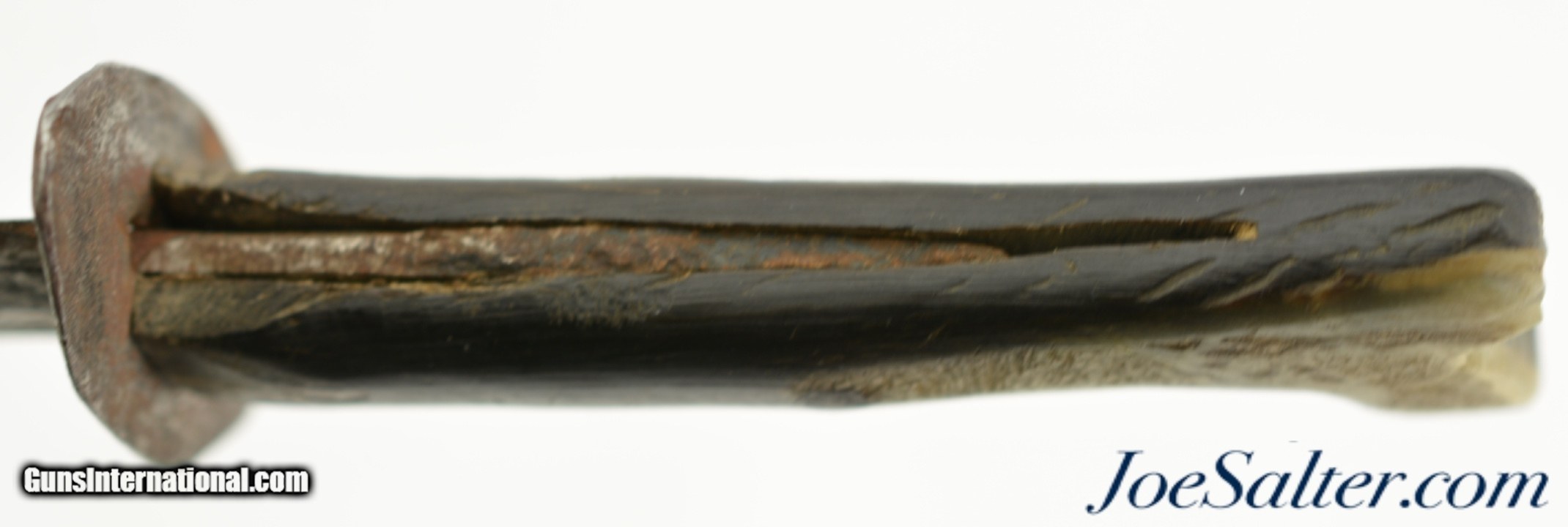 Description: This is a vintage hand made boot dagger with a sharpened two sided 7 1/2" blade. The blade and guard are in very good condition with light oxidation. The handle is made of horn and hand carved in the shape of a boot with two rivets. The handle is snug and is easy to grip. Could be Civil War era or older. SOLD |