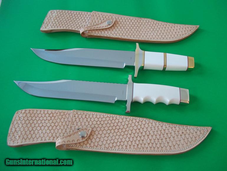 HAROLD CORBY old and new style ' YENZER BOWIES " reproduced by Harold in modern time specifically handcrafted and never to be duplicated for anyone else are the two exact reproduction of the YENZER BOWIE shown in THE GUN DIGEST BOOK OF KNIVES, 1973 and MODERN HANDMADE KNIVES , 1982 without the engraving on blade, guard and butt cap. ABsoutely stunning and extremely beautiful is the two ivory handle from selected female center cut elephant ivory tusk with special German silver fittings on one knife and file work on top of blade ( 1982 reproduction model -guard and butt cap) and combination aluminium 441 aircraft and brass guard on the 1973 model) are the most breathtaking matched set you will ever find today. Comes with Harold one-of-a-kind basket weave specially created for this set brown leather scabbard fopr each model. Comes with all paperwork,authenticity letter. THis set is the only one Harold will ever do as the master templates were destroyed. Corby strikes again with this out-of-this world creations and best Bowies type knives ever produced by any modern smith using stocvk-removal method ( most of the so called forged knives are at a distant second when it comes to the most unique, perfect crafsmanship, beauty and extreme visual appearance as found on these two knives). Corby ranks in the top of the very best of the best knifemakers out thre-his knifemaking abilities have no equal ( to me at least !). Will not break the pair/set as both knives belong in this unique crafted work-of-art ! Shipping included ( USPS, priority mail, insured ).