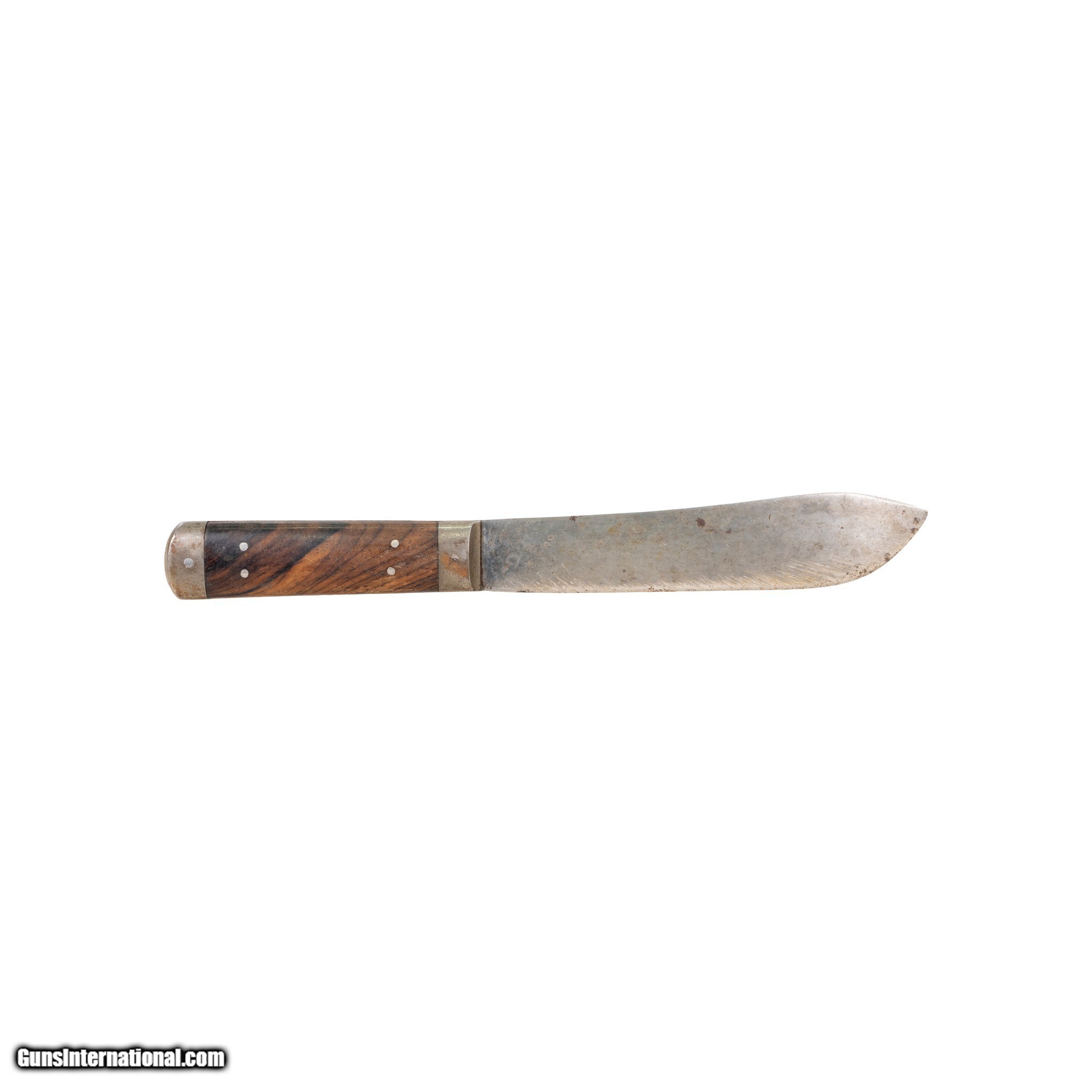 Description: Hudson Bay carving knife with stylized silver beaver on handle. Piece is marked "E.N. Dickenson Vel. Derado, Sheffield, England." Beautiful yet functional piece that is great for contonued use or display. Blade measures at 6" and overall is 10" in length. SOLD |