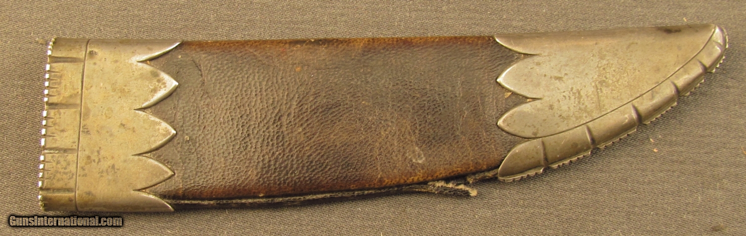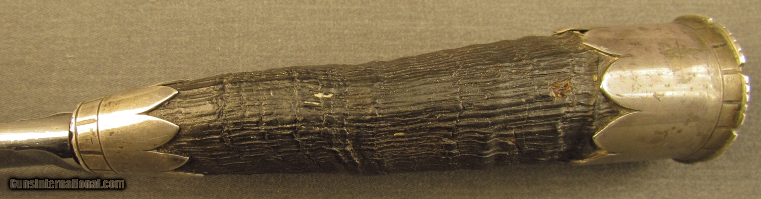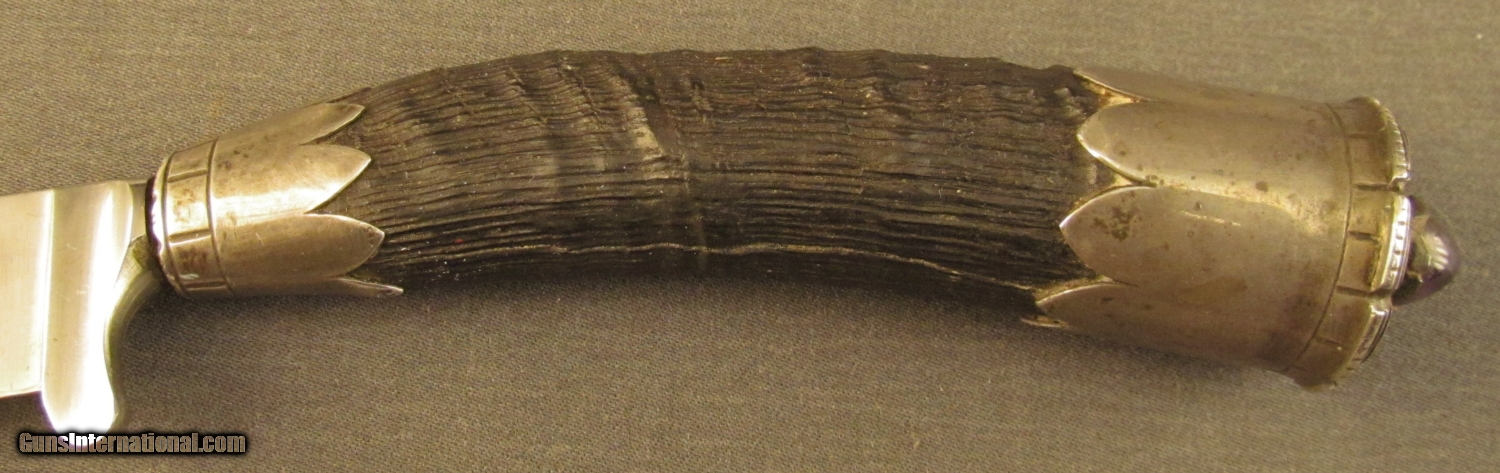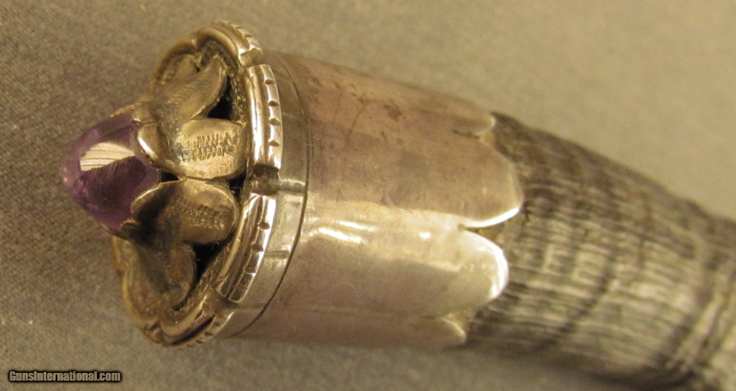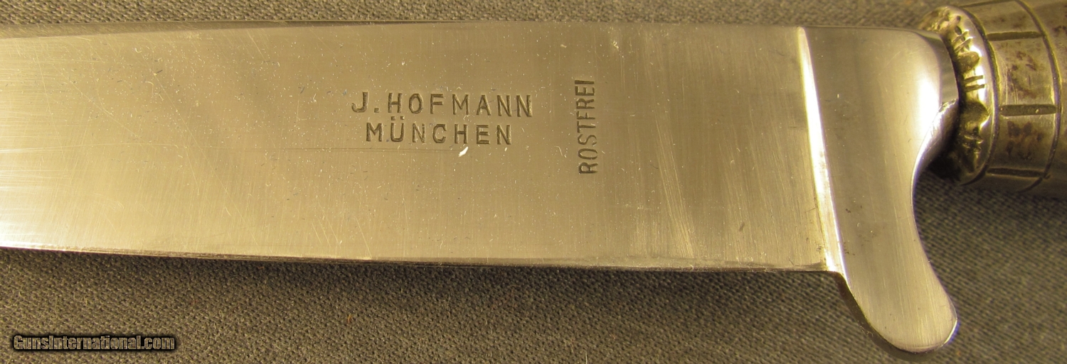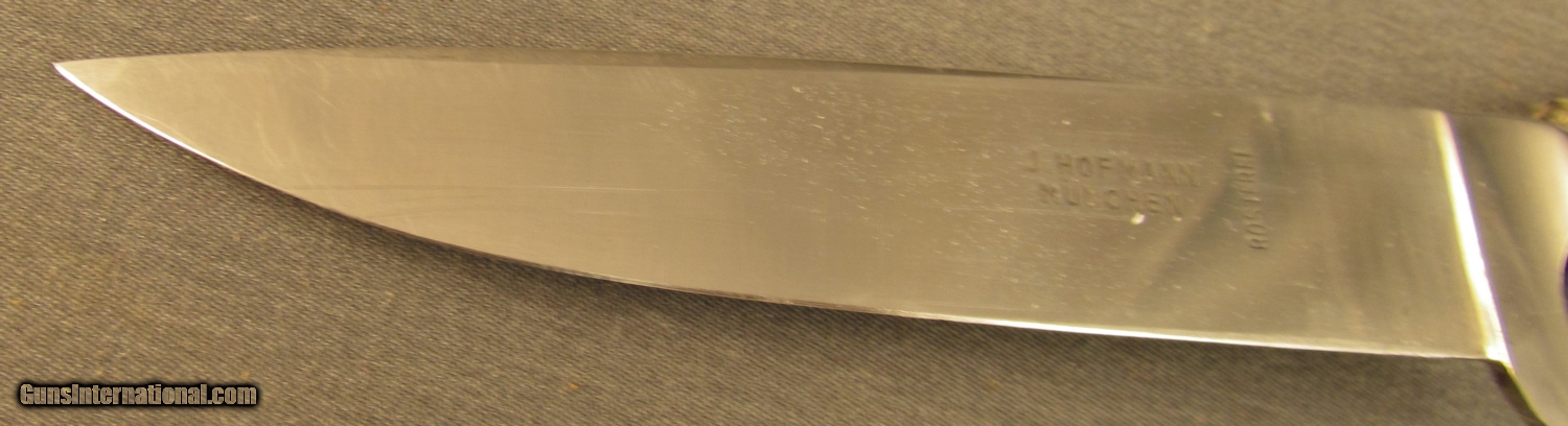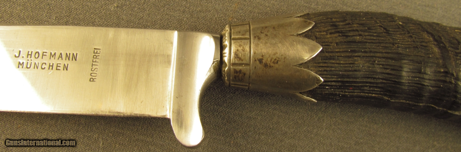 Description: This classic German hunter features a horn grip with coin silver mounts and a flower shaped pommel set with a large amethyst in center. All four fittings are marked "Silver 900". The four inch blade is marked "J. Hofmann/Munchen" and "Rostfrei" on one side. This fine knife comes with a leather and silver scabbard in very good condition with a minor seam split. A lovely knife with lots of eye appeal, this will add to any knife collection, look great with your drilling or is skien-dugh enough to adorn the stocking of some flashy Scot. SOLD Manufacturer: Hofmann Model: Knife |