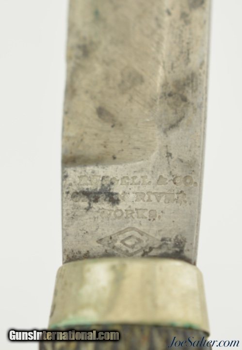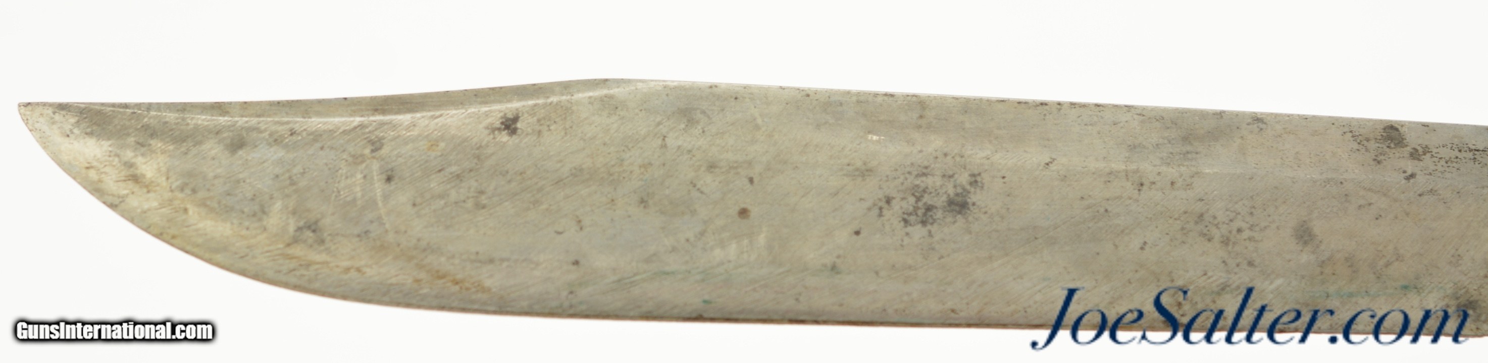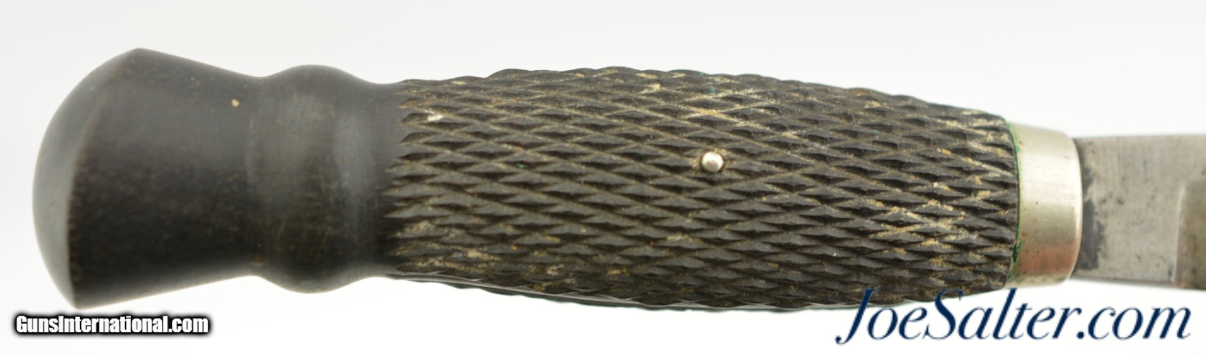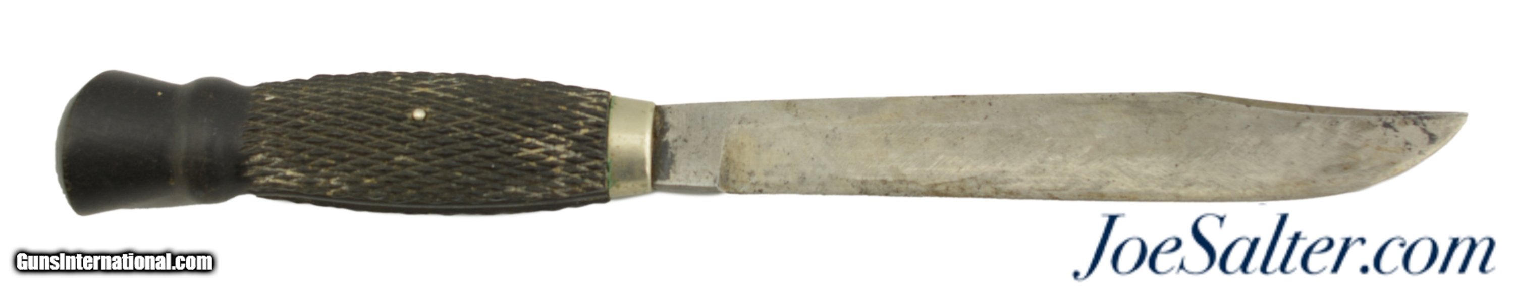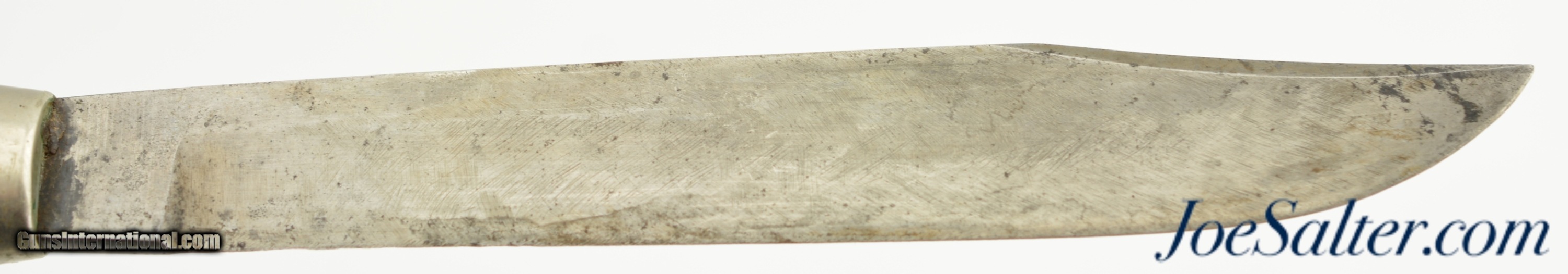 Description: Original J. Russell Green River Works Bowie Knife with thistle top handle. 6" Blade - Excellent Ebony Handle with no chips or cracks, light bumps. Circa 1890-1920. The sharpened blade shows age, speckling and retains a very keen edge. SOLD |
