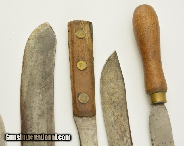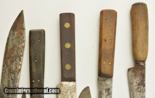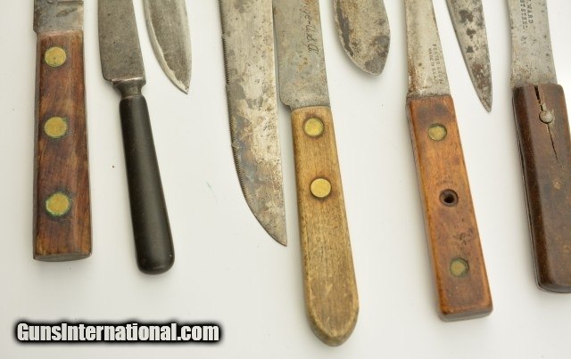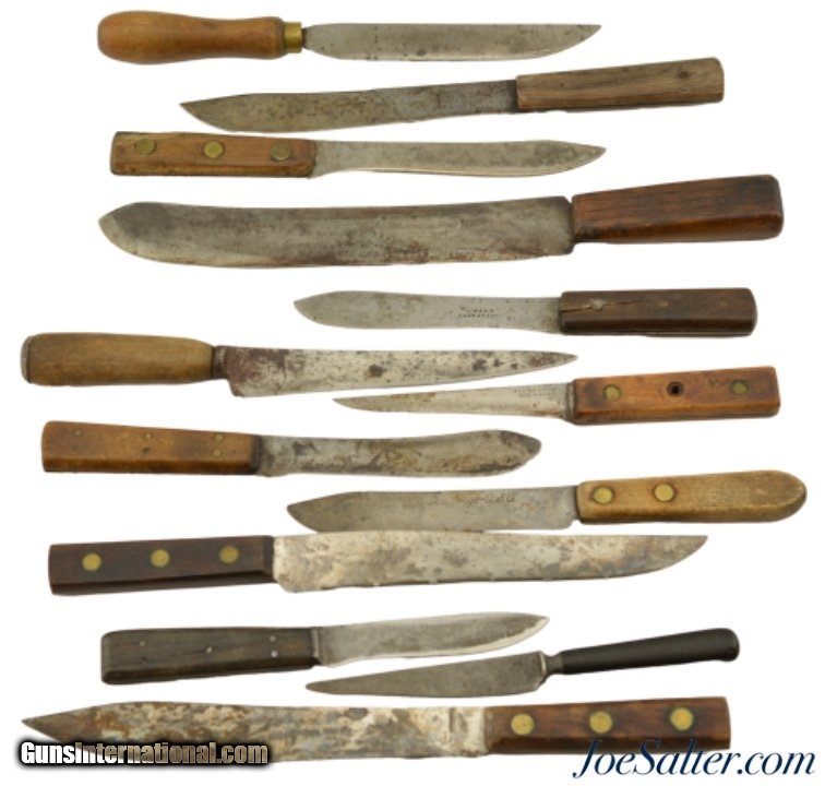 Description: This is a collection of many styles and lengths of different kitchen and butcher knives. There is 13 knives and are split almost even between the two types. A few are marked but most are unmarked. This is an easy way to add to a collection. SOLD |