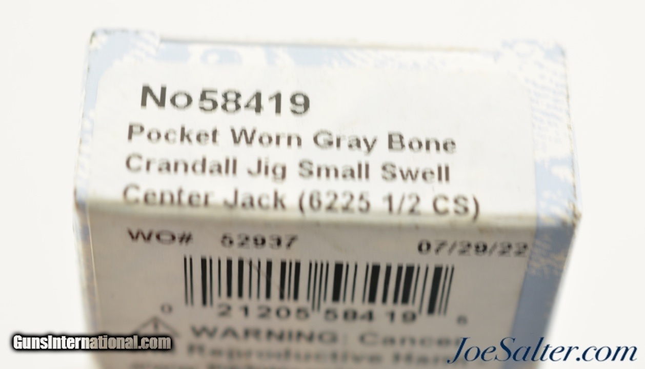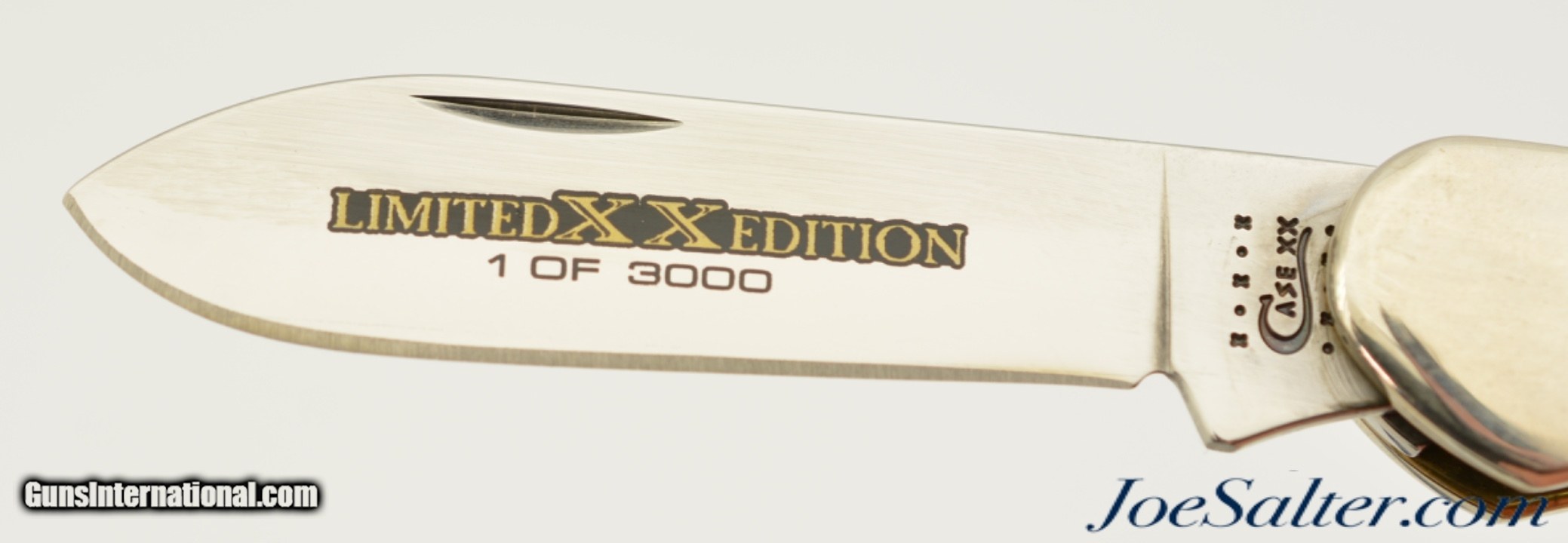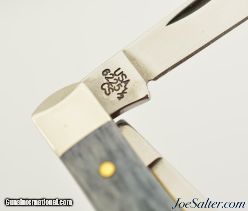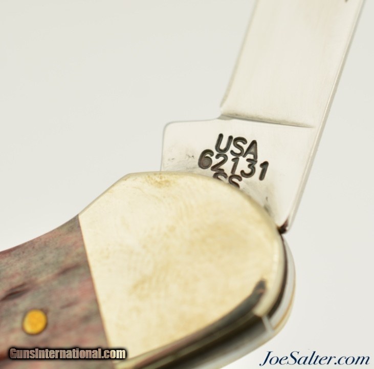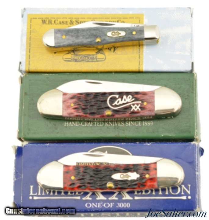 Description: This is a collection of 3 NOS Case Pocket Knives consisting of one No. 58419 pocket worn gray bone crandall jig small swell Center Jack 6225 1/2 CS WO# 52937, one No. 05424 131 Canoe Cranberry 62131 SS and one No. 11583 131 Canoe Crimson 62131 SS One of 3000. The boxes show signs of storage and opening with knives being unused new except for a tiny scratch on the Center Jack, main blade at the very end on one side only. SOLD |