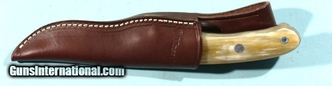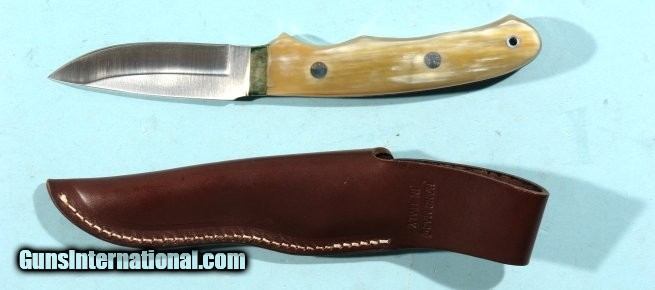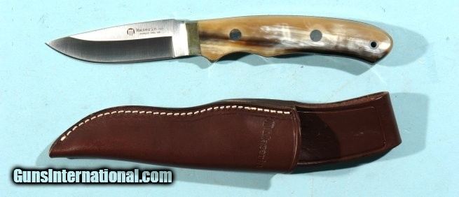 Description: MASERIN ITALY FINE QUALITY 4” BUFFALO HORN LONG HILT SKINNING KNIFE W/LEATHER SHEATH IN ORIG. BOX CA. 1990’S. Finest quality top of the line model in as new unused condition. 5 ½” extra large hilt. High quality Italian leather sheath. Very handsome. SOLD |