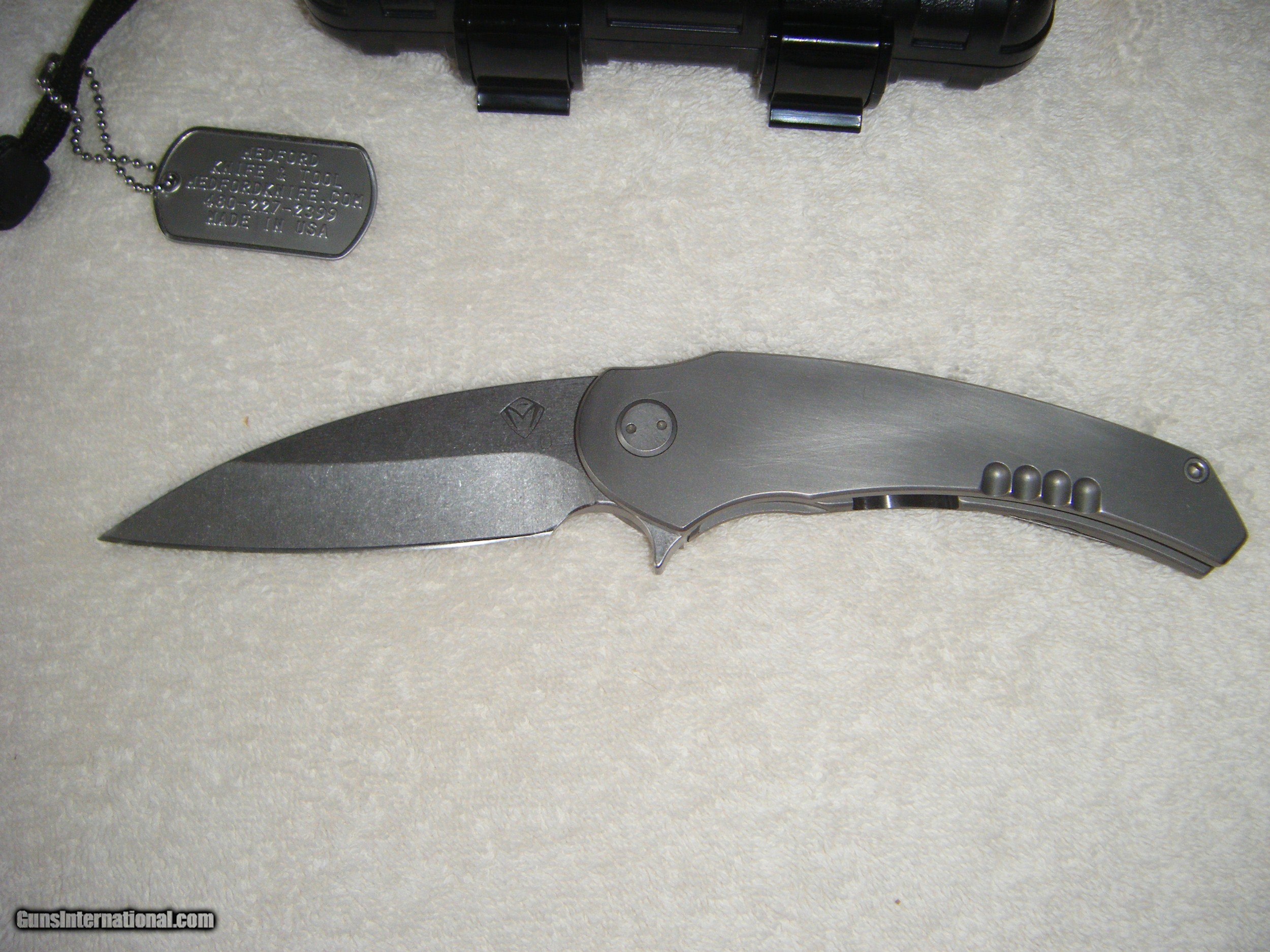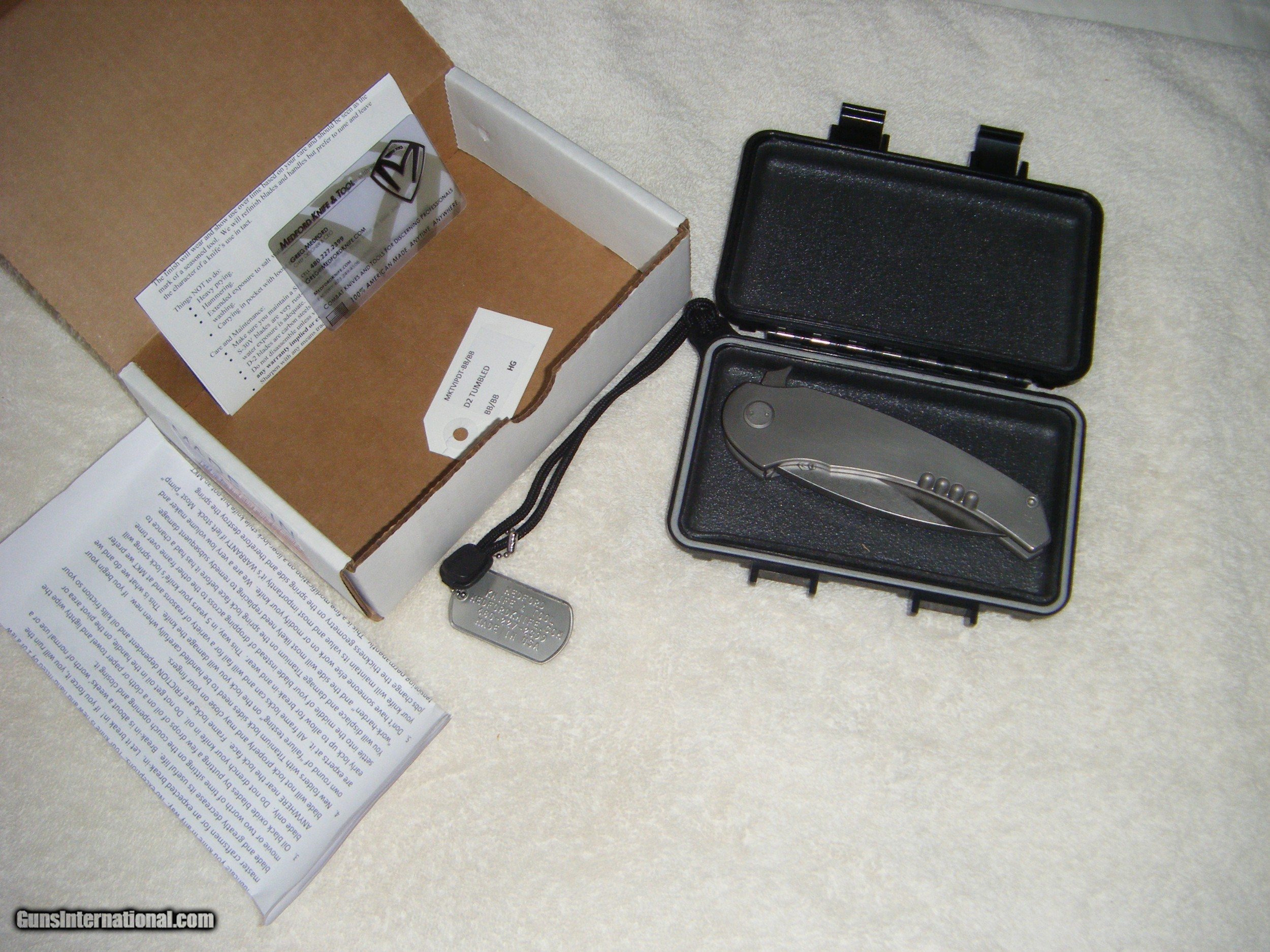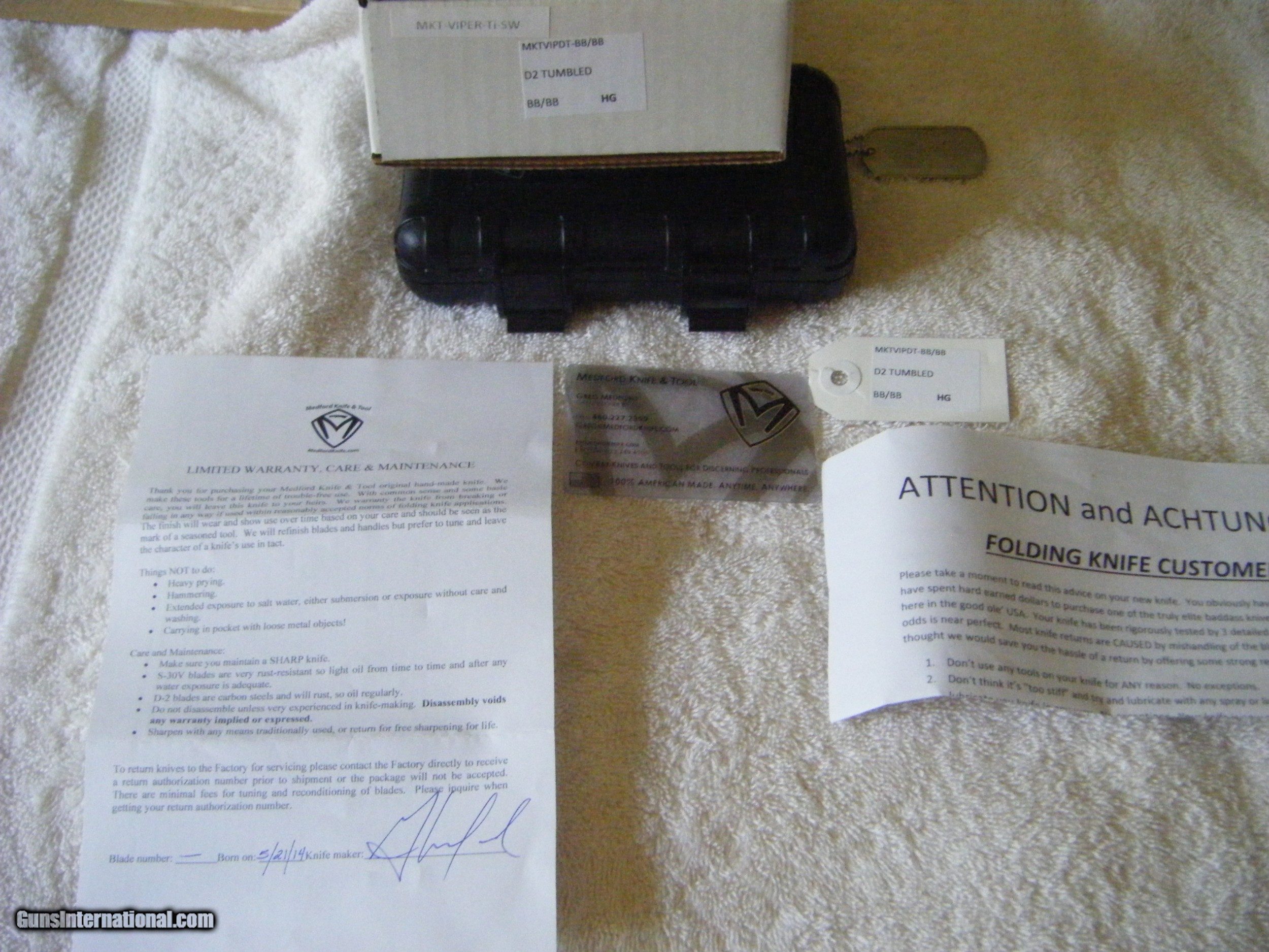 For sale is this MKT Viper, a flipper that has been discontinued for a few years now. It has been used but is in "like new" condition and comes with original box and original plastic case, dog tags, and all paperwork that came with it when it was new. These only rarely come up for sale any more but here's a chance to own one. This particular knife has the D2 tumbled blade and bead blasted handles. As mentioned it has been carried and used but is still in excellent condition, and comes with everything that came with it from the factory, as you'll note in the pictures. Price is $750, updated with reduction in price to $600, plus the cost of shipping, within the U.S. only.