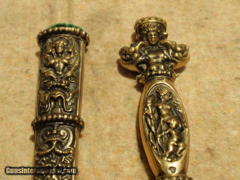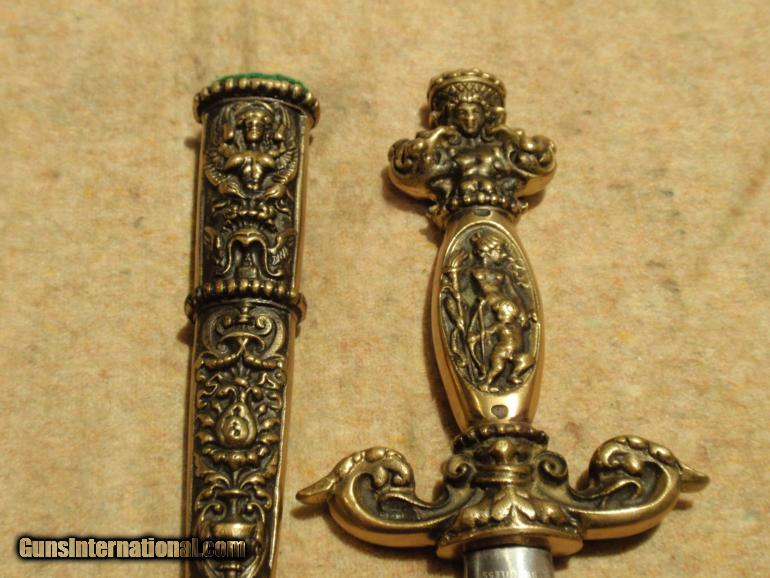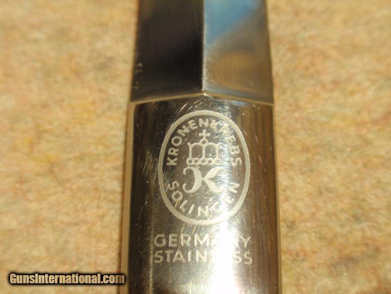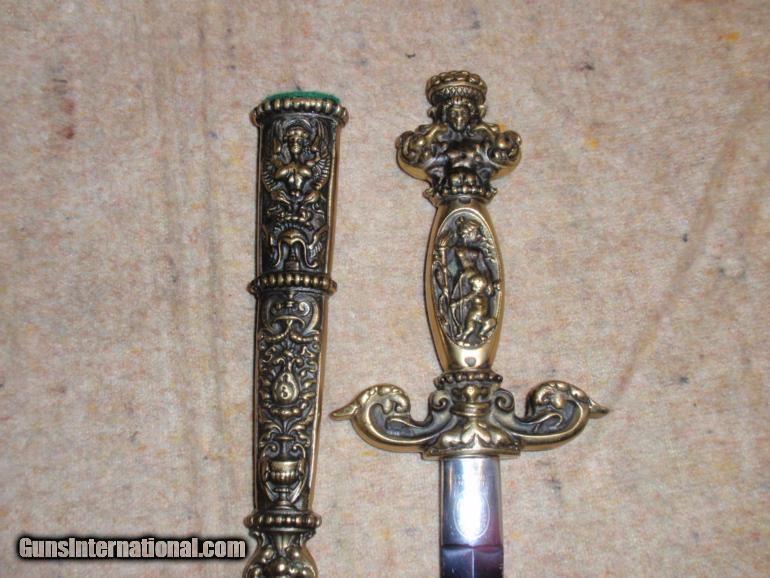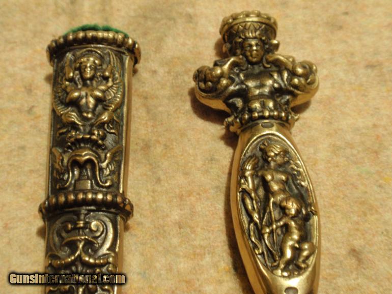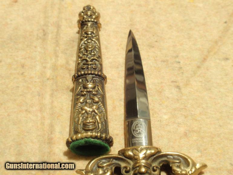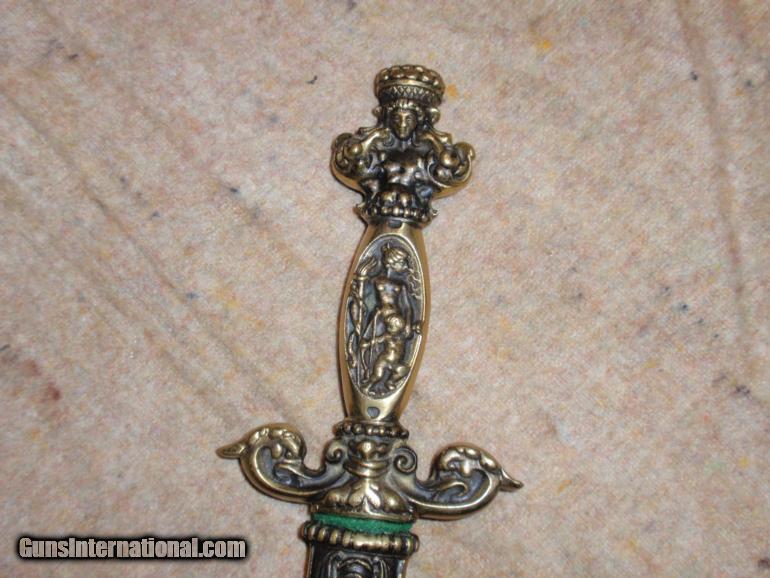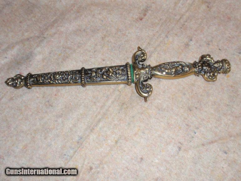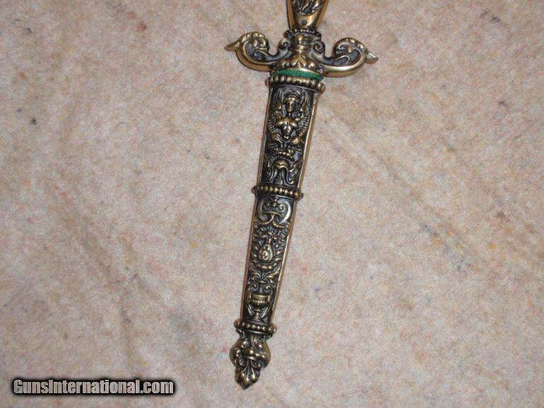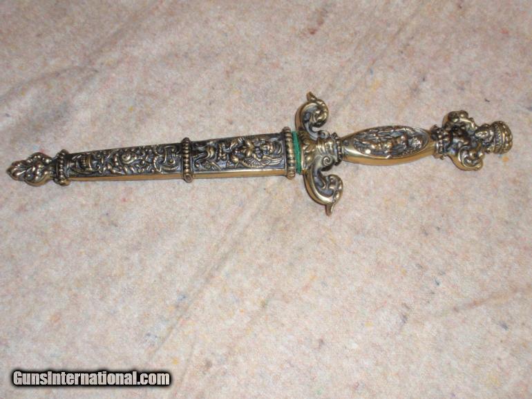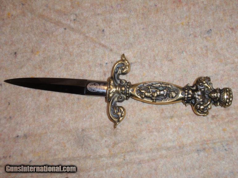 Description: CUSTOM DAGGER. MEDIEVAL GERMAN. DOUBLE-EDGED. SOLID BRASS, WITH STAINLESS STEEL BLADE. TOP-QUALITY, MAKER-MARKED WITH LOGO "KRONEN KREBS / SOLINGEN". 11 1/4" OAL IN SCABBARD. 10" OAL DAGGER. 5 1/4" DOUBLE-EDGED STAINLESS STEEL BLADE, WITH ORIGINAL EDGES. VERY HEAVY, SOLID BRASS HANDLE AND SCABBARD. DECORATED WITH MYTHOLOGICAL CREATURES. QUITE UNIQUE AND VERY IMPRESSIVE!!!! 100% MINT & UNUSED!!! ***PLEASE SEE MY OTHER LISTINGS*** SOLD |