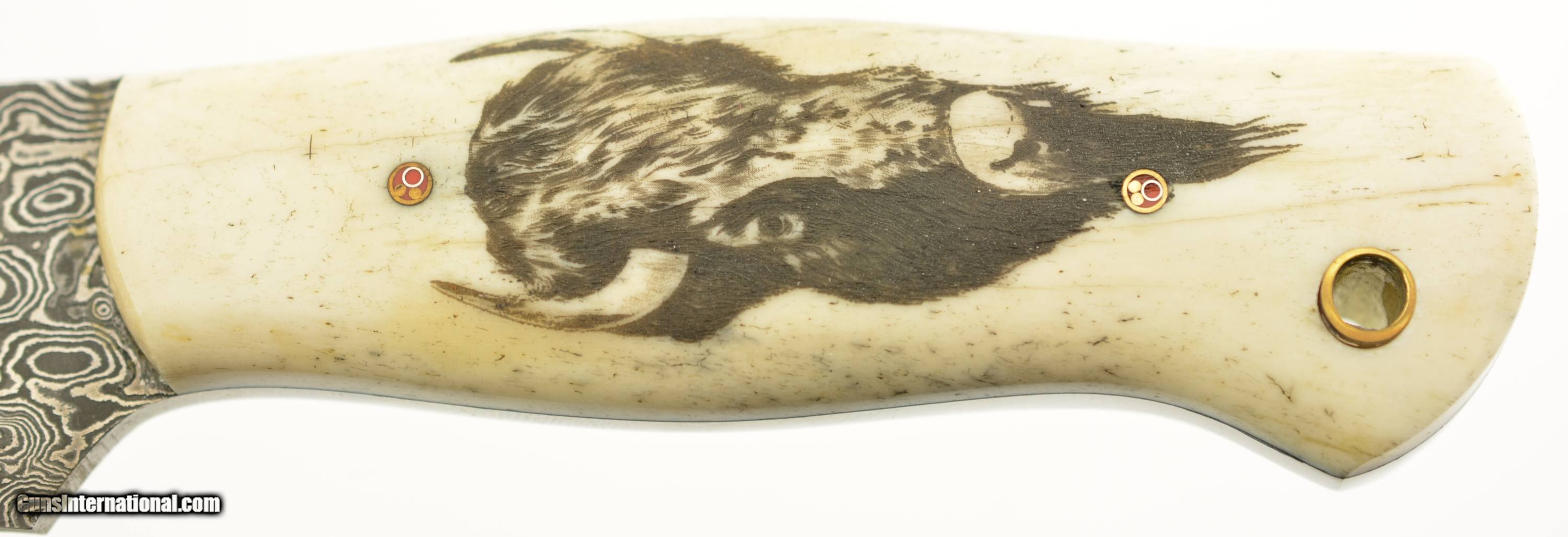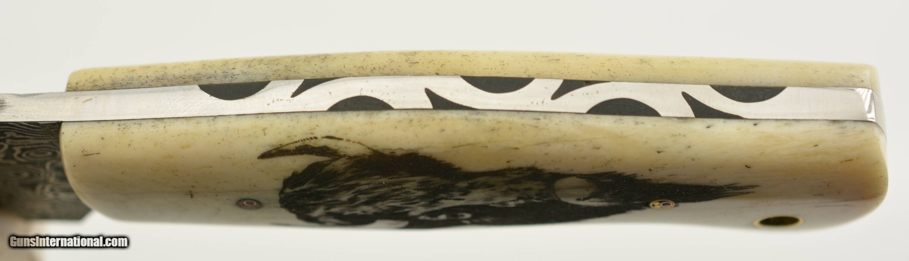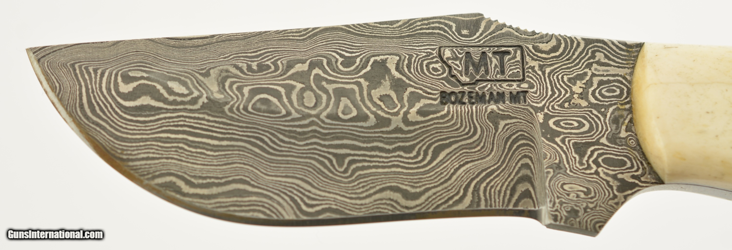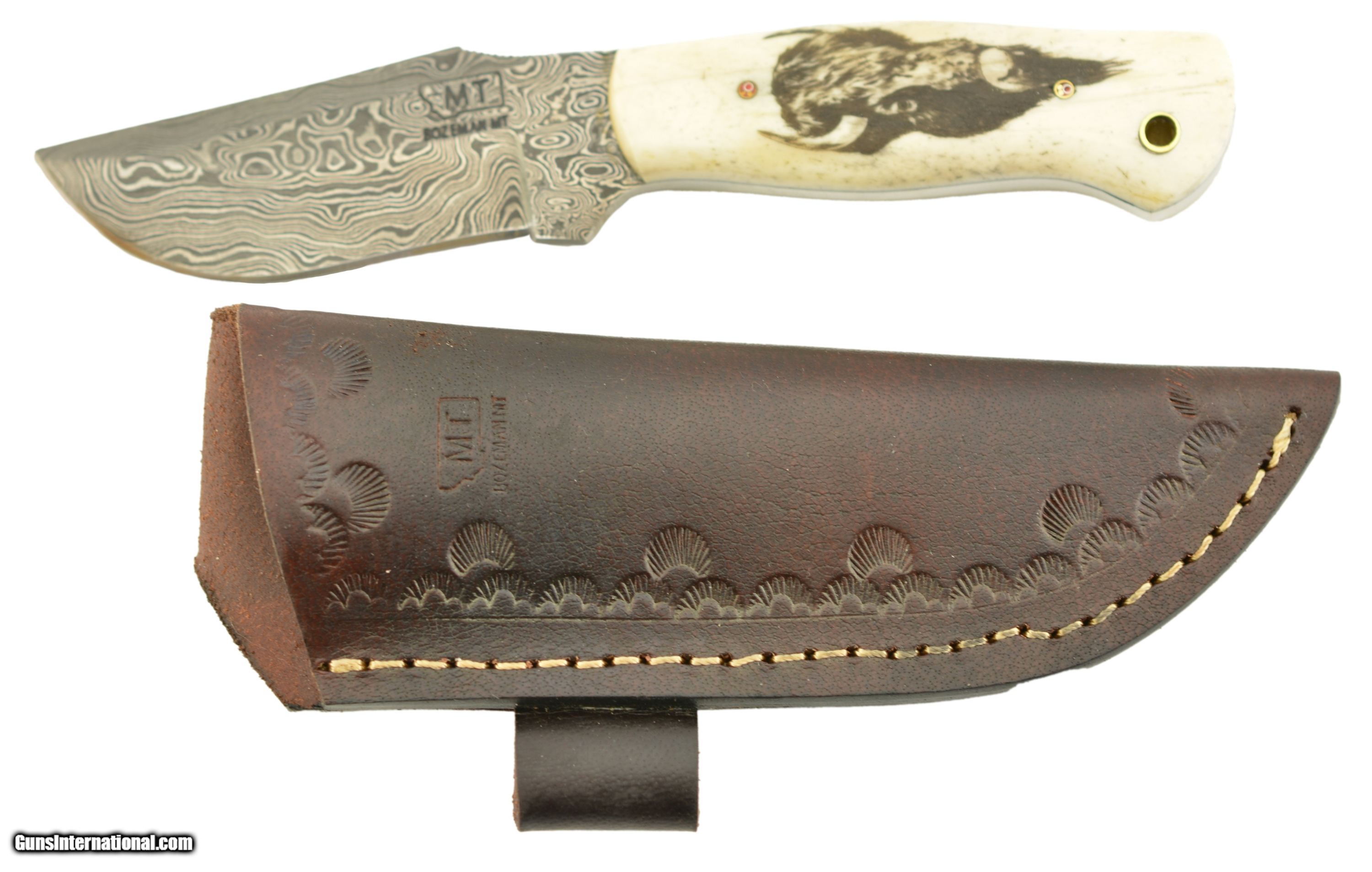 Description: This is an, as new Montana Territories Knife Damascus, buffalo scrimshawed 4" skinning knife. The blade is stamped with the outline of the state of Montana "MT" in the outline with "Bozeman MT" underneath with an excellent Montana Buffalo scrimshaw artwork. The blade has been forged from 1095HC (High Carbon) steel and 15N20 Nickel Carbon, which is then heated and folded into 396 layers, creating the astounding “Damascus" steel. The knife has been paired with a Great American Bison Buffalo leather, hand crafted tooled sheath and stamped "MT Bozeman MT" with the outline of Montana. SOLD Manufacturer: MT Model: Knife |