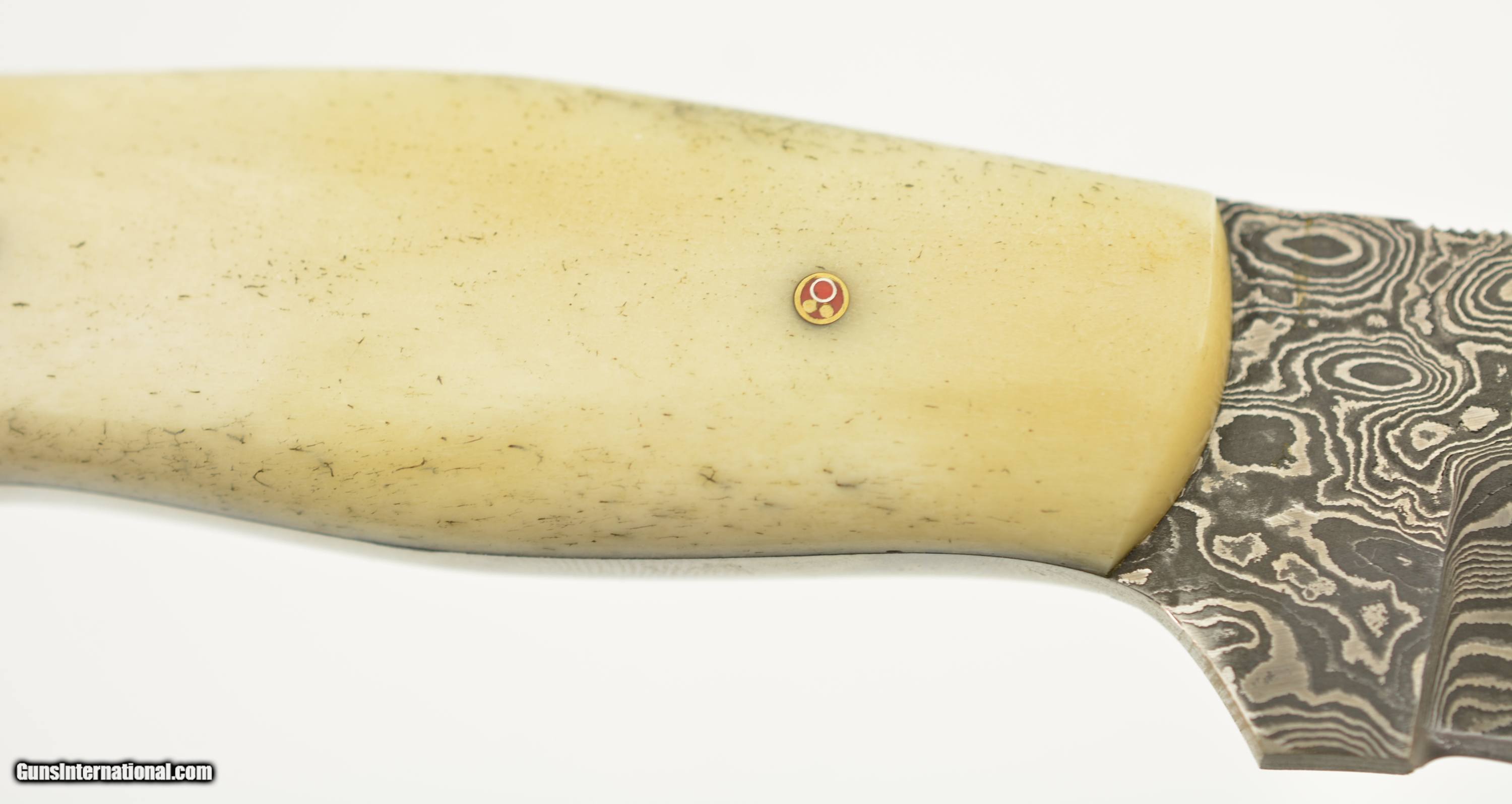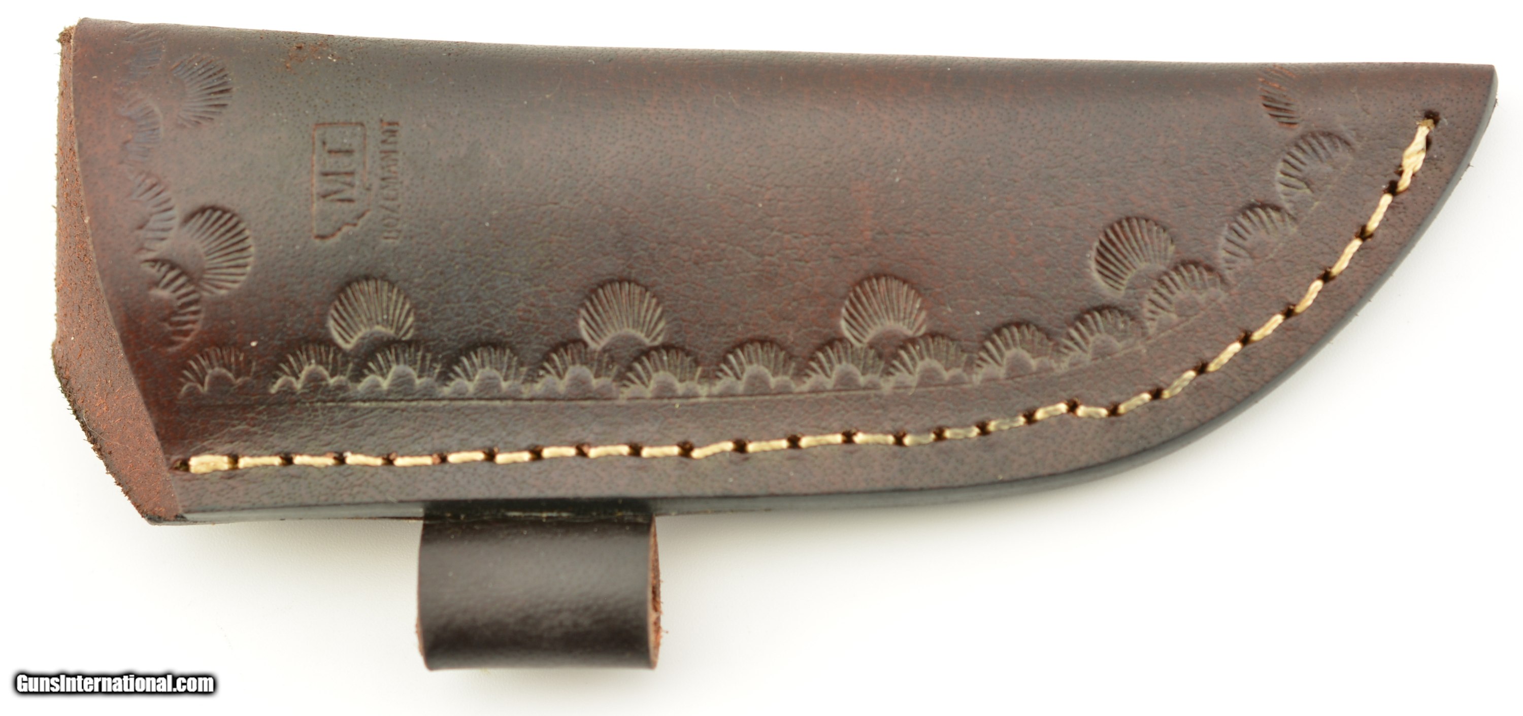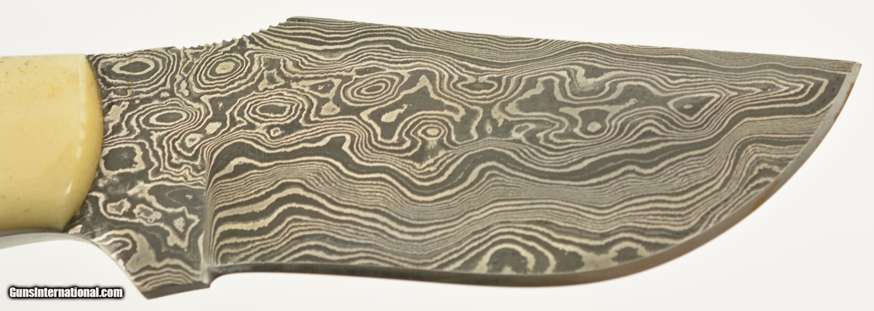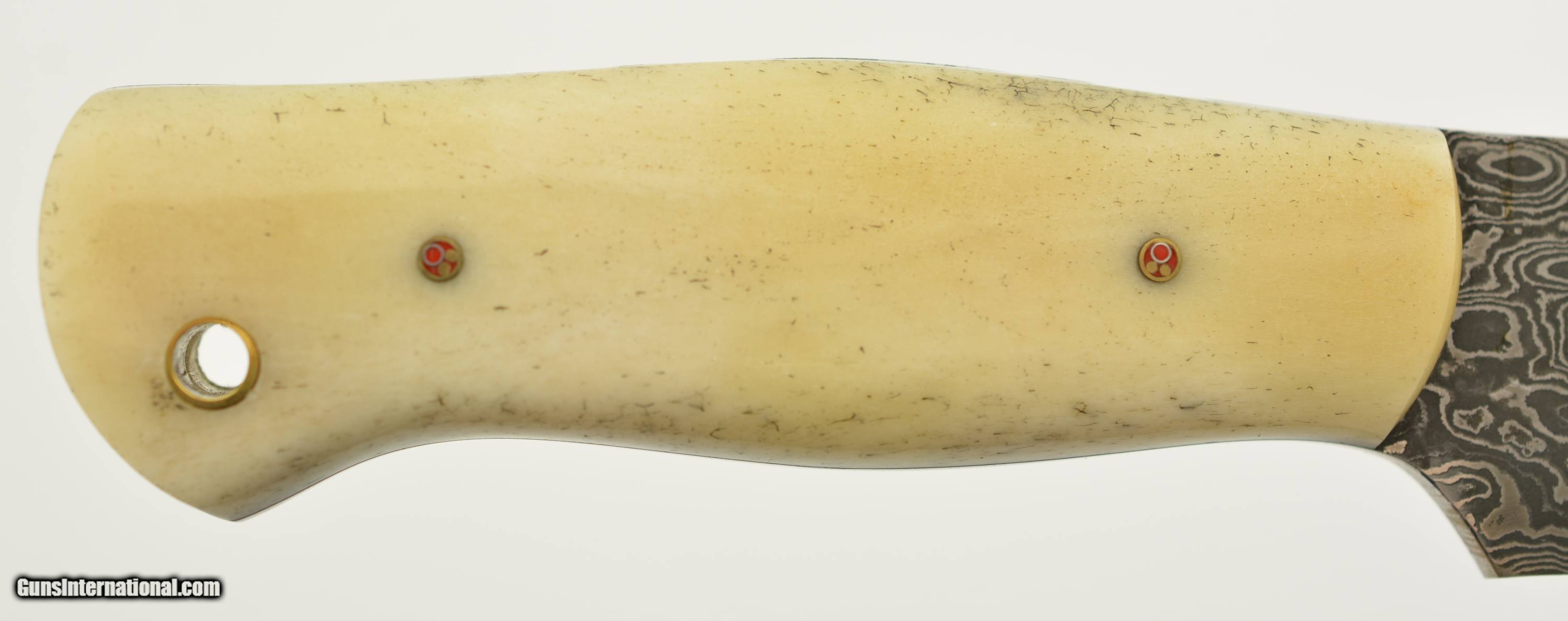 Description: This is an, as new Montana Territories Knife Damascus, buffalo scrimshawed 4" skinning knife. The blade is stamped with the outline of the state of Montana "MT" in the outline with "Bozeman MT" underneath with an excellent Montana Buffalo scrimshaw artwork. The blade has been forged from 1095HC (High Carbon) steel and 15N20 Nickel Carbon, which is then heated and folded into 396 layers, creating the astounding “Damascus" steel. The knife has been paired with a Great American Bison Buffalo leather, hand crafted tooled sheath and stamped "MT Bozeman MT" with the outline of Montana. SOLD Manufacturer: MT Model: Knife |