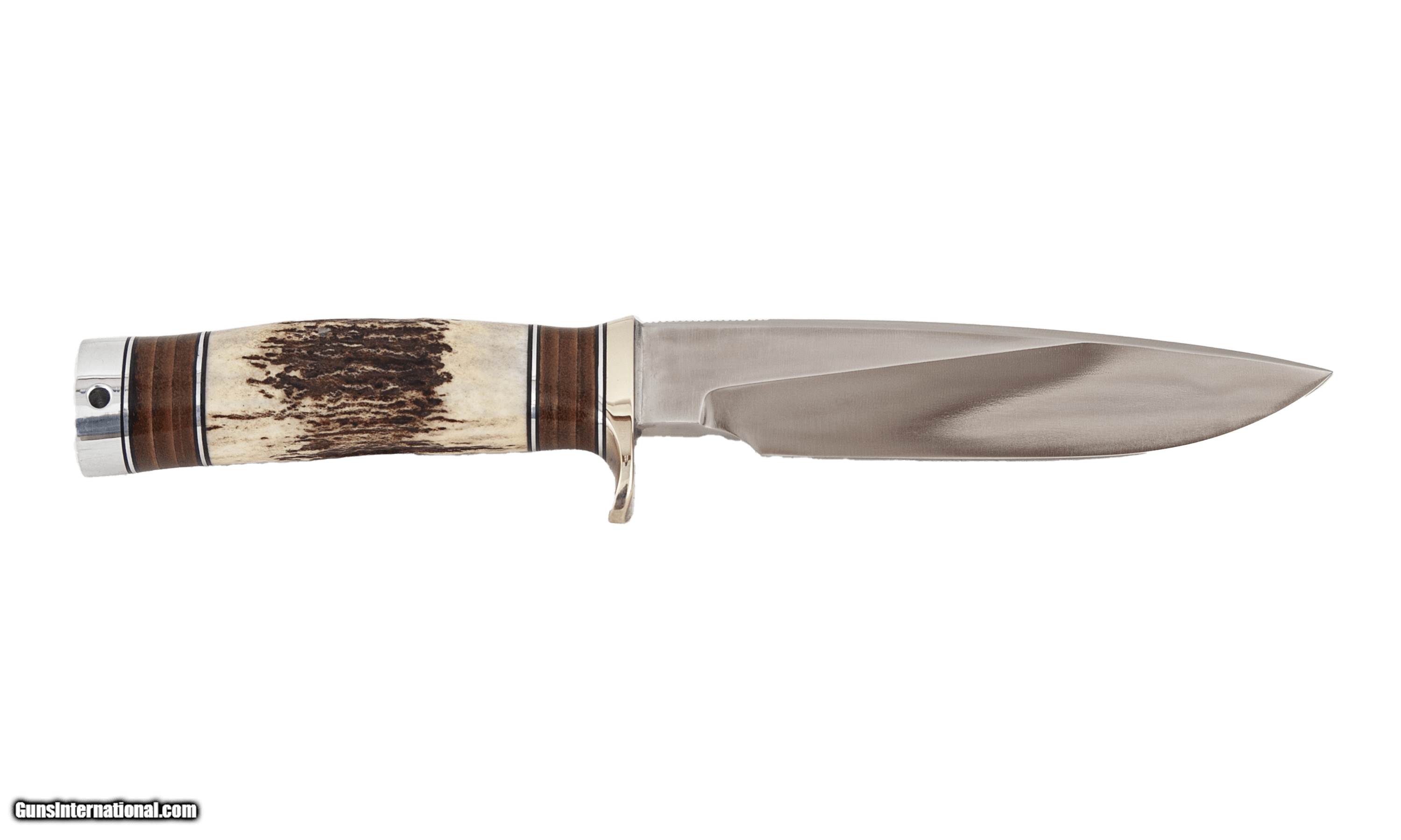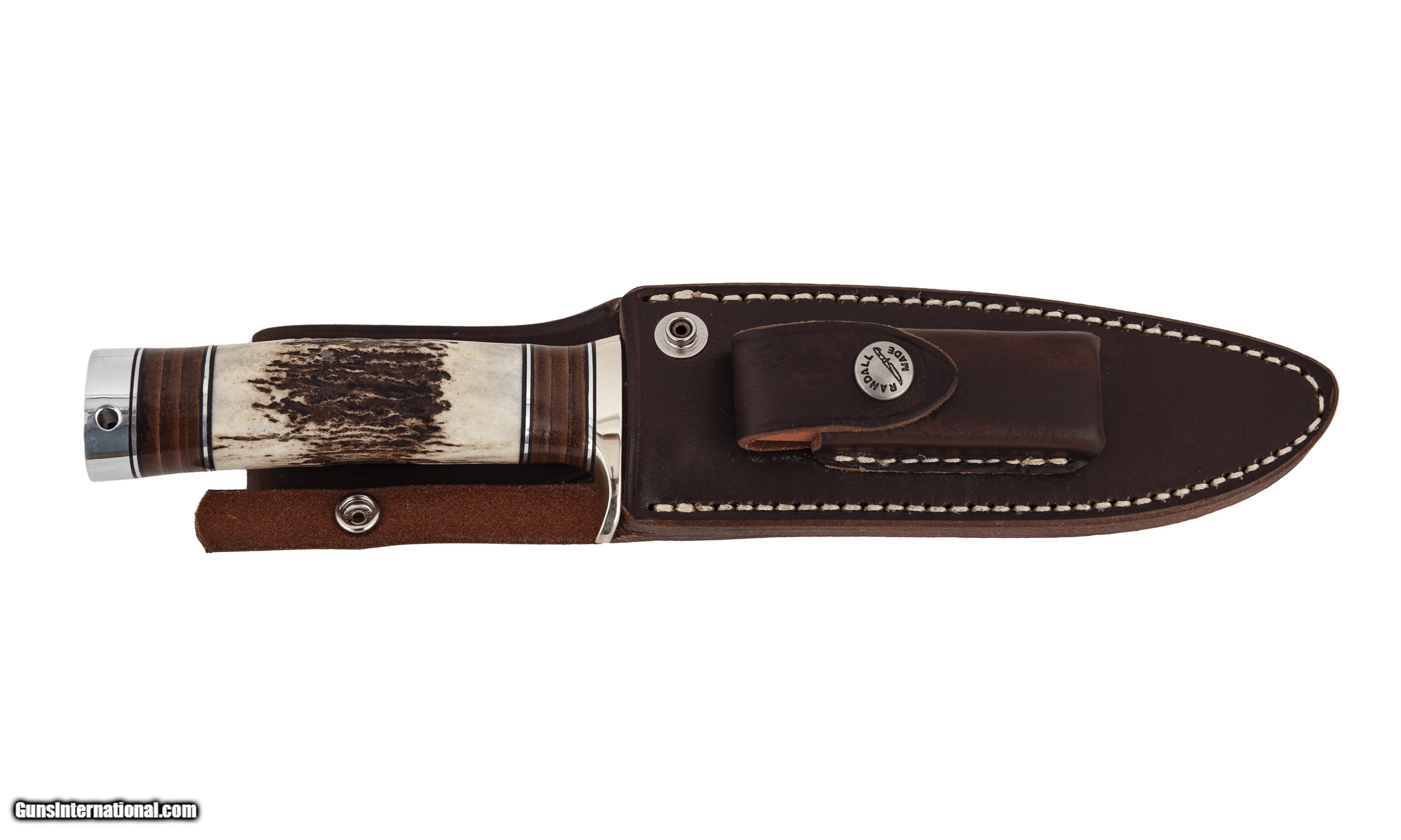 Description: 11" OAL, 6" blade, wax sheath with stone, stag handle. SOLD |