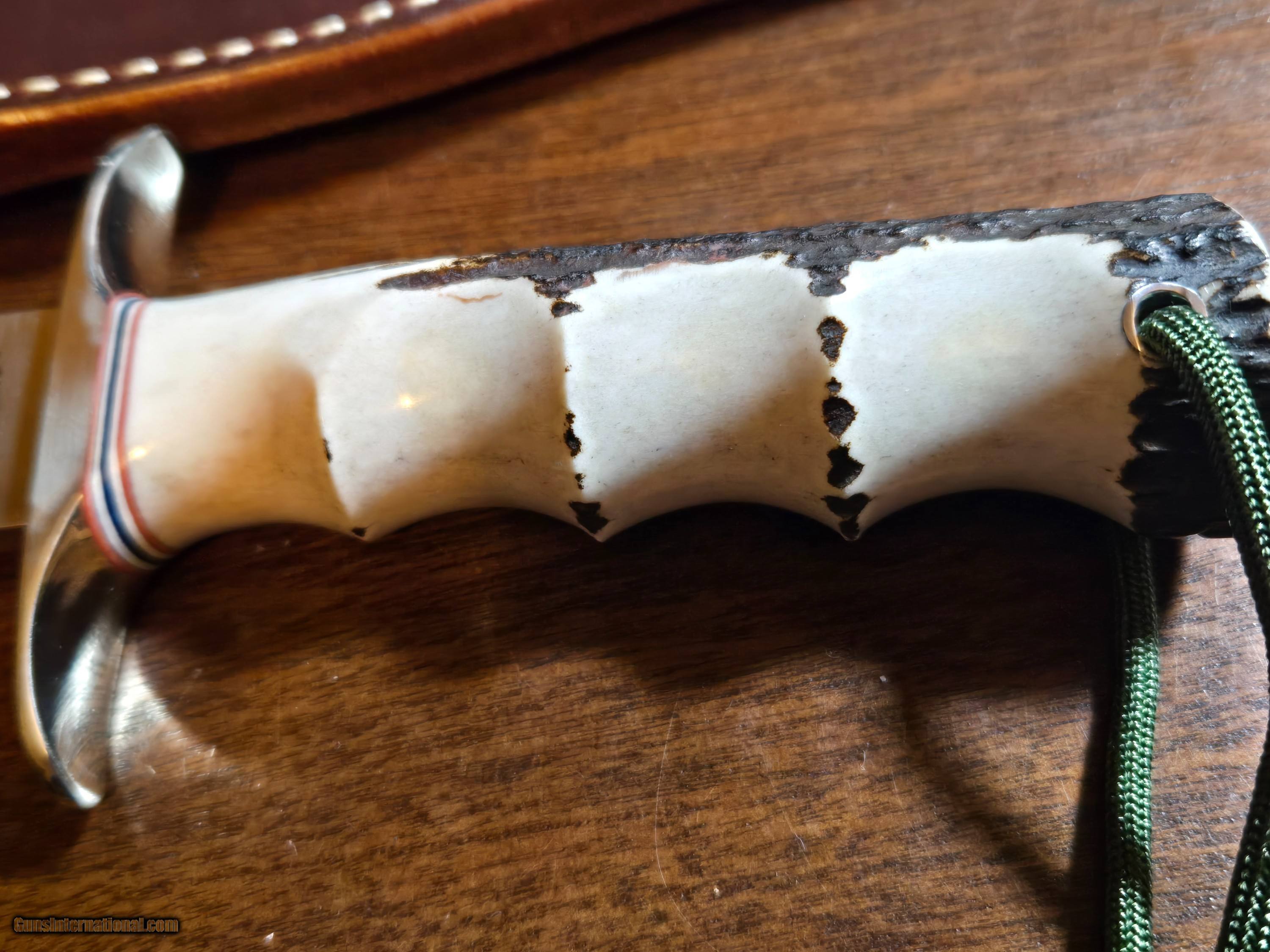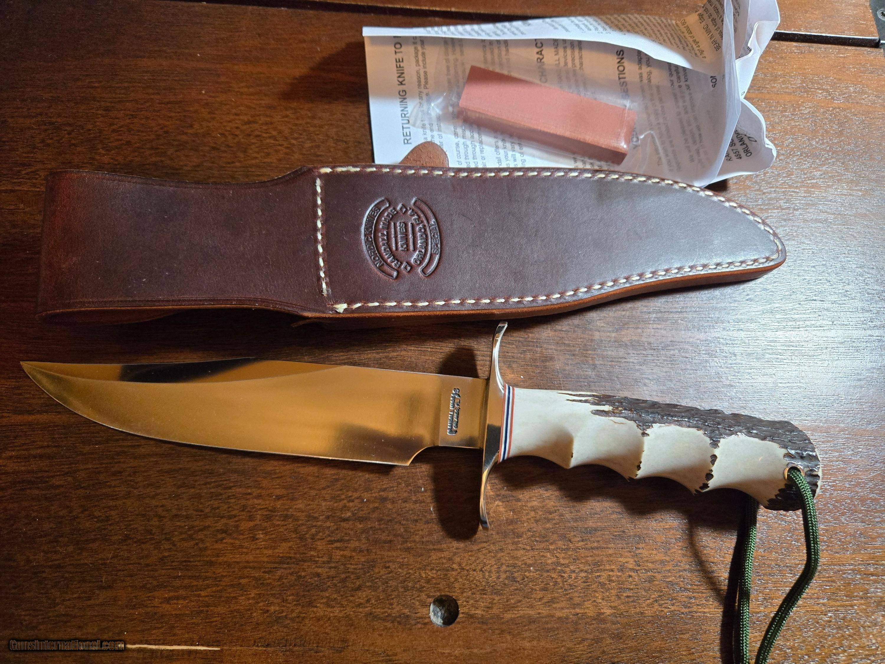 Description: Brand new from Randall 7 inch SS BLADE NICKEL SILVER GUARD Beautiful Stag HANDLE WITH FINGER GRIPS THONG HOLE SERIAL #901 NO HONE ORIGINAL LEATHER SHEATH Very nice Randall Bowie SOLD |