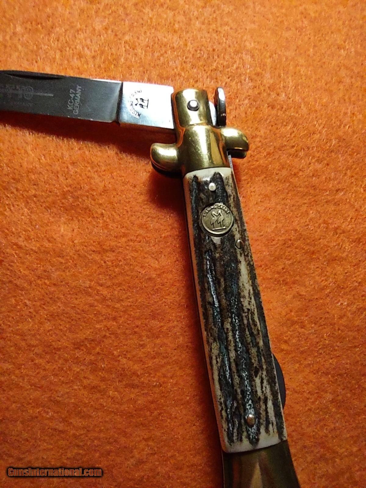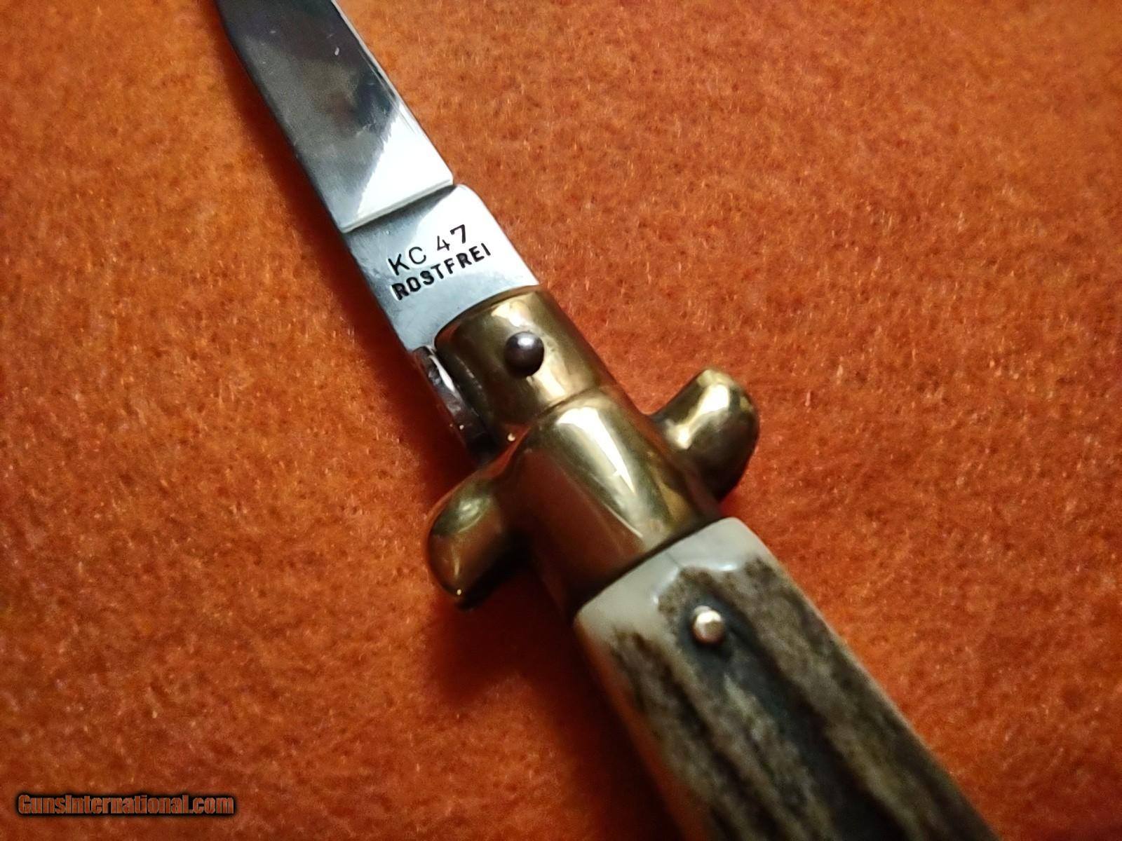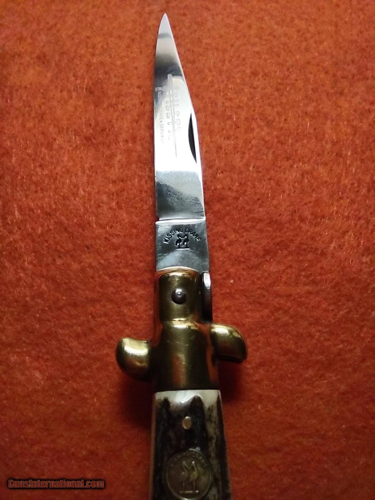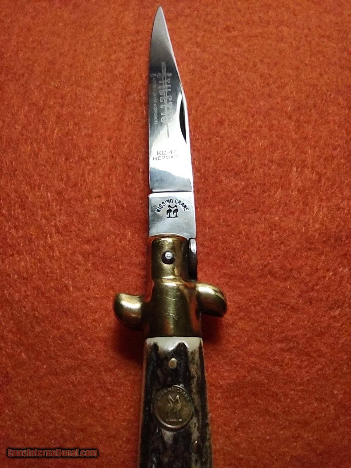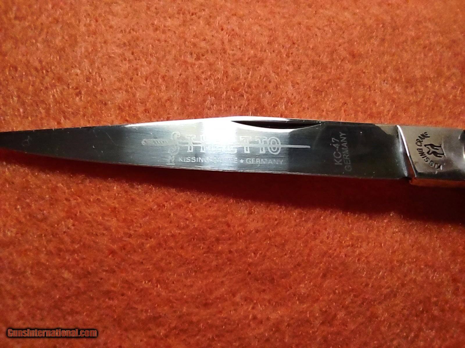 Description: ROSTFREI KISSING CRANE (KC47) lockback stiletto folding knife with overall length of 8 inches with beautiful pinned stag handles with medallion on one side, brass ends and brass rivets. The ROSTFREI exceptional vintage quality is quickly noticed. This knife was made in Soligen, Germany no earlier than 1993 with the KC prefix. ROSTFREI is in its 187th year of making high quality knives. The price of this masterpiece is $150 with free shipping. Call or text me at 318-780-4242 if you are interested. Look closely at the pictures. SOLD |