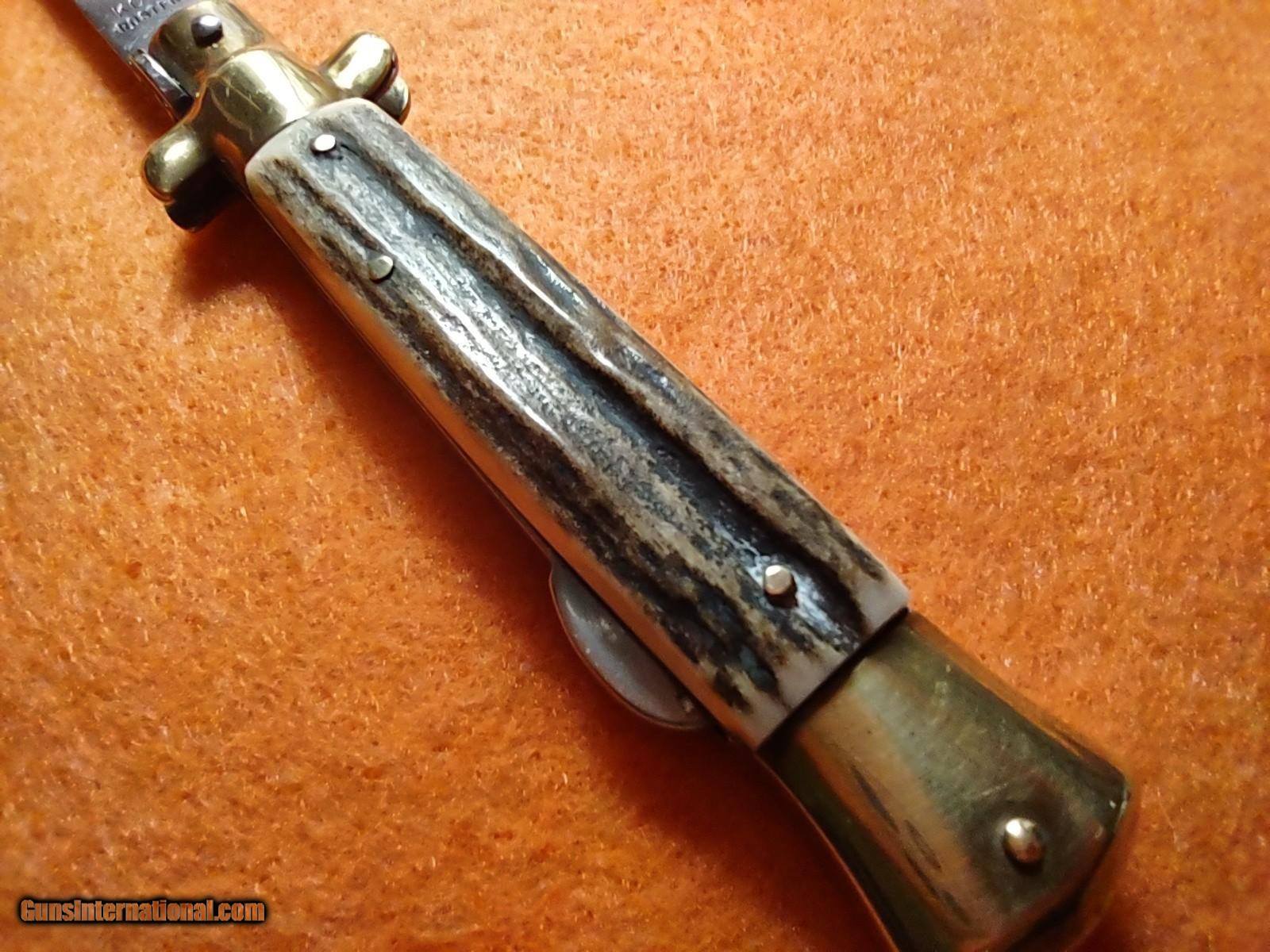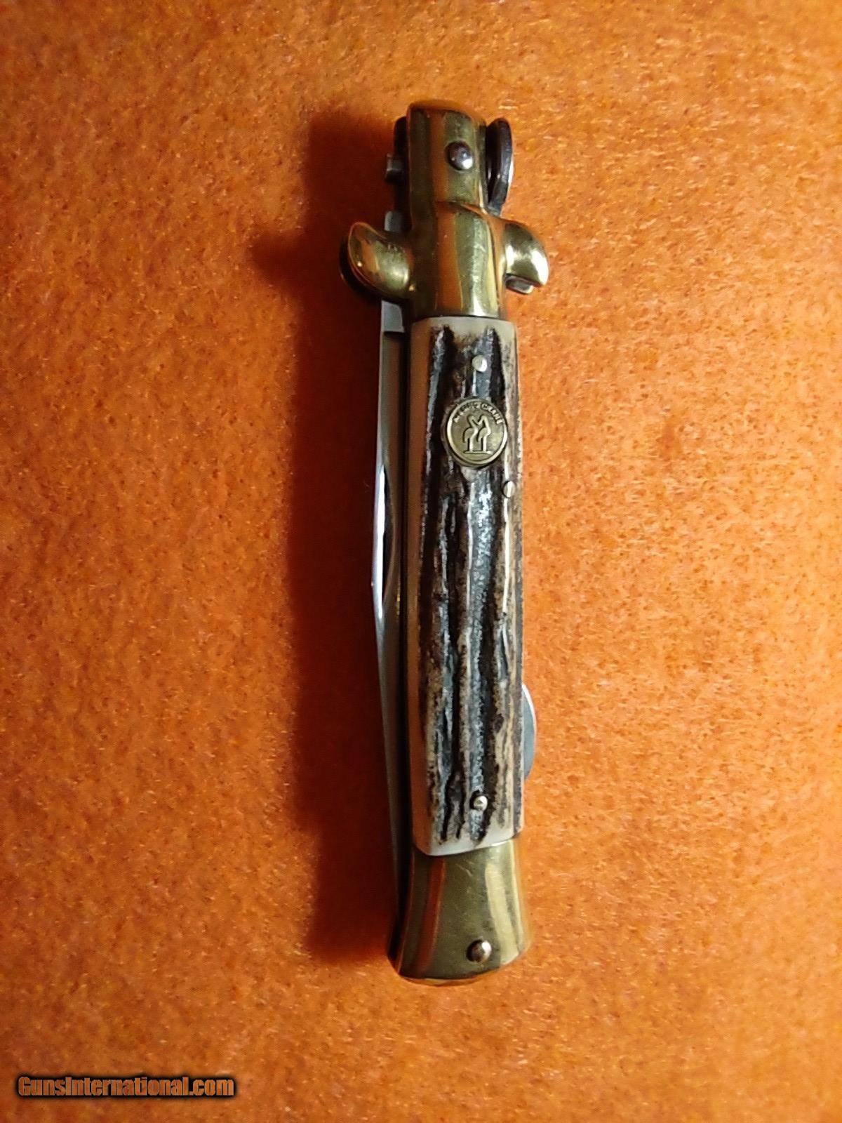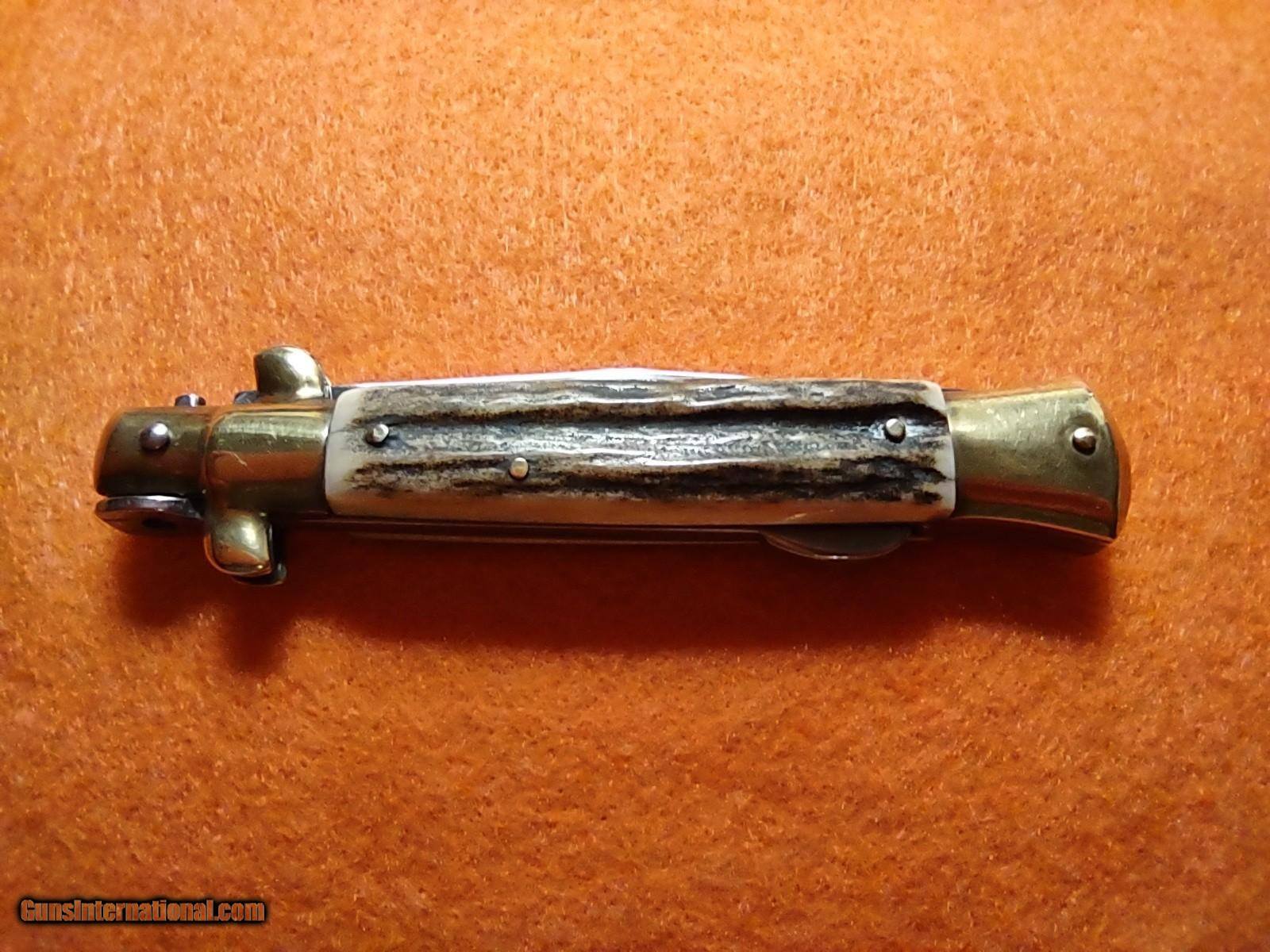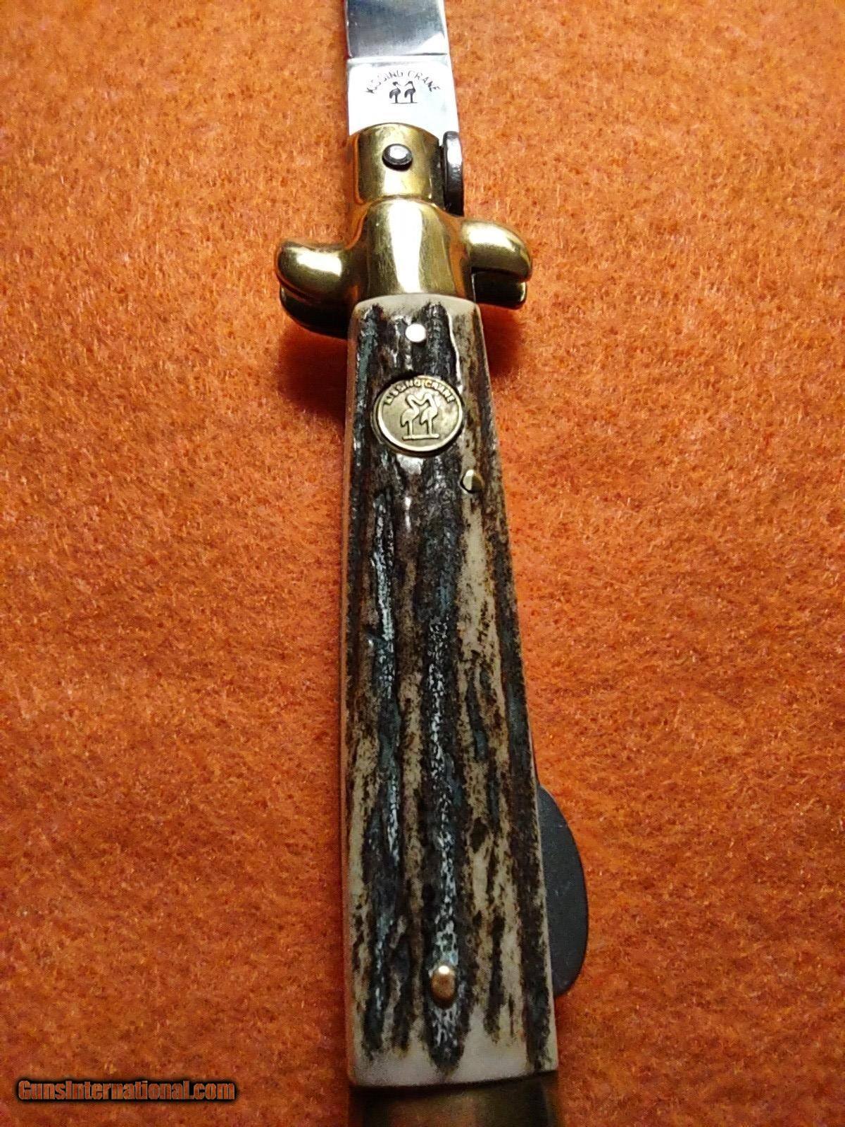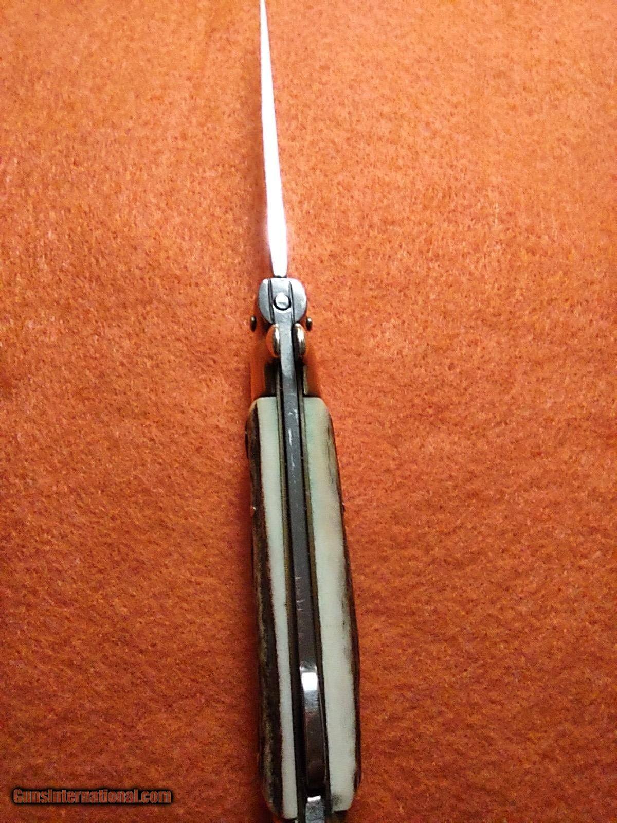 Description: ROSTFREI KISSING CRANE (KC47) lockback stiletto folding knife with overall length of 8 inches with beautiful pinned stag handles with medallion on one side, brass ends and brass rivets. The ROSTFREI exceptional vintage quality is quickly noticed. This knife was made in Soligen, Germany no earlier than 1993 with the KC prefix. ROSTFREI is in its 187th year of making high quality knives. The price of this masterpiece is $150 with free shipping. Call or text me at 318-780-4242 if you are interested. Look closely at the pictures. SOLD |