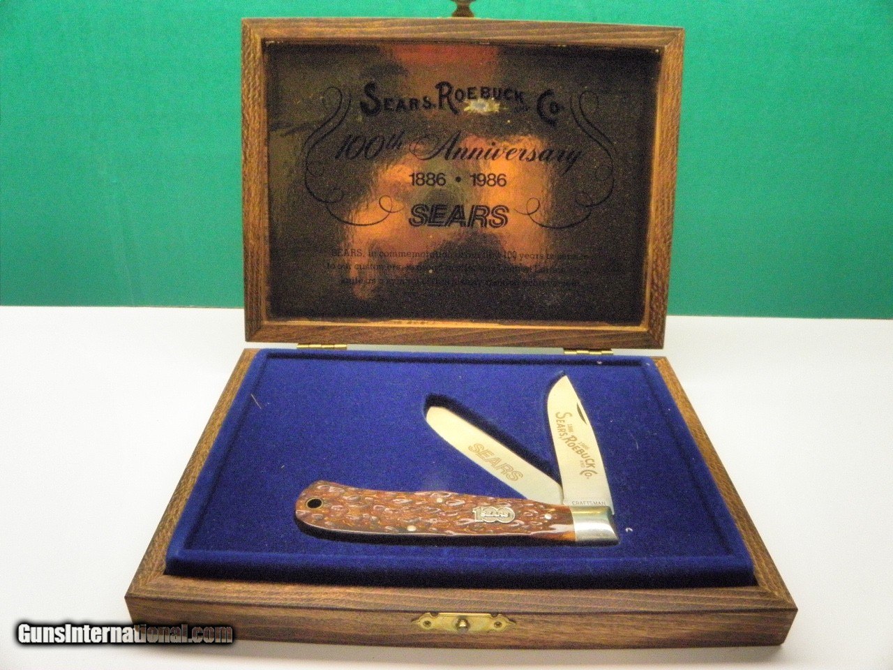 Description: Vintage 1986 Sears & Roebuck 100th Anniversary Trapper Knife MINT It comes in a Wood Presentation case1986. Never used or carried. Made in USA for the Sears 100th anniversary in 1986. The Genuine Bone Handles are Perfect Wood Case is Excellent the wood is Mint but the Gold Foil Lable has some rub marks