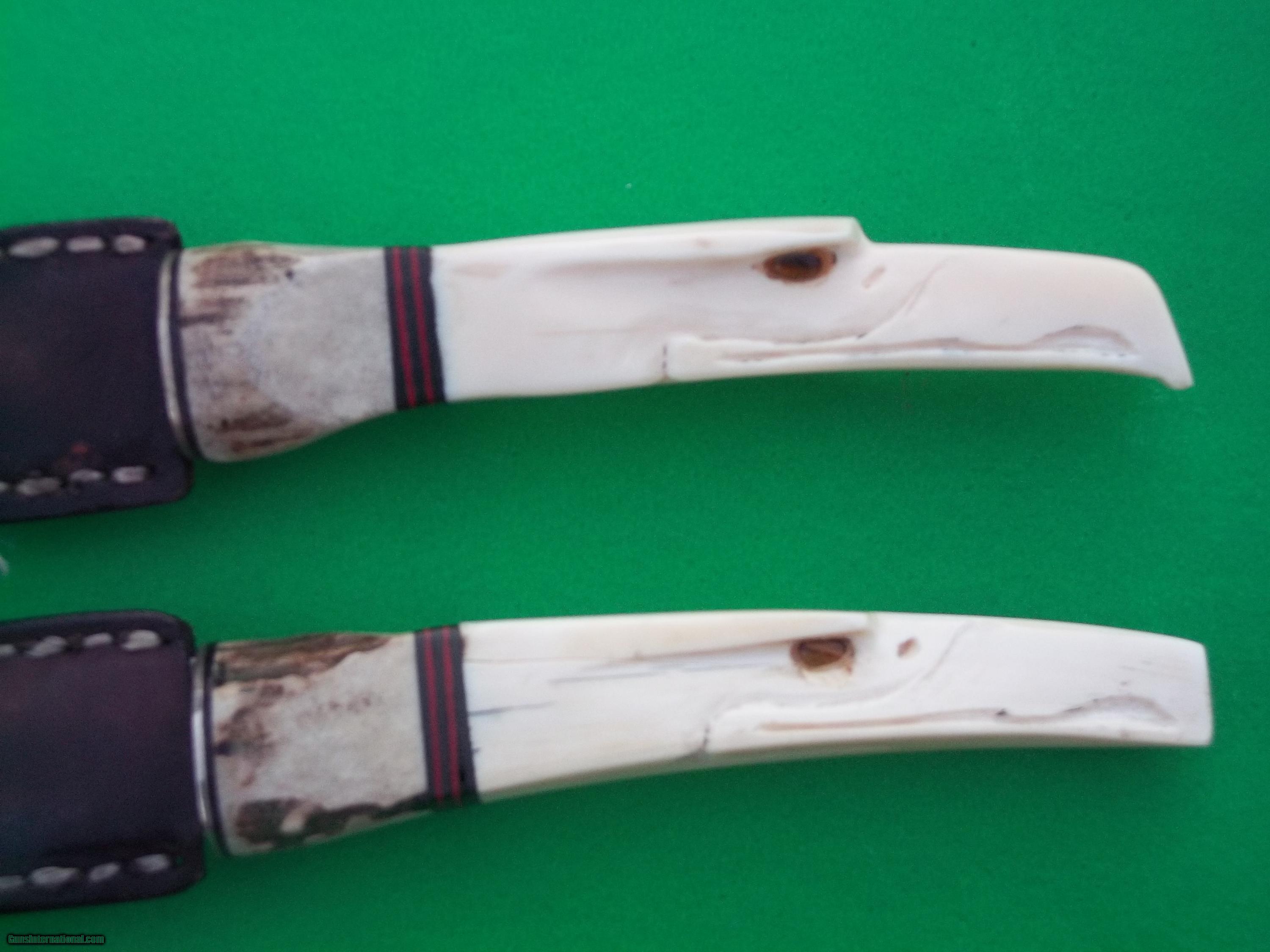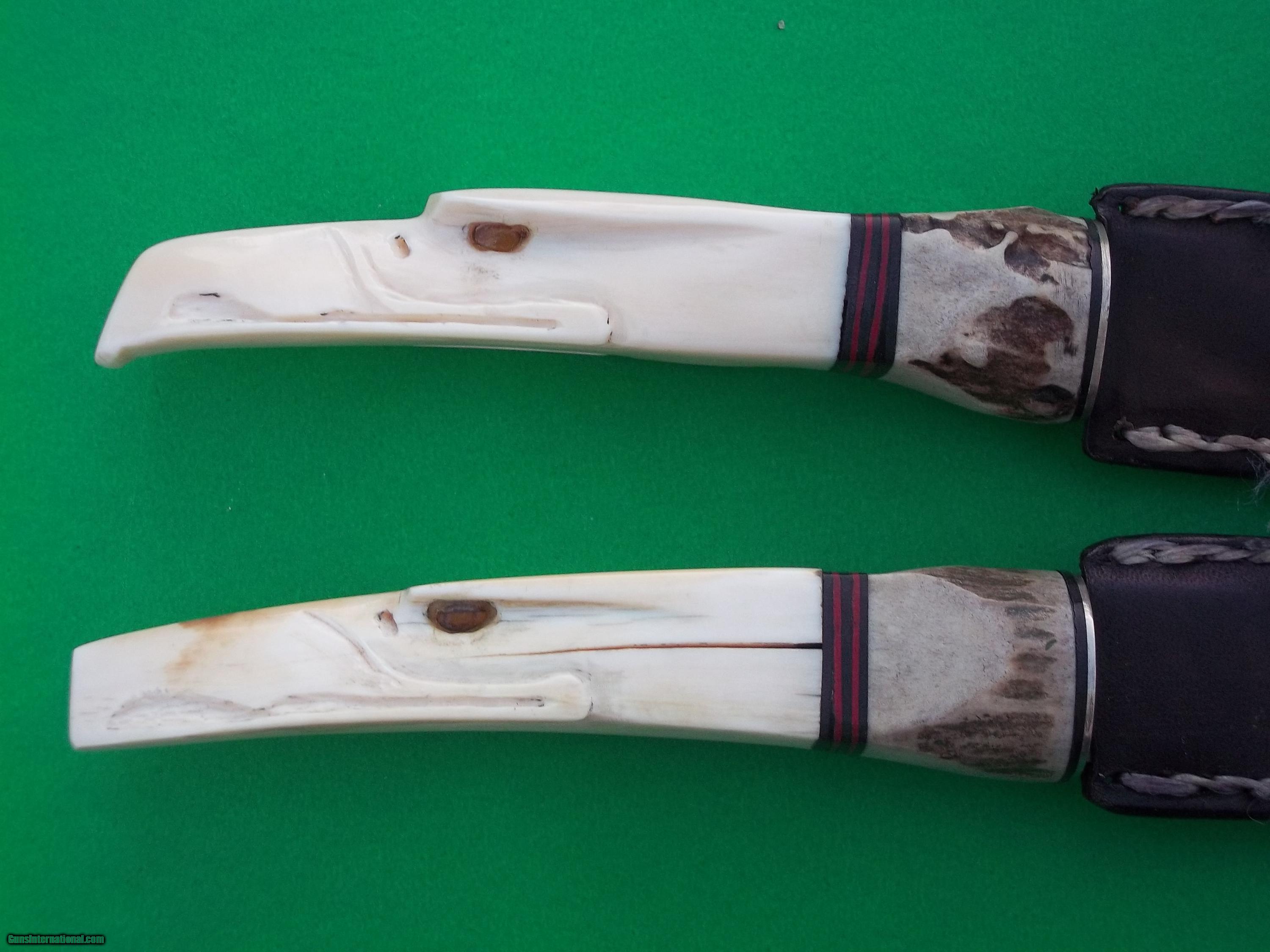 Shiva Ki's unique, one-of-a-kind two Damascus bladed daggers set with carved eagle haed handles and selected stag antler was made in 1975 when he entered the custom knife business. He never reproduce it is the only one that was ever made. Blade length is almost 4-5/8". Stunning, spectacular those are the knives of Master Shiva Ki. He has always search the world over for the most exotic and limited availability materials for his finest knives-never to be duplicated. He took the finest of these rare pieces and made one-of-a-kind work-of-art. The rarest of fossil ivories, oosics, pipe quality burls and briars, rare African exotic horns-choice of stag, ivory teeth and African elephant tusks. He has used more bone, horns and ivories than woods and even less micartas. While black linen micarta is preferred for its durability by many, its use does not make the knife any cheaper over say cocobolo wood, it only cheapens the custom-ordered knife..... His knives are as I stated very unique and exquisite to say the least, owned by users and collectors worldwide. All are hand forged to shape, hand packed and triple heat treated from spine to edge and clay-tempered for some models. Note: The set will not be broken-Free shipping within the Continental United States USPS with tracking number. Thank you for looking.