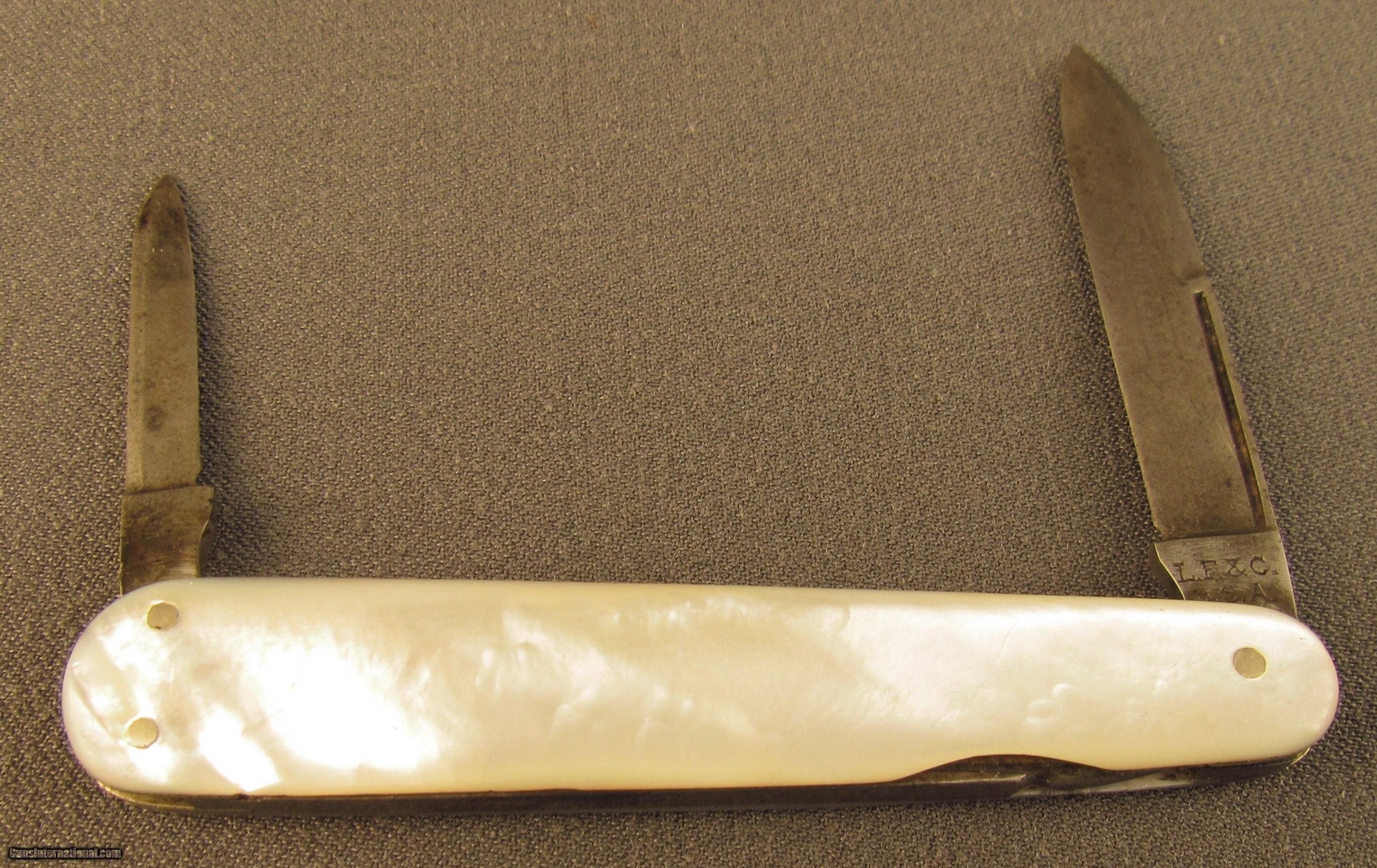 Description: This Landers Frary & Clark product features mother-of-pearl scales, brass pins, file worked brass bolsters and a manicure blade. This knife measures just under three inches closed. The spear pointed pocket blade is marked "LF&C" over "USA" on ricasso; opposite shows "73399". This blade has been cleaned leaving traces of an etched panel reading "Universal" on left side. Pen blade also has a spear point, both blades have been sharpened. The manicure blade has a small file and rounded tip. A neat old penknife by a noted American maker; there was more to this company than just trench knives! SOLD Manufacturer: LF&C Model: Knife |