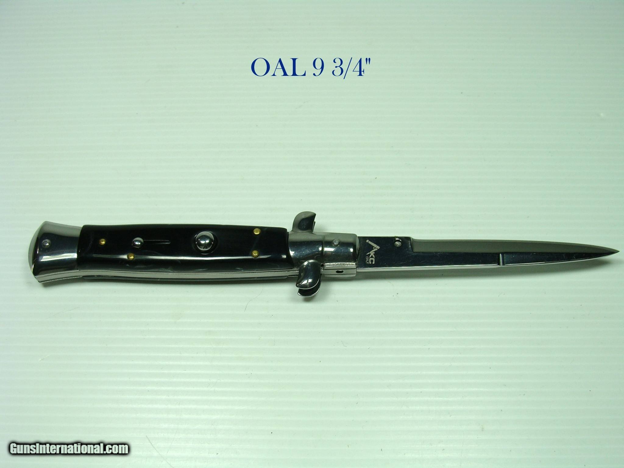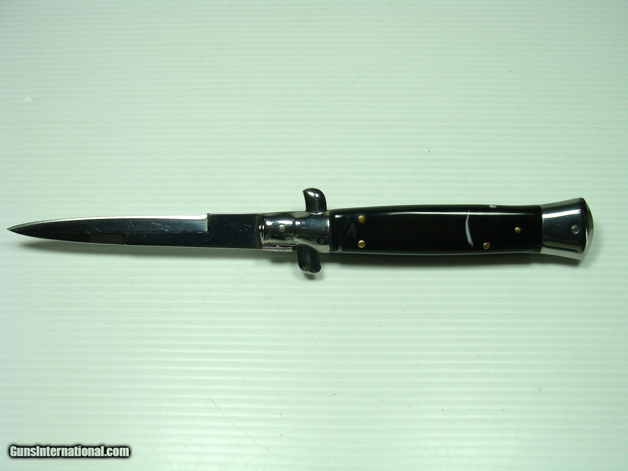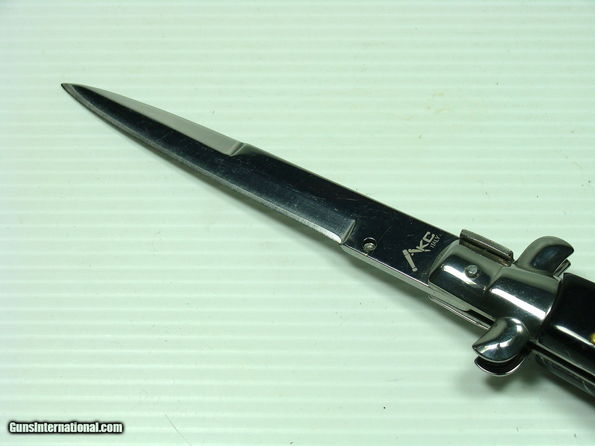 Description: SUPERB QUALITY SWITCHBLADE BY AKC ITALY ETCHED ON THE BLADE RICASSO (AUTOMATIC KNIFE CO.) FACTORY NEW IN THE BOX W/POUCH. (This is an AKC CLONE). 9 3/4" Open Length. RAZOR SHARP BAYONET BLADE IS 4 1/4". This knife is precision made. The blade fires hard & fast and locks up tight every time. No wobble! There is a Swivel Bolster Lock Release. The blade is aligned to the center of the liners. The thick black handles fit precisely to the frame, and give a hefty feel when held. The pins are brass. This knife is in every way equal to many higher priced Italian switchblades. Note! The box has some "wrinkles". ~~~~~~~~~~~~~~~~~~~~~~~~~~~~~~~~~~~~~~~~~~~~~~~~~~~~~~~~~~~~~~~~~~~~~~~~~~~~~~~~~~~~~~~~~~~~~~~~~~~~~~~~~~~~~~~~~~~~~~~~~~~~~~~~~~~~~~~~~~~~~~~~~~~~~~~~~~~~~~~~~~~~~~~~~~~~ The buyer certifies that he or she is of lawful age and is not prevented by any law from the purchase or possession of these items. The buyer is responsible for knowing, understanding and obeying all International, Federal, State and Local laws concerning the purchase and possession of these items. SOLD |