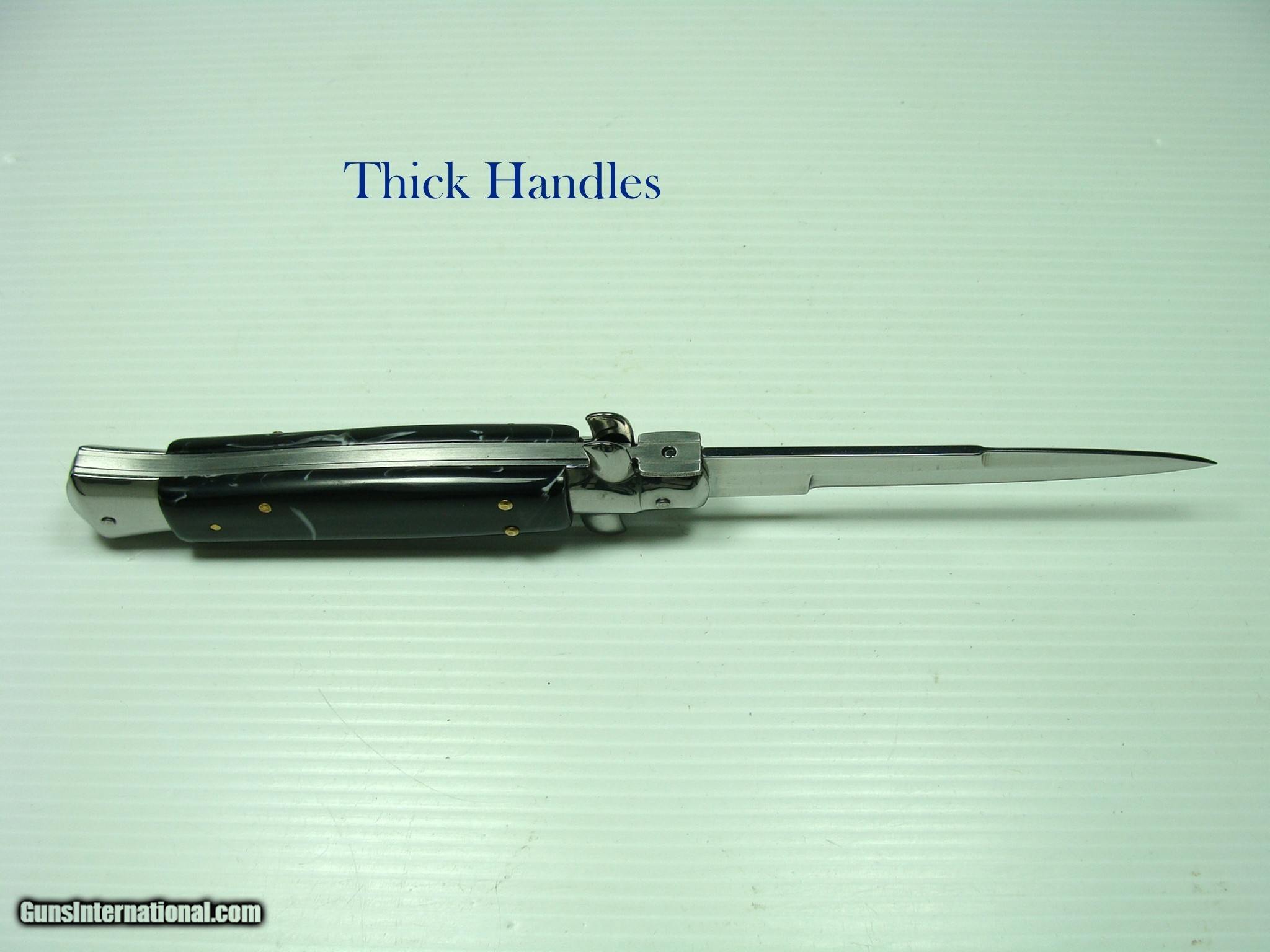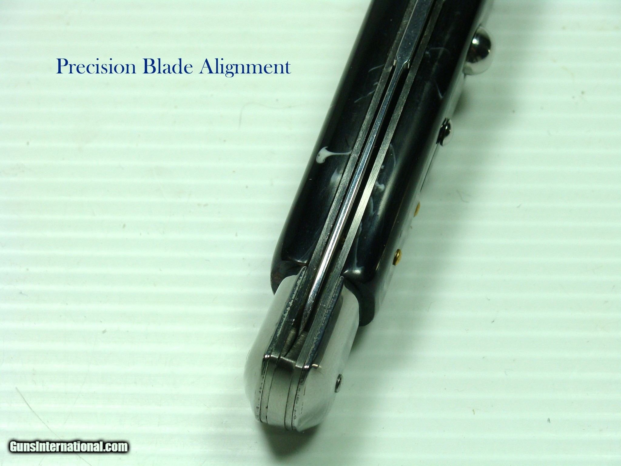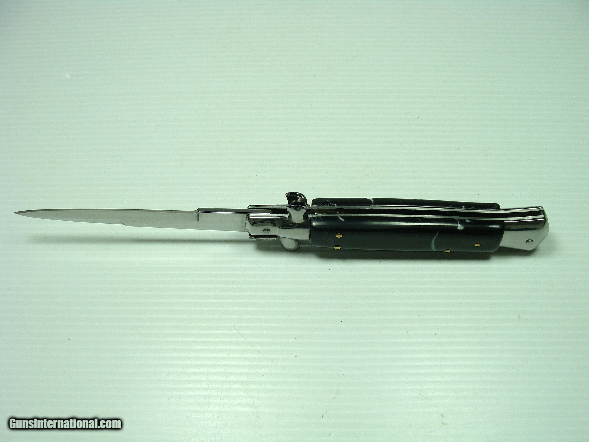 Description: SUPERB QUALITY SWITCHBLADE BY AKC ITALY ETCHED ON THE BLADE RICASSO (AUTOMATIC KNIFE CO.) FACTORY NEW IN THE BOX W/POUCH. (This is an AKC CLONE). 9 3/4" Open Length. RAZOR SHARP BAYONET BLADE IS 4 1/4". This knife is precision made. The blade fires hard & fast and locks up tight every time. No wobble! There is a Swivel Bolster Lock Release. The blade is aligned to the center of the liners. The thick black handles fit precisely to the frame, and give a hefty feel when held. The pins are brass. This knife is in every way equal to many higher priced Italian switchblades. Note! The box has some "wrinkles". ~~~~~~~~~~~~~~~~~~~~~~~~~~~~~~~~~~~~~~~~~~~~~~~~~~~~~~~~~~~~~~~~~~~~~~~~~~~~~~~~~~~~~~~~~~~~~~~~~~~~~~~~~~~~~~~~~~~~~~~~~~~~~~~~~~~~~~~~~~~~~~~~~~~~~~~~~~~~~~~~~~~~~~~~~~~~ The buyer certifies that he or she is of lawful age and is not prevented by any law from the purchase or possession of these items. The buyer is responsible for knowing, understanding and obeying all International, Federal, State and Local laws concerning the purchase and possession of these items. SOLD |