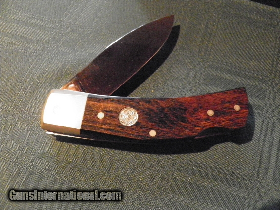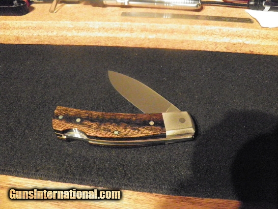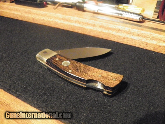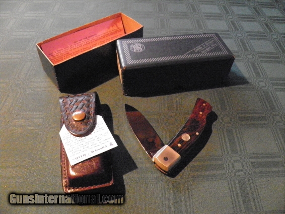 Description: Smith & Wesson Folding Hunter Model 6060 SALE PENDING Designed by Blackie Collins in circa 1974 3.5" drop point factory edge never sharpened or used nickel silver bolsters Wessonwood handles NIB with holster $250 SOLD |