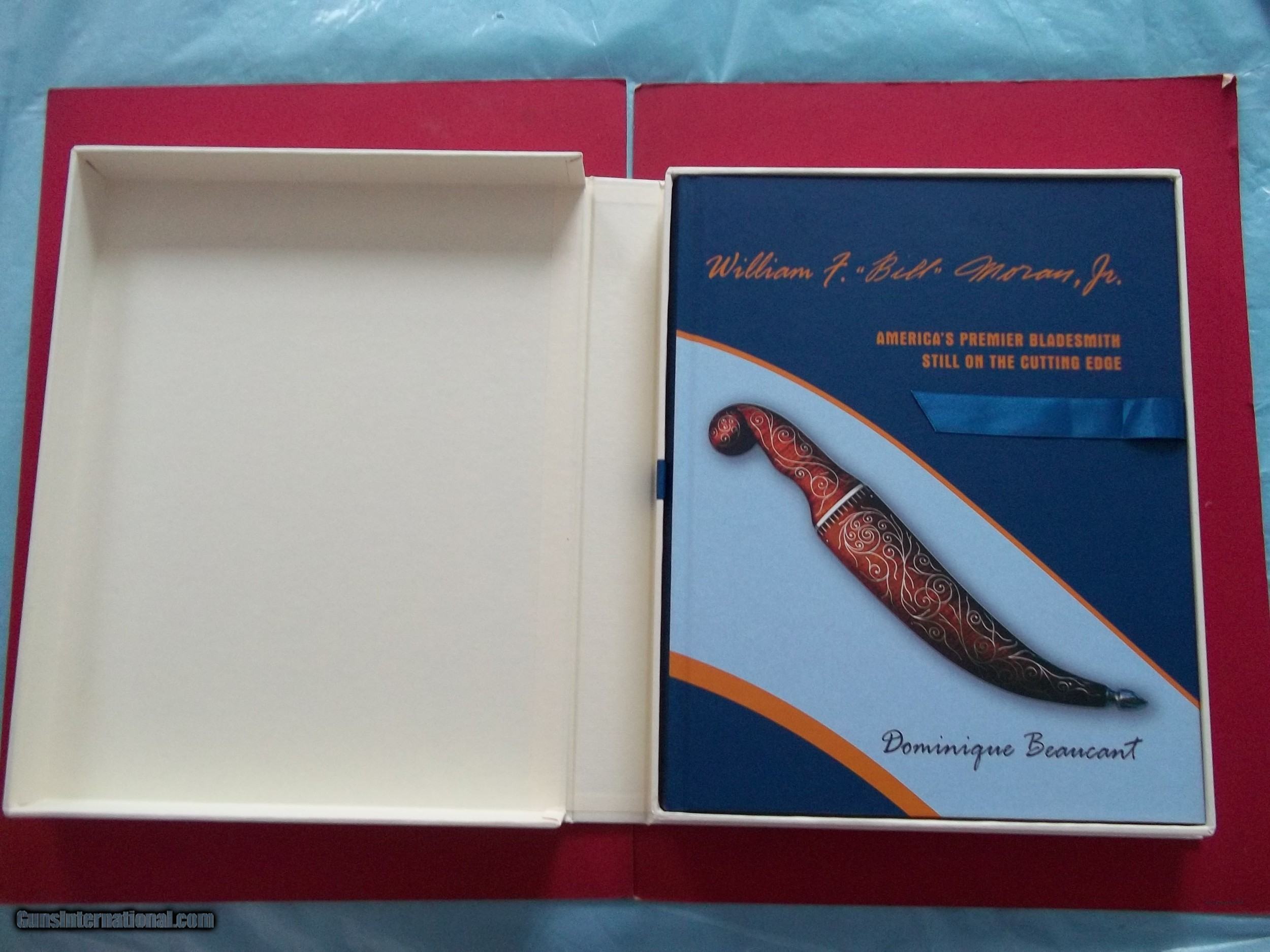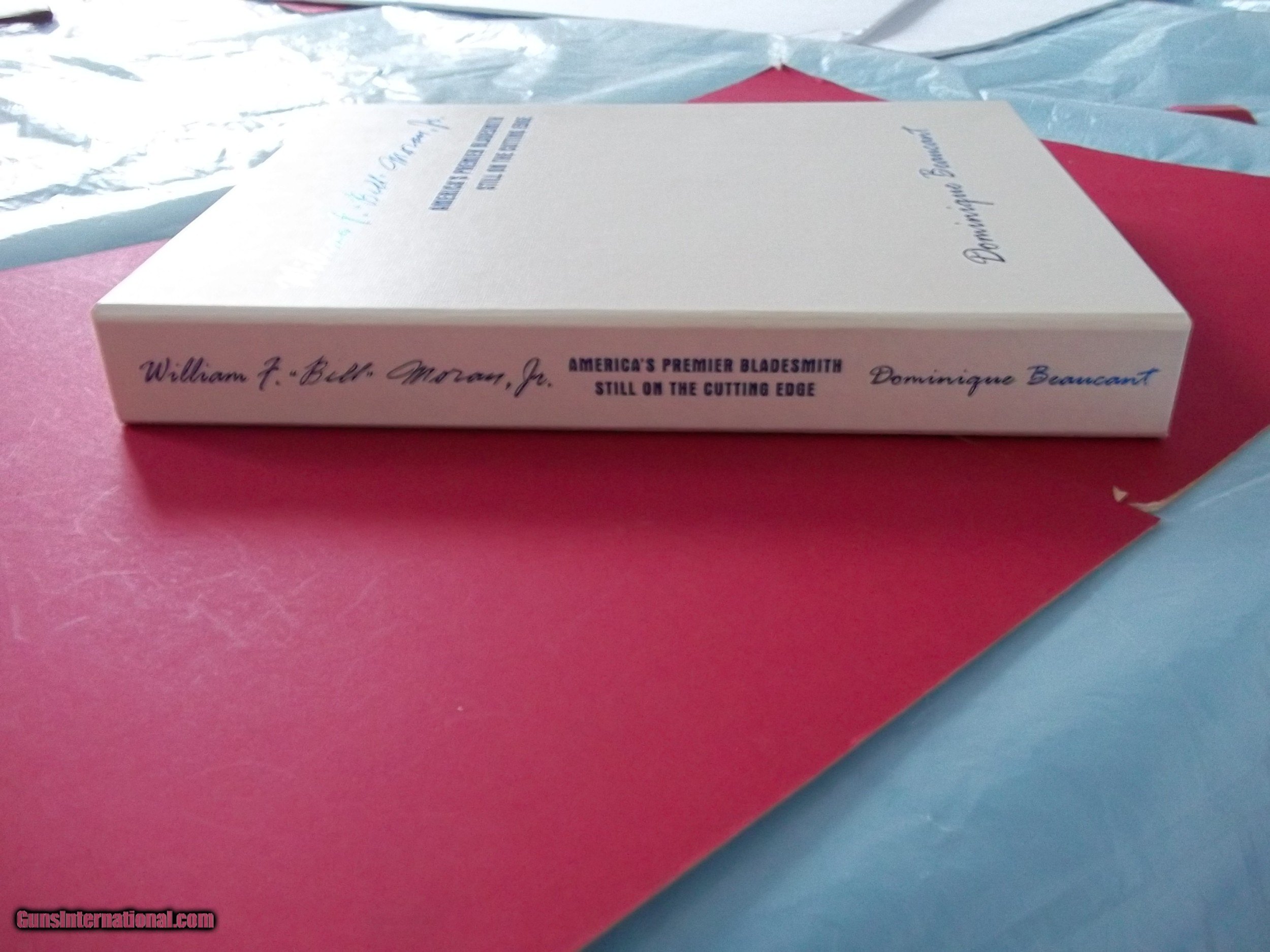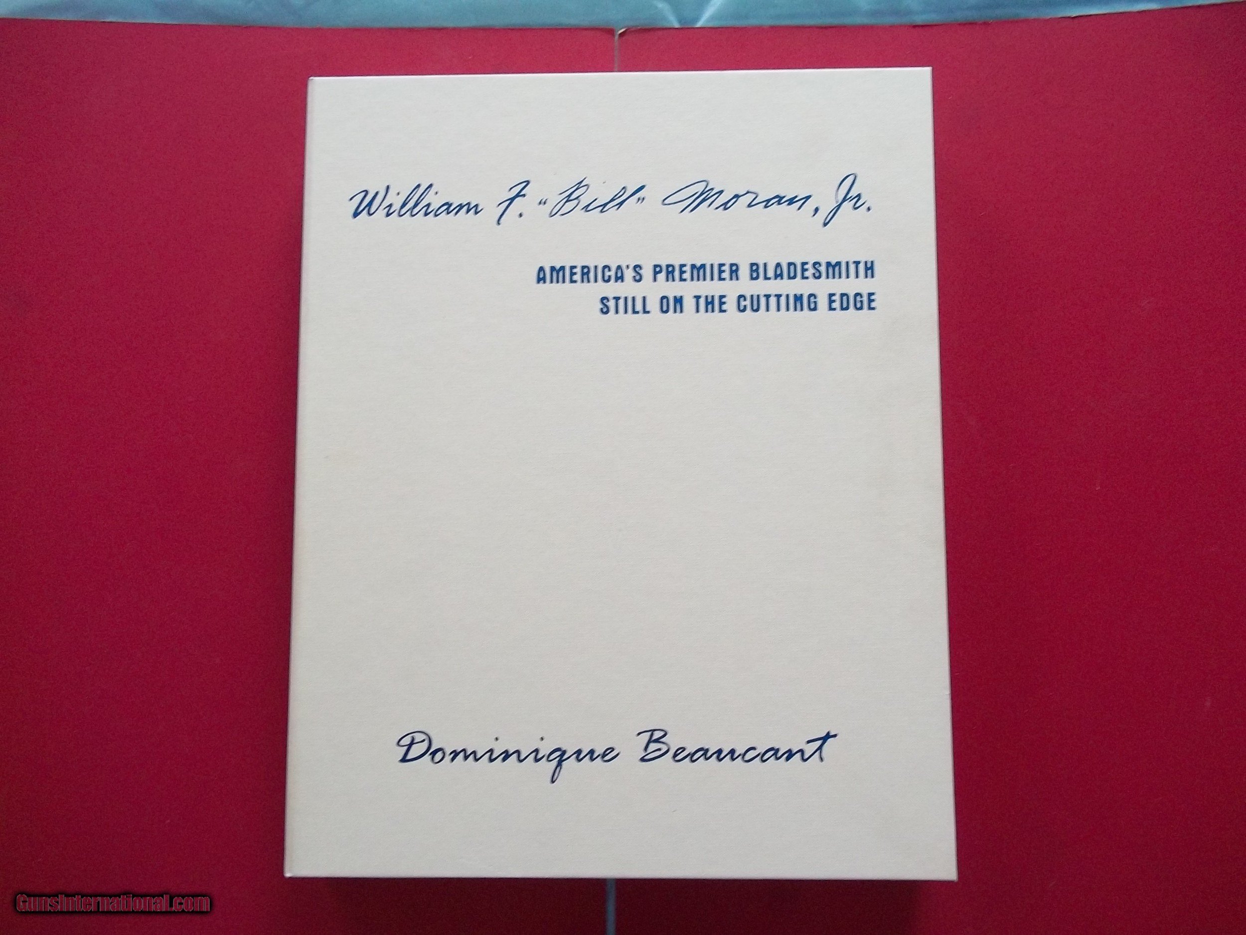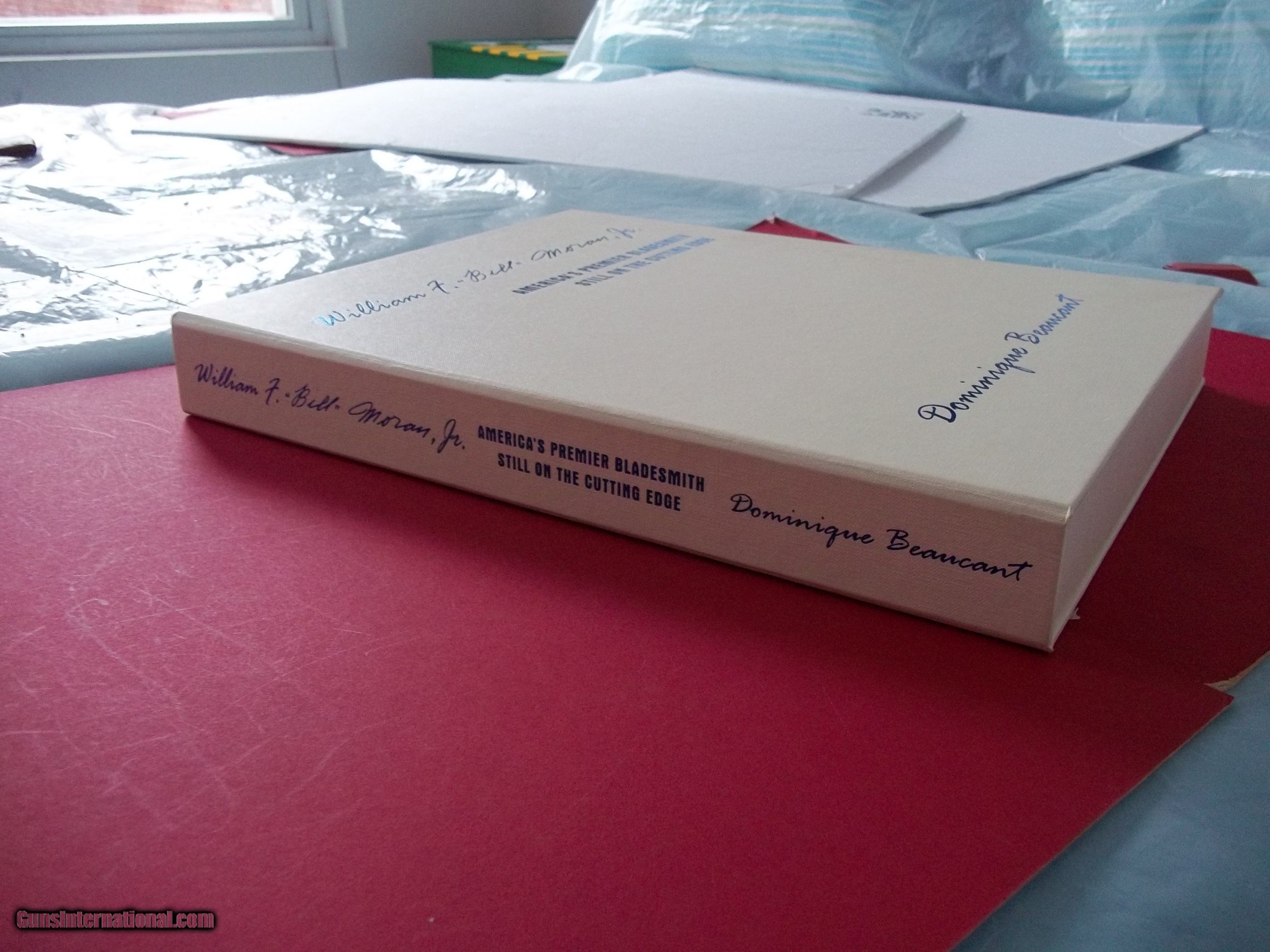 New luxury collector's book : William F. "Bill" Moran, Jr. America's Premier Bladesmith-Still On The Cutting Edge, to pay tribute to the legendary Maryland blacksmith, widely regarded by his peers as the world's greatest ever bladesmith. Only 300 copies are being printed, (there will be no reprint) of the hefty tome that contains 314 pages, which is a historical and graphical account of his illustrious career that included text, countless never-before-seen photographs (over 630 in all) and most recently uncovered important facts and information on the life and times of Bill Moran. Offered with a raised embossed front cover, case bound deluxe full clamshell box, with 150 Pts. cover, 120 Pts, side walls, 43 lbs. translucent Vellum sheet with imprint on it, (see picture # 12) . The books weighs over 10 lbs.12.8 oz. The book's main title is taken from Bill Moran own original handwriting, while the back cover is Bill's own original signature. This 11" X 14 " hardbound book has 11 chapters. Clamshell box is two ( 2) inches high, with high-gloss Rainbow 3 sky blue 3-D foil stamping on main title, sub title and author's name ( same on book's spine). Thank you for looking. USPS shipping included with tracking number. NOTE: When ordering it, please advise if you wish to have your copy personalized and signed, otherwise book will bear no signature or autograph since it comes in its original shrink wrap from the printer. Book weighs over ten (10) lbs.