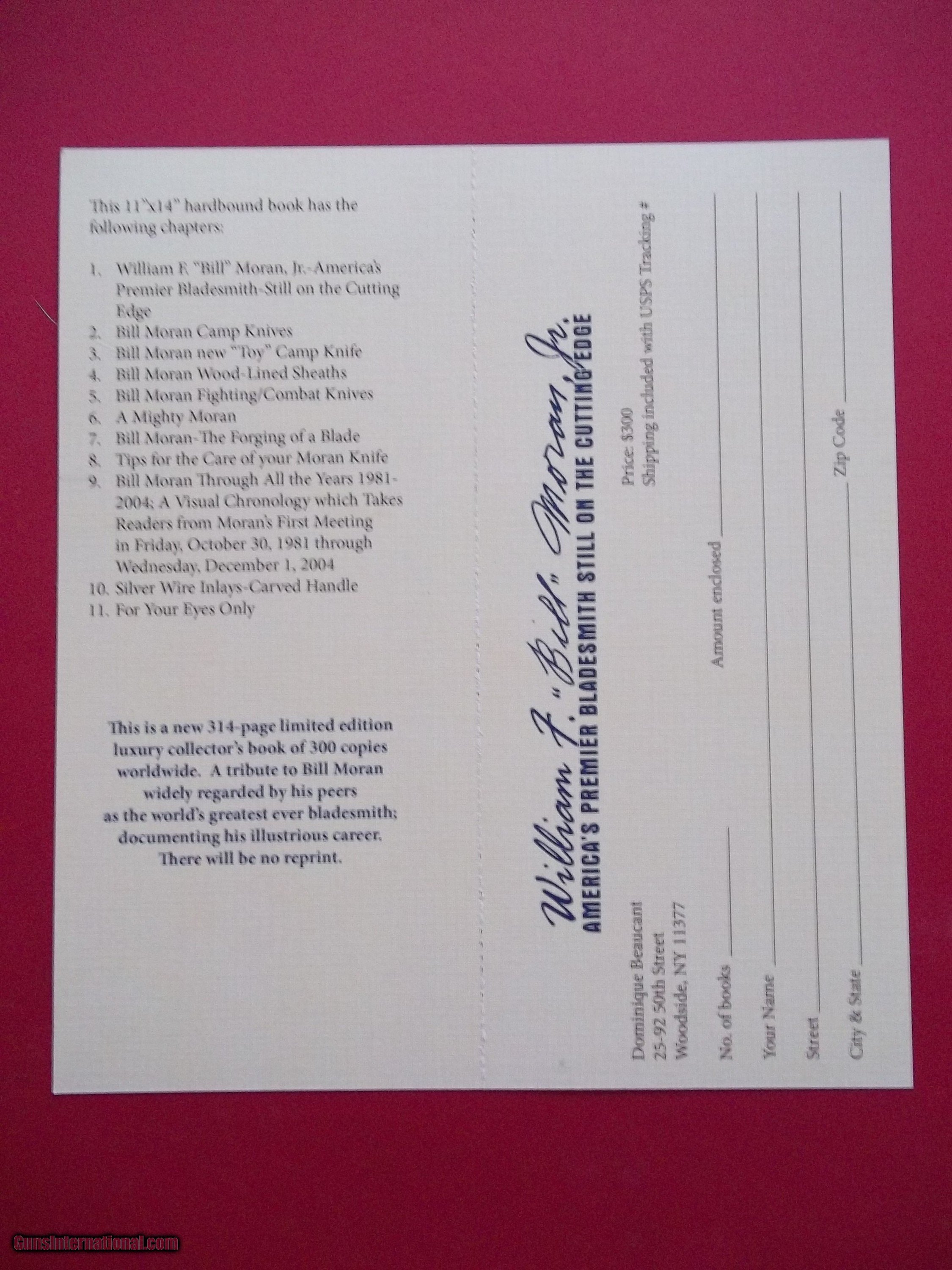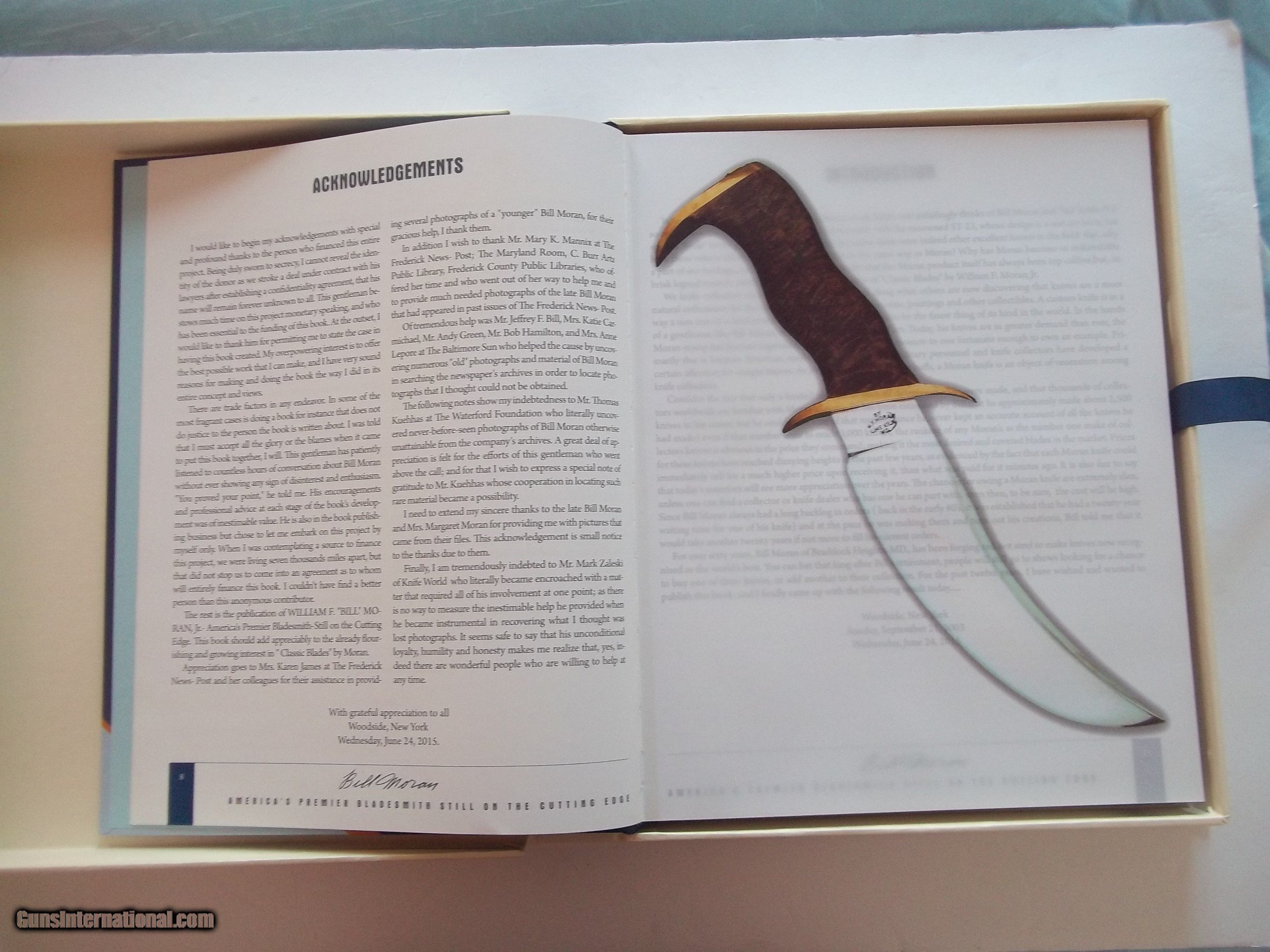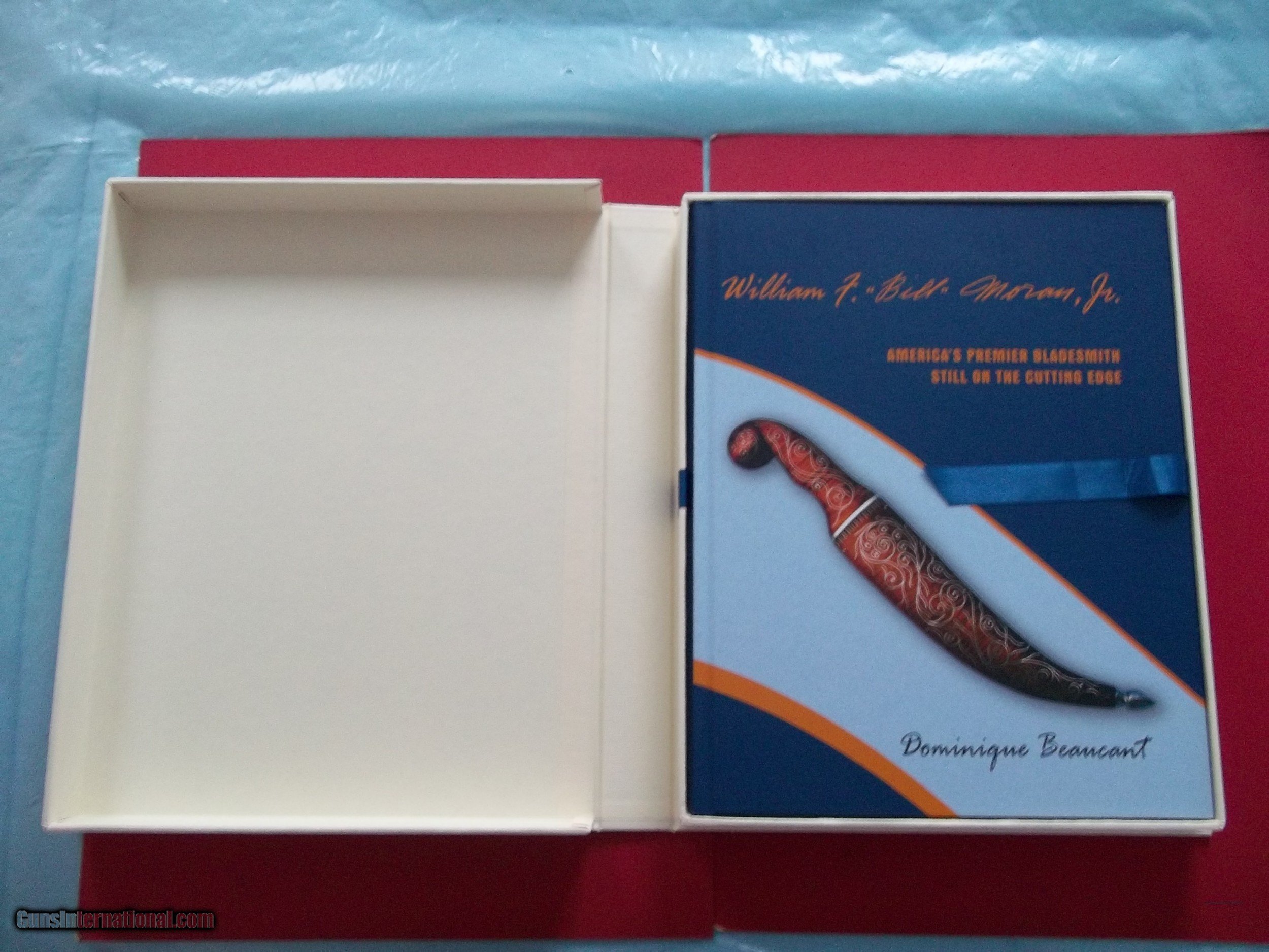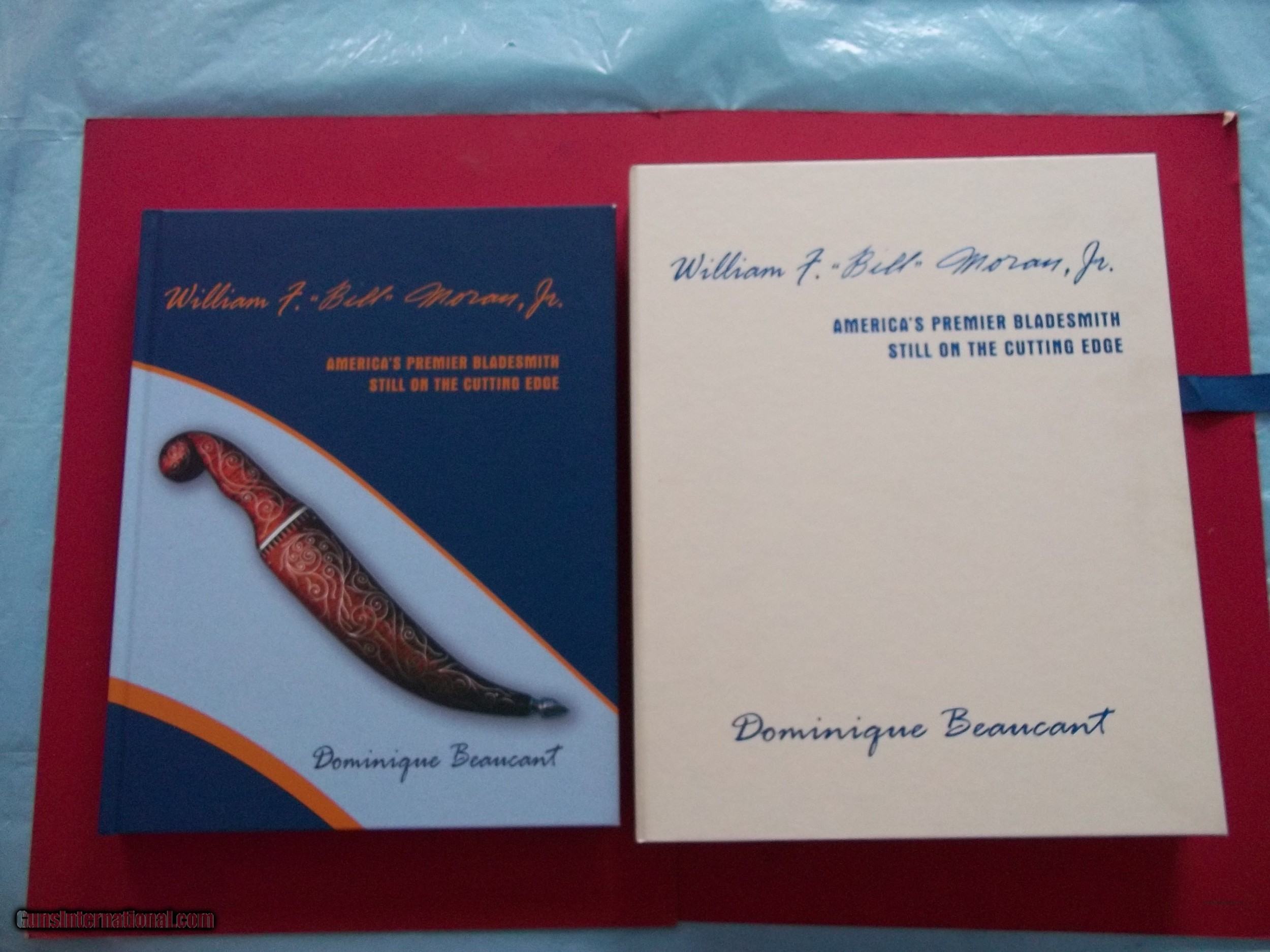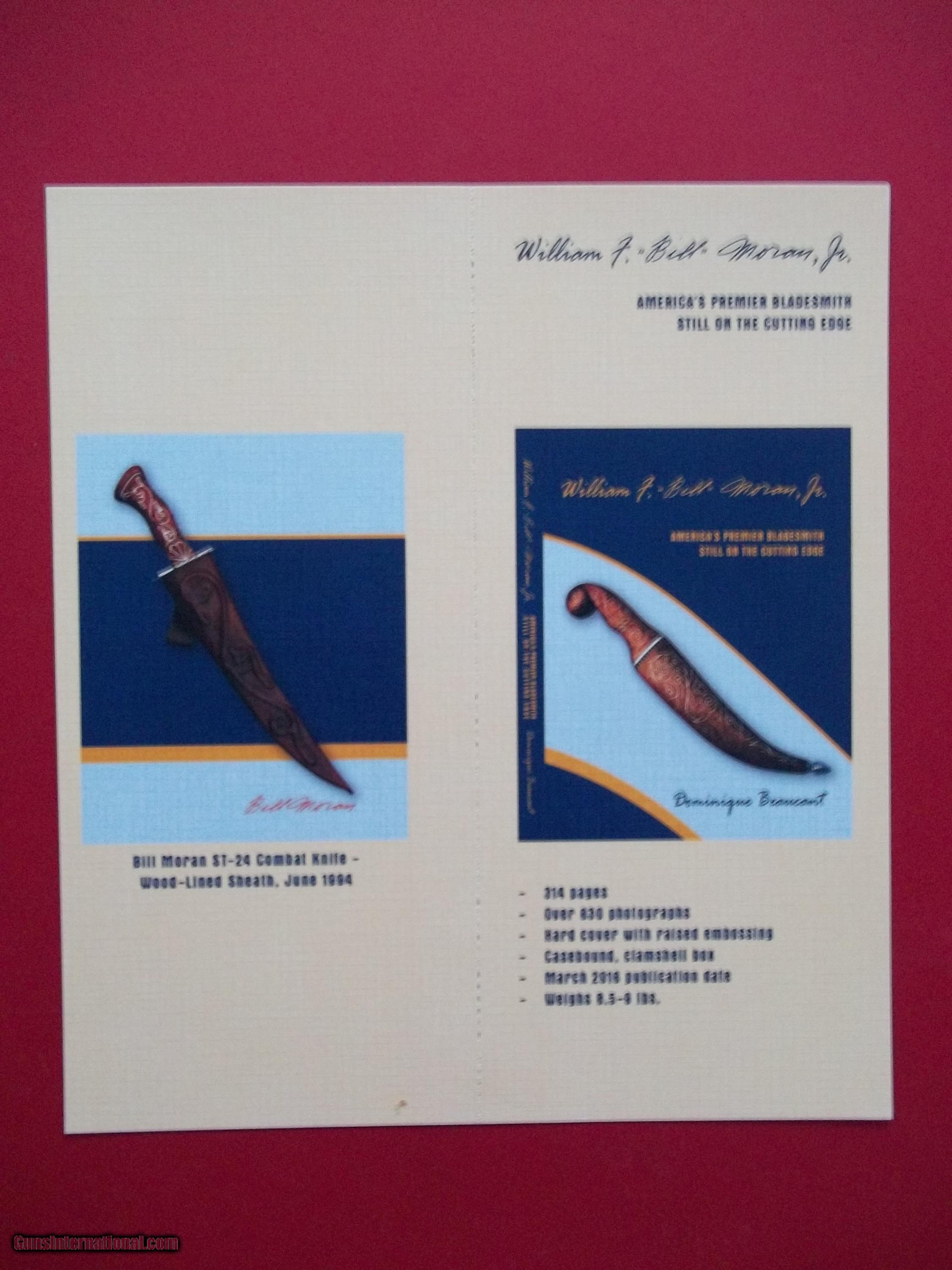 New luxury collector's book : William F. "Bill" Moran, Jr. America's Premier Bladesmith-Still On The Cutting Edge, to pay tribute to the legendary Maryland blacksmith, widely regarded by his peers as the world's greatest ever bladesmith. Only 300 copies are being printed, (there will be no reprint) of the hefty tome that contains 314 pages, which is a historical and graphical account of his illustrious career that included text, countless never-before-seen photographs (over 630 in all) and most recently uncovered important facts and information on the life and times of Bill Moran. Offered with a raised embossed front cover, case bound deluxe full clamshell box, with 150 Pts. cover, 120 Pts, side walls, 43 lbs. translucent Vellum sheet with imprint on it, (see picture # 12) . The books weighs over 10 lbs.12.8 oz. The book's main title is taken from Bill Moran own original handwriting, while the back cover is Bill's own original signature. This 11" X 14 " hardbound book has 11 chapters. Clamshell box is two ( 2) inches high, with high-gloss Rainbow 3 sky blue 3-D foil stamping on main title, sub title and author's name ( same on book's spine). Thank you for looking. USPS shipping included with tracking number. NOTE: When ordering it, please advise if you wish to have your copy personalized and signed, otherwise book will bear no signature or autograph since it comes in its original shrink wrap from the printer. Book weighs over ten (10) lbs.