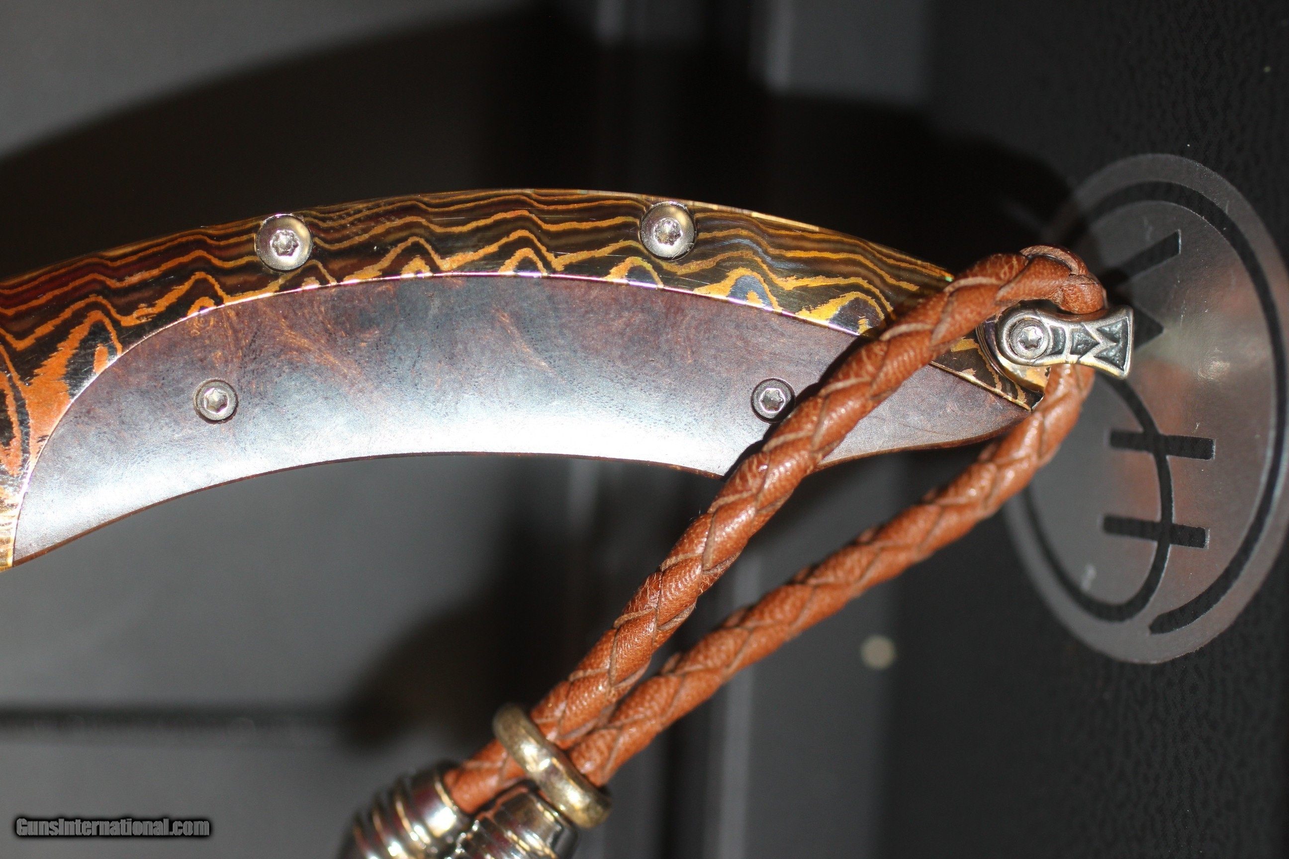 Description: PERSIAN SNAKE RIVER B11 SNAKE RIVER The Persian 'Snake River' features a beautiful frame in William Henry's signature (and patent pending) 'Wave' Mokume, inlaid with a scale in desert ironwood. The blade is 'Copper Wave' Damascus steel with an extra sharp core in VG-5 steel. The one-hand button lock and the thumb stud are set with white topaz gemstones. The Persian is an elegant synthesis of dramatic lines, graceful curves, and exquisite materials. A bold interpretation of a timeless design, the 'Snake River,' features some of the most exotic materials and hand-forged metals that are the hallmark of William Henry's collections, a timeless heirloom proudly worn and used for a lifetime before being handed-down to another generation. SOLD |