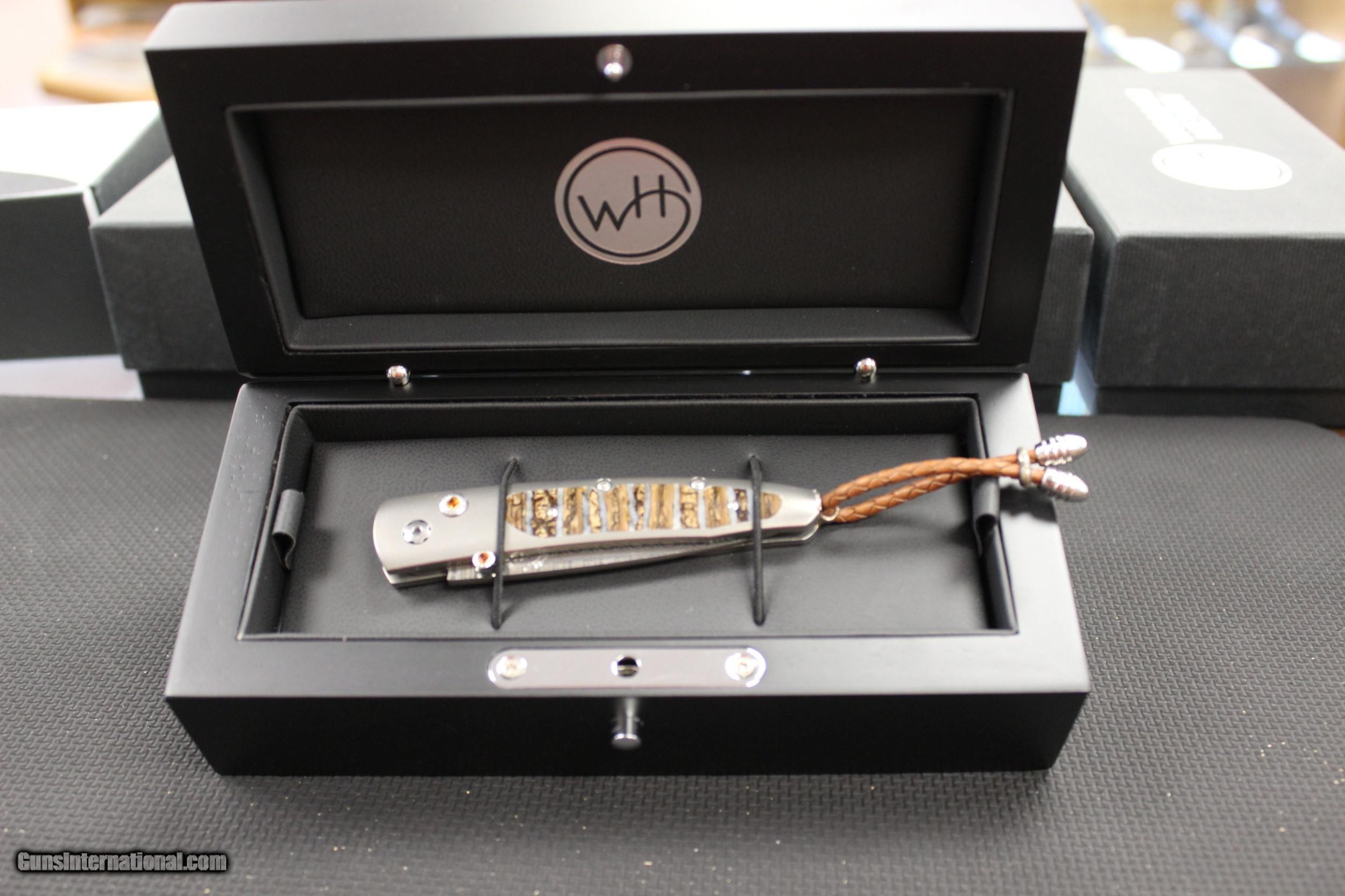 Description: LANCET REVERSO B10 REVERSO The Lancet' Reverso' features a frame in aerospace-grade titanium, inlaid with a piece of 10,000-year-old fossil Woolly Mammoth tooth. The blade is 'Wave' Damascus with ZDP-189 core; the one-hand button lock and the thumb stud are set with citrine gemstones. Sleek, elegant, refined, and comfortable in hand and to the eye, the Lancet defines the essential gentleman's folder in the modern world. The 'Reverso' features some of the exotic materials and hand-forged metals that are the hallmark of William Henry's collections, a distinctive personality statement to be worn and used for a lifetime. SOLD |