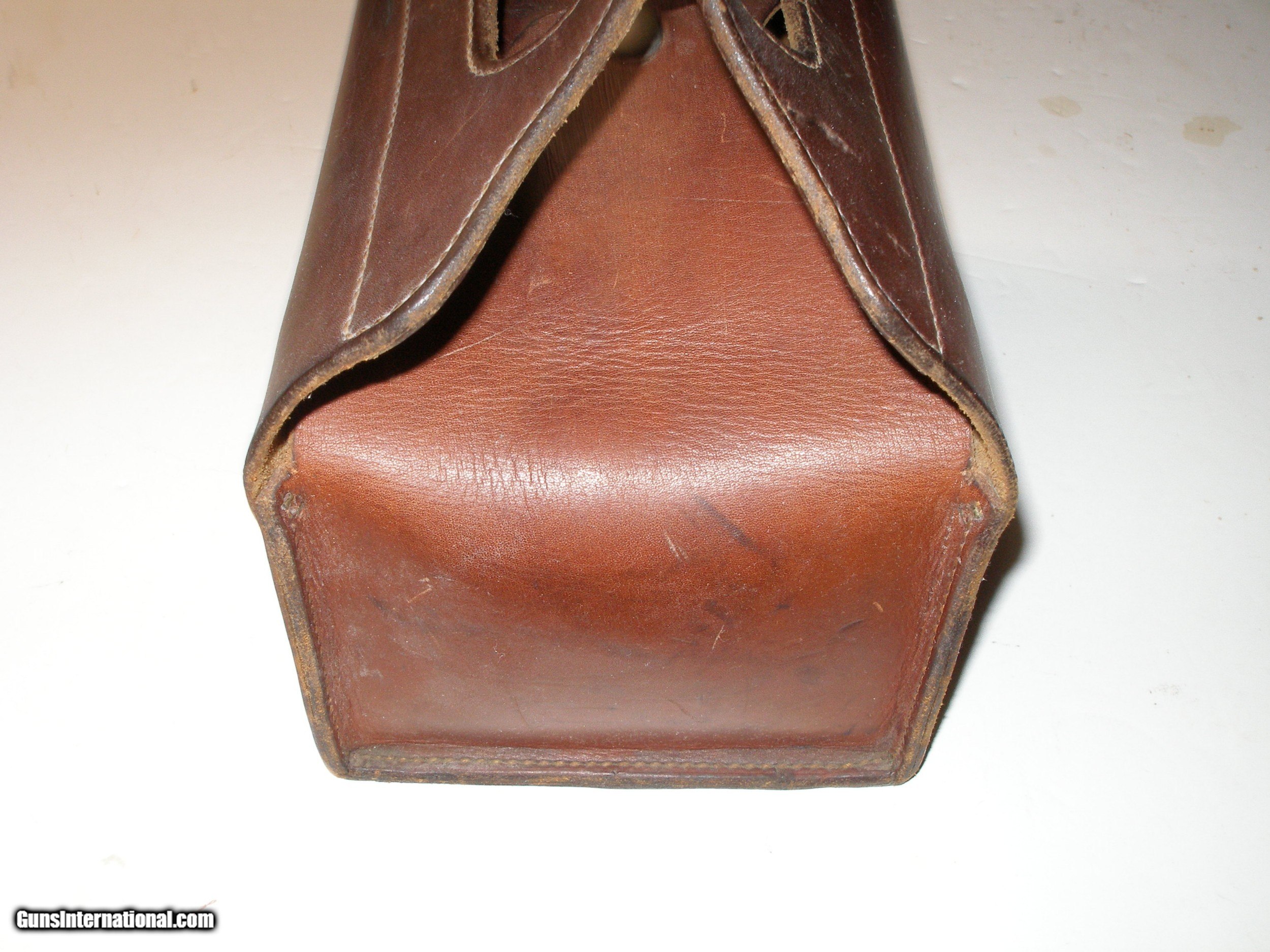 Description: Just a fine leather carrying case to go with that classic shotgun,or.,rifle. Very high quality and good for another 50 years if taken care of. There is wear,but not bad, just some care and leather conditioner will do wonders.Measurements are 9 1/8 " W x about 10 " H with handles closed,6 " on narrow end.On inside 4 1/2 " deep X 8 3/8 "W ,and 5 1/2 " the last way. A nice example of fine leather work ! SOLD |