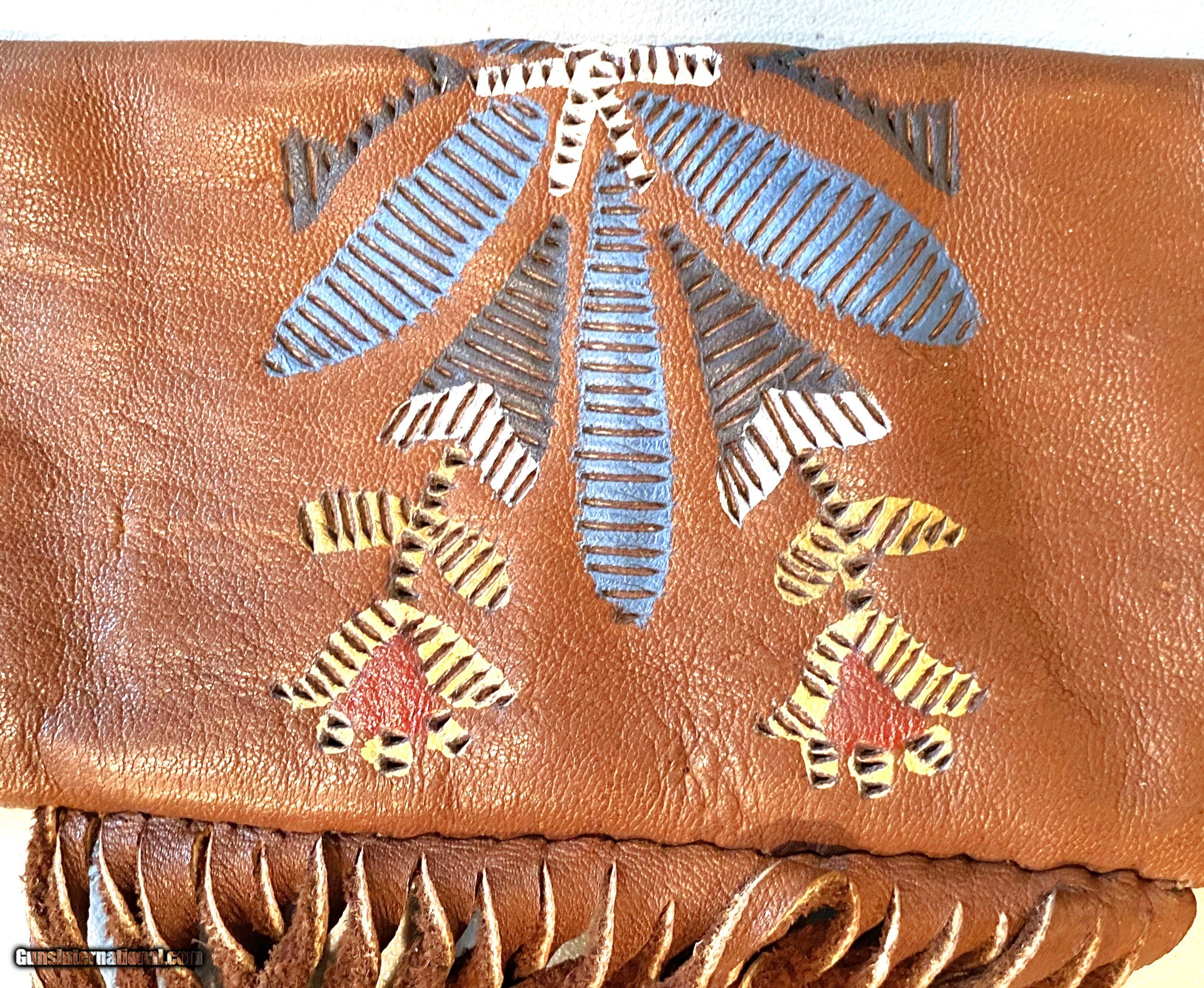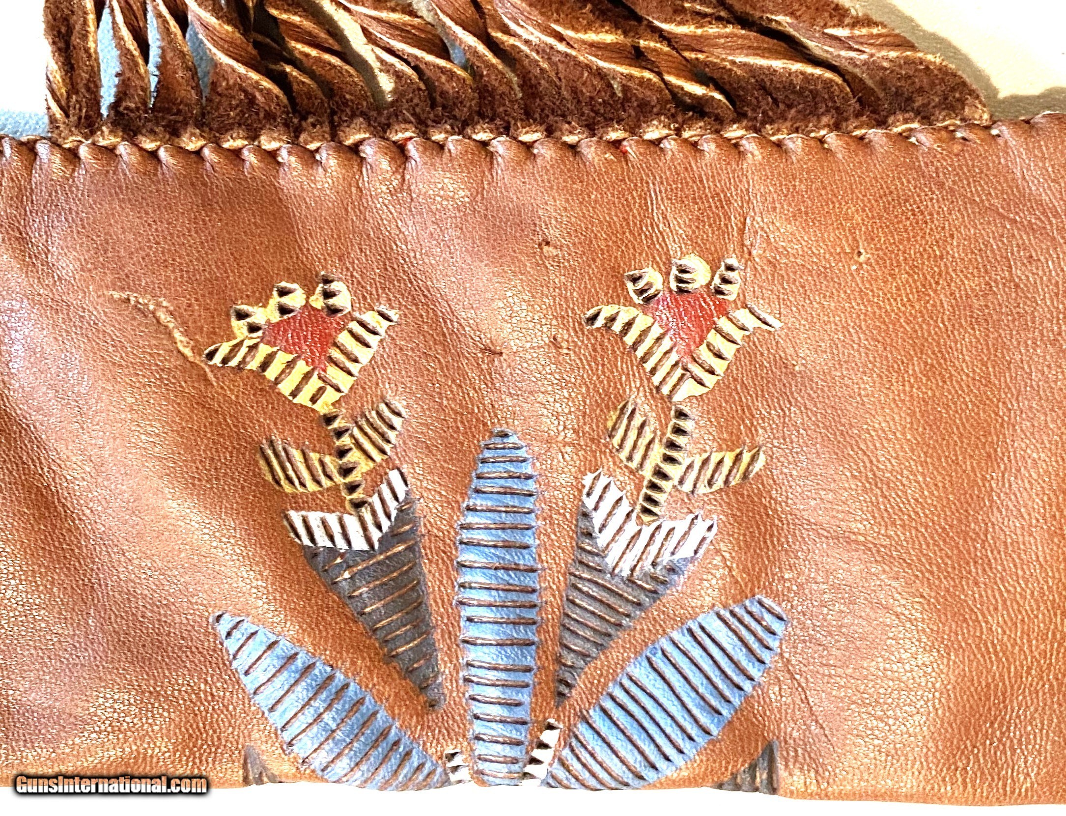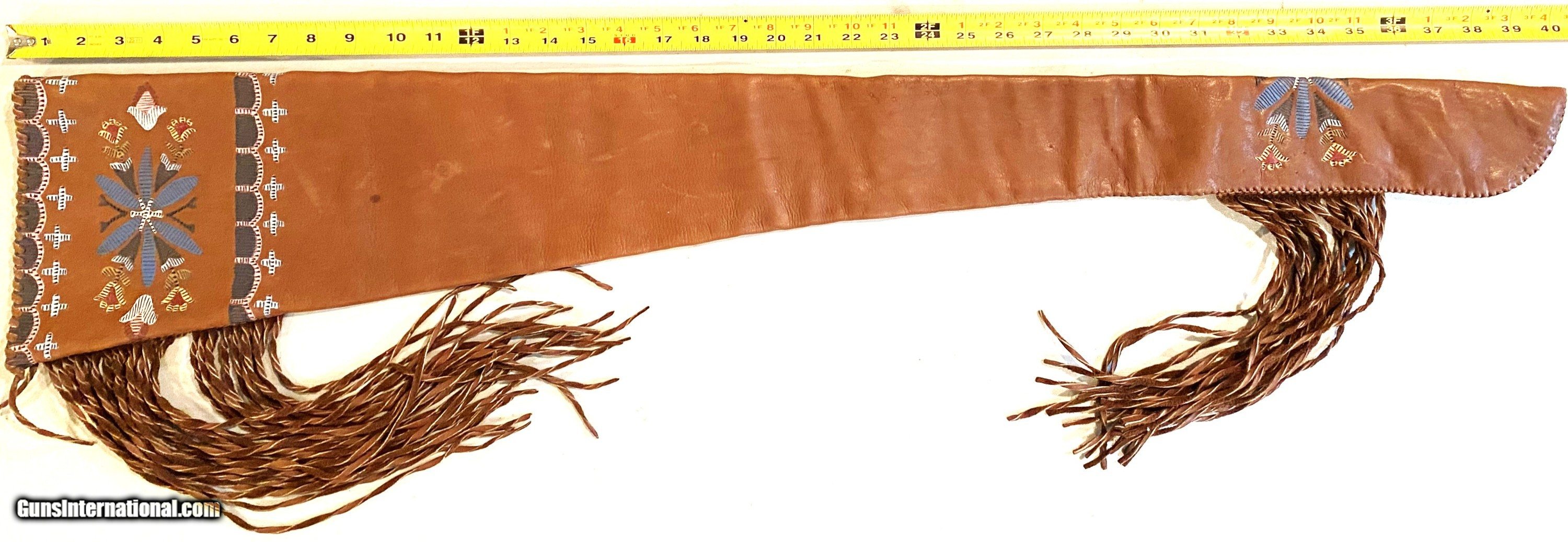 Description: This fine piece is from a lifetime of collecting by a private collector. ***** SOLD ******Deerskin leather gun sleeve, custom made by Blue Sky Company who made Cowboy Action Shooting Accessories. Genuine leather fringe. Lined with heavy ribbed felt. Hand painted and burned to resemble bead work. Extremely soft and supple. The sleeve measures 40-1/4" X 8-1/4". SOLD |