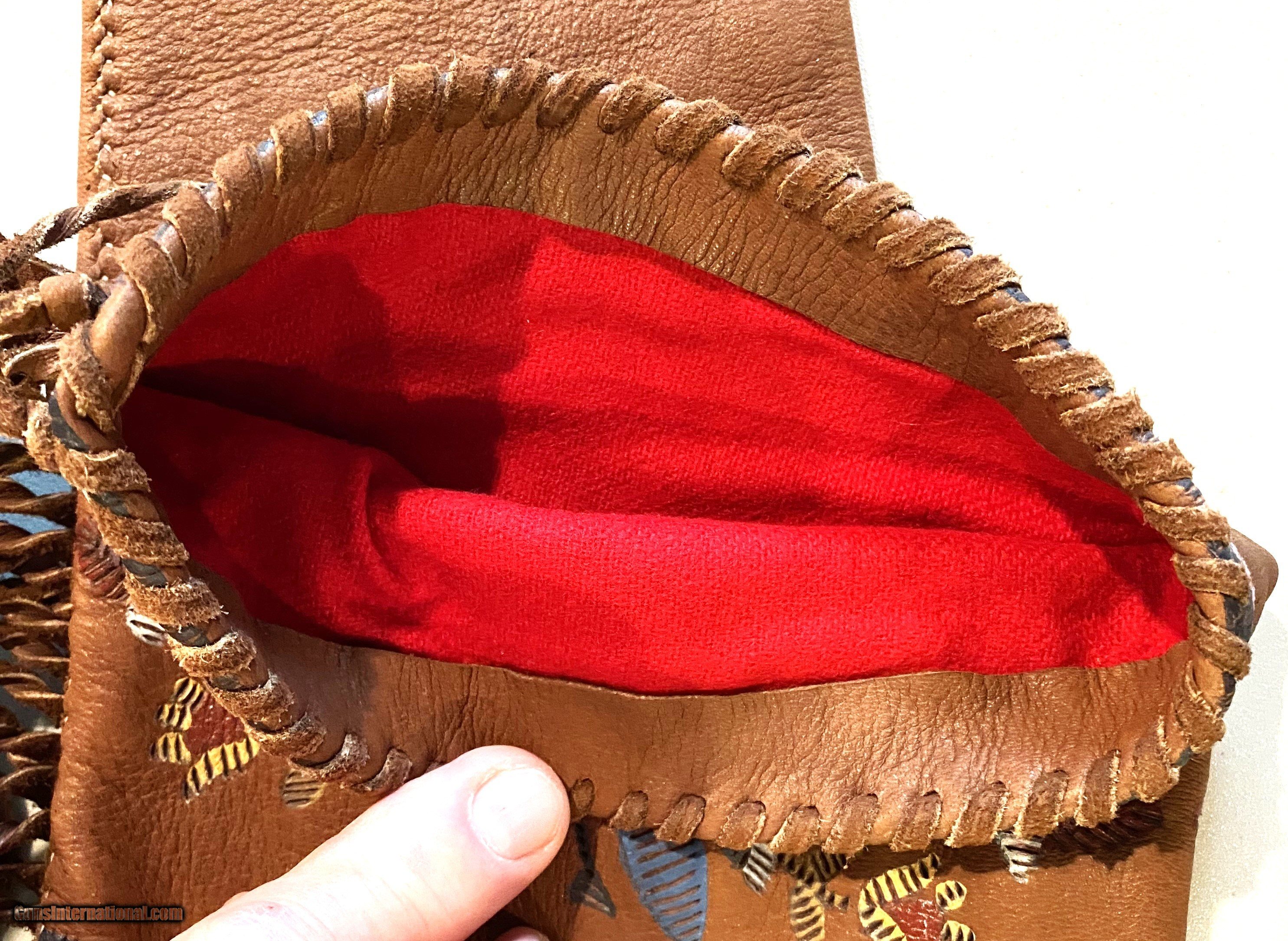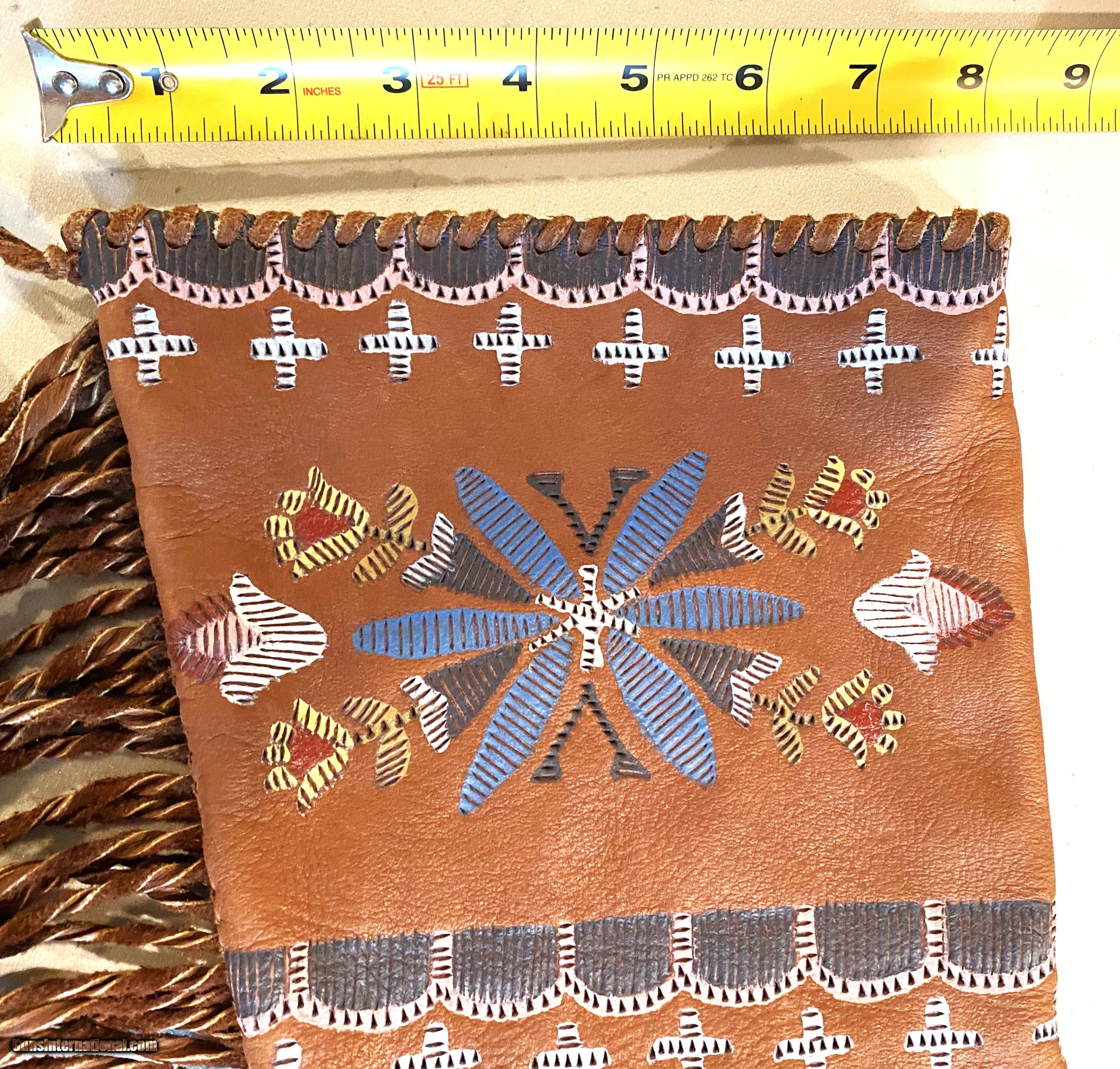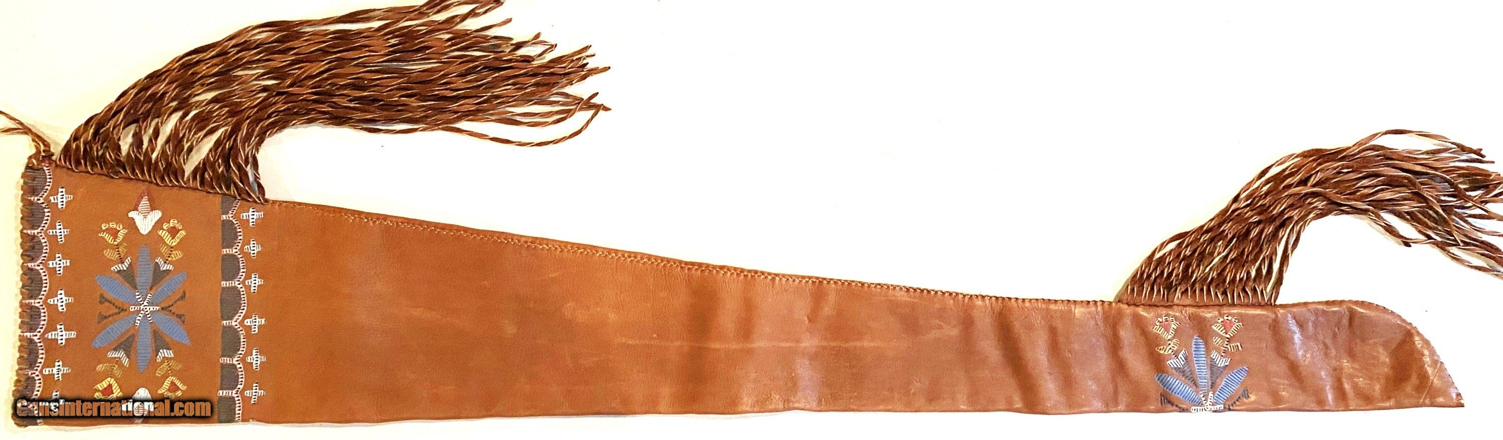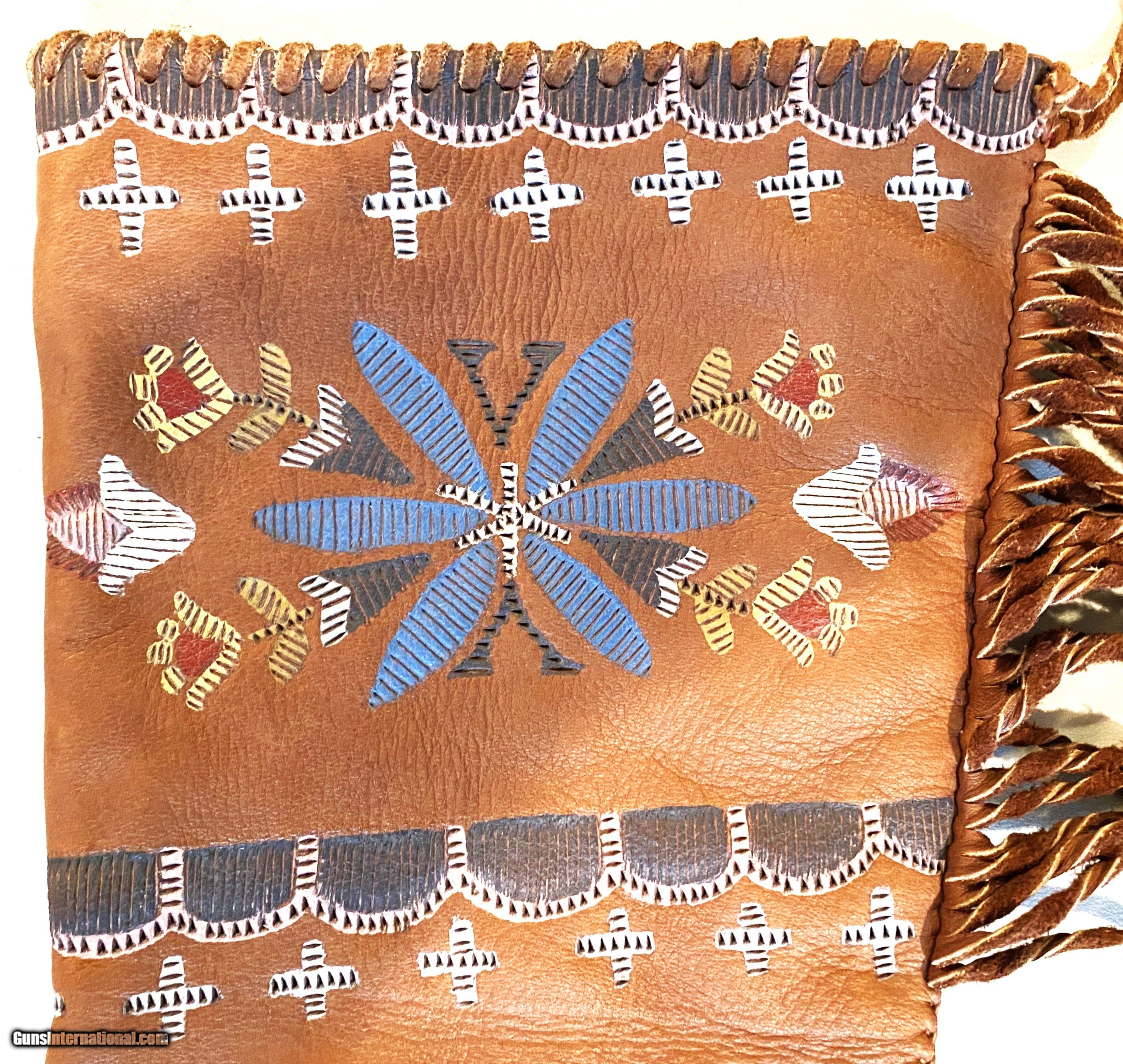 Description: This fine piece is from a lifetime of collecting by a private collector. ***** SOLD ******Deerskin leather gun sleeve, custom made by Blue Sky Company who made Cowboy Action Shooting Accessories. Genuine leather fringe. Lined with heavy ribbed felt. Hand painted and burned to resemble bead work. Extremely soft and supple. The sleeve measures 40-1/4" X 8-1/4". SOLD |