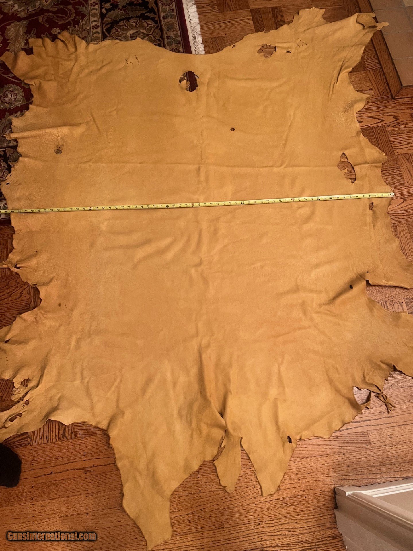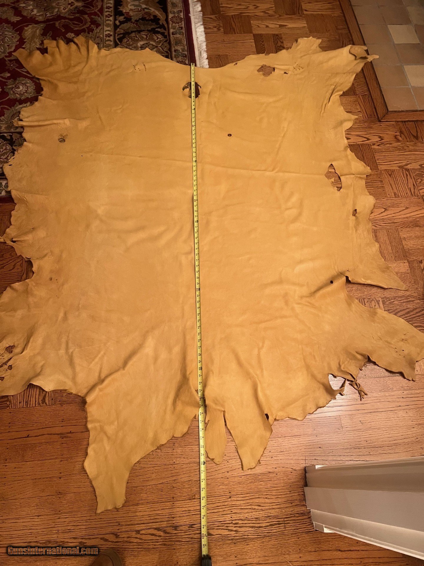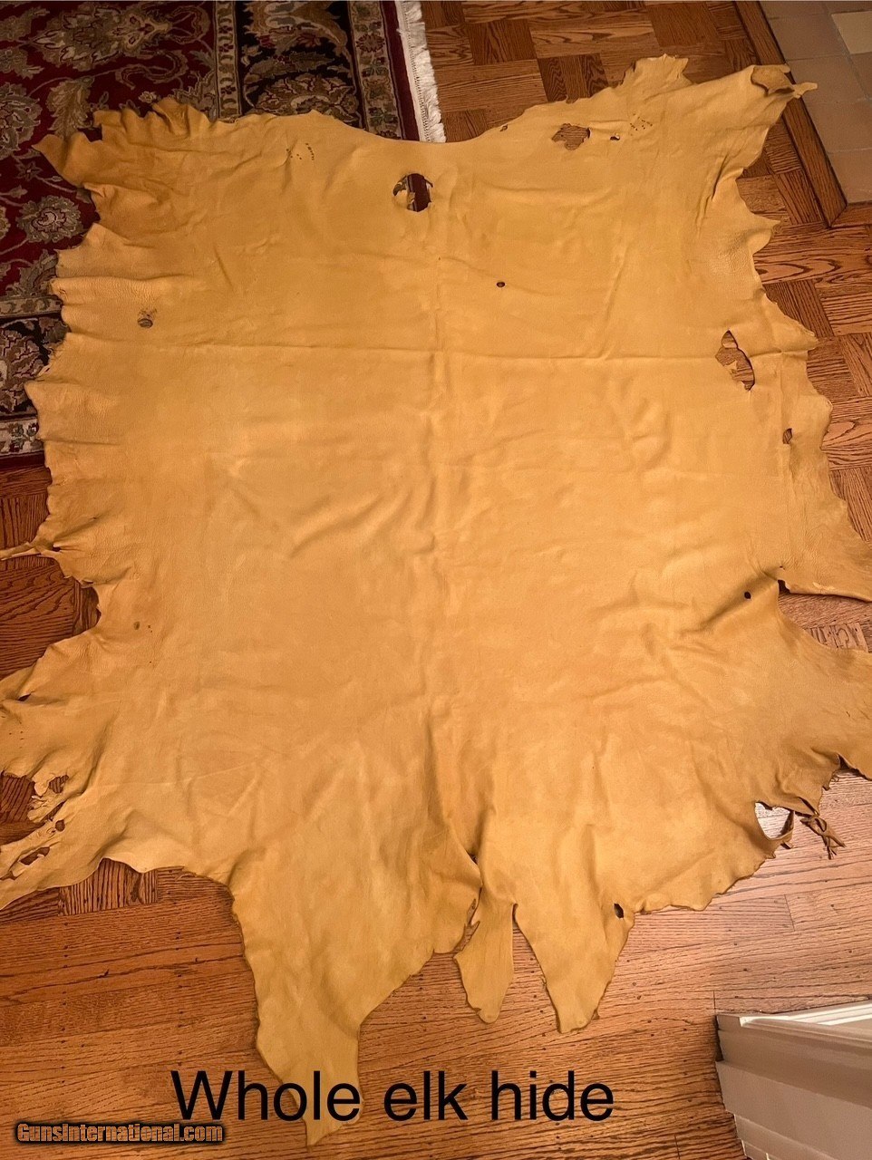 Description: Brain tanned full grain whole bull elk hide. The hide is soft and supple and is from a mature bull elk I killed in 1974. In 1974 it was professionally brain tanned and it has been in my indoor closet since 1974. It has no oder and has retained its original gold color. The total weight of the hide is 5 lbs. Based on its gross size of 30 sq ft, which includes the irregular edge and holes shown in the pictures, the average weight per square foot is 3.2 oz. The thickness is 1.8 to 2 mm ( 1/16 + inches). This hide its strong enough to make chaps, vests, jackets, bags, etc. The useable square feet would depend on how you intend to use the hide. Not in the hide business. Just downsizing. SOLD |