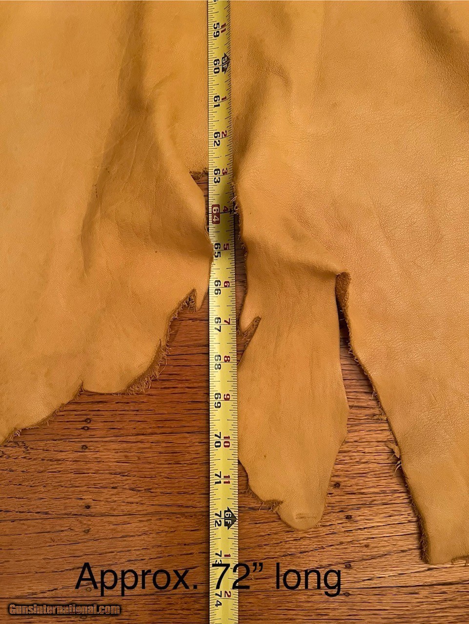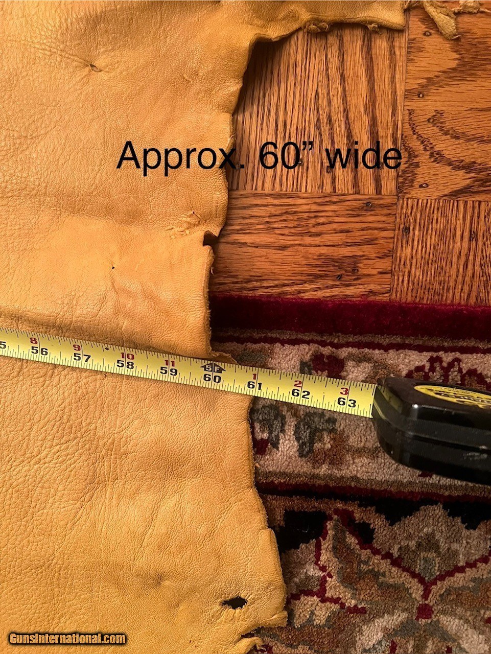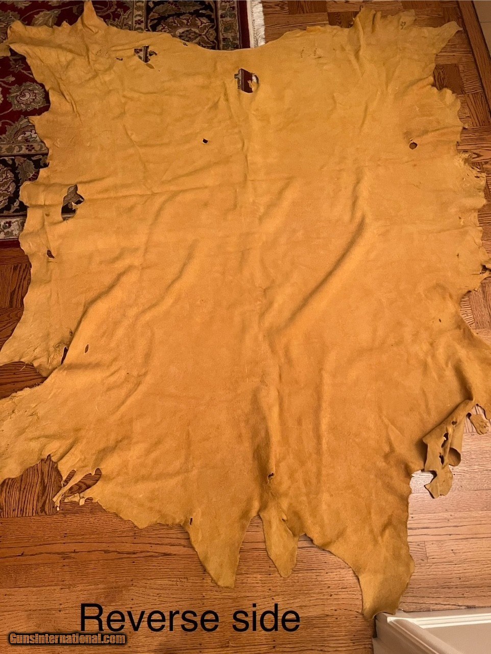 Description: Brain tanned full grain whole bull elk hide. The hide is soft and supple and is from a mature bull elk I killed in 1974. In 1974 it was professionally brain tanned and it has been in my indoor closet since 1974. It has no oder and has retained its original gold color. The total weight of the hide is 5 lbs. Based on its gross size of 30 sq ft, which includes the irregular edge and holes shown in the pictures, the average weight per square foot is 3.2 oz. The thickness is 1.8 to 2 mm ( 1/16 + inches). This hide its strong enough to make chaps, vests, jackets, bags, etc. The useable square feet would depend on how you intend to use the hide. Not in the hide business. Just downsizing. SOLD |